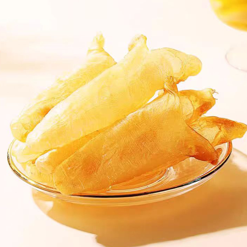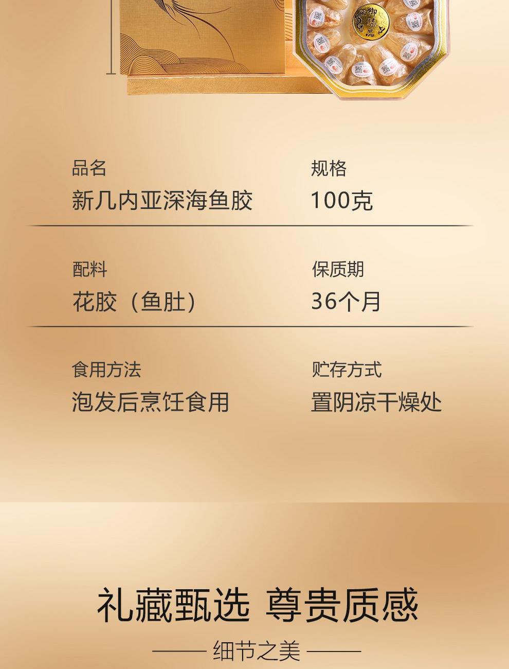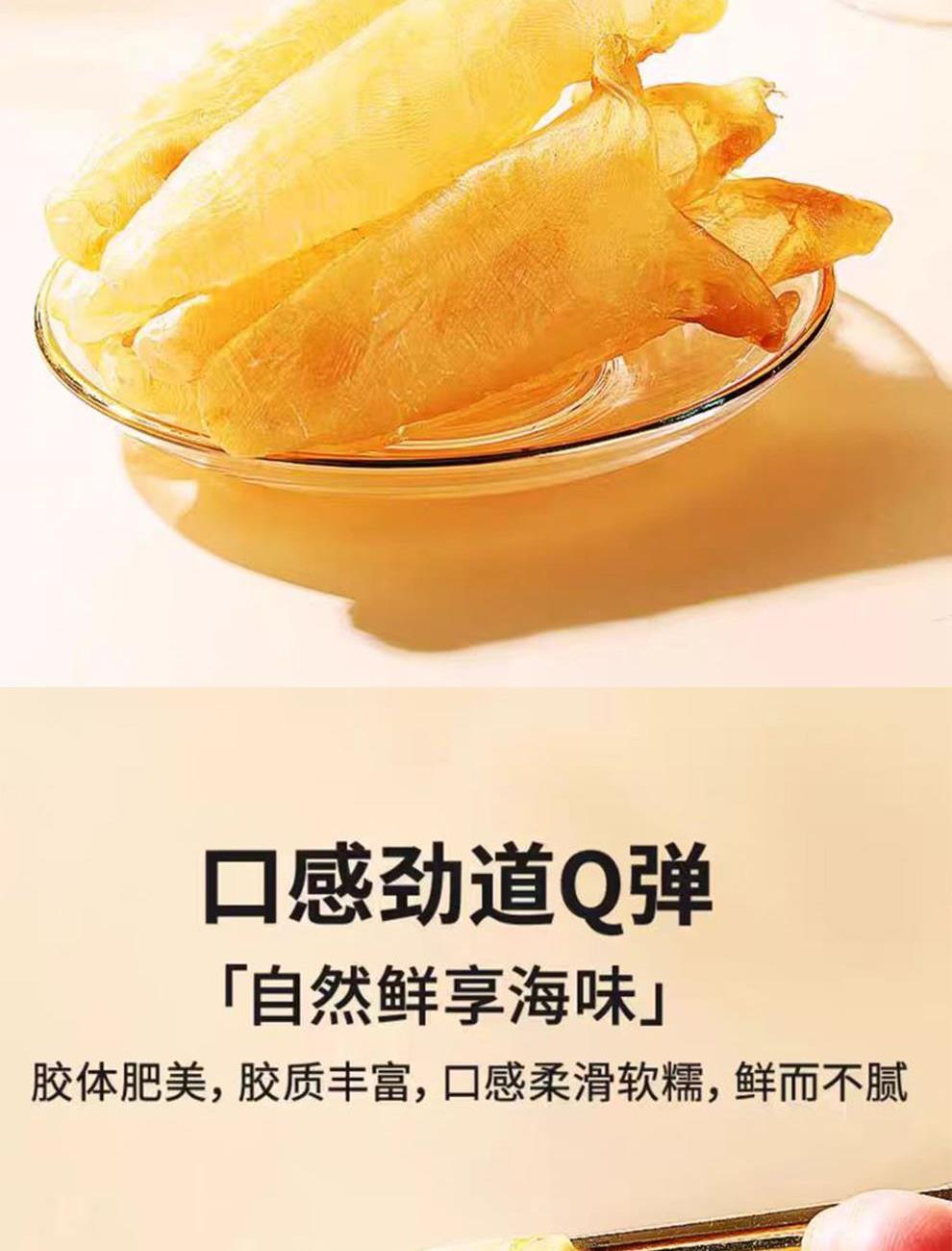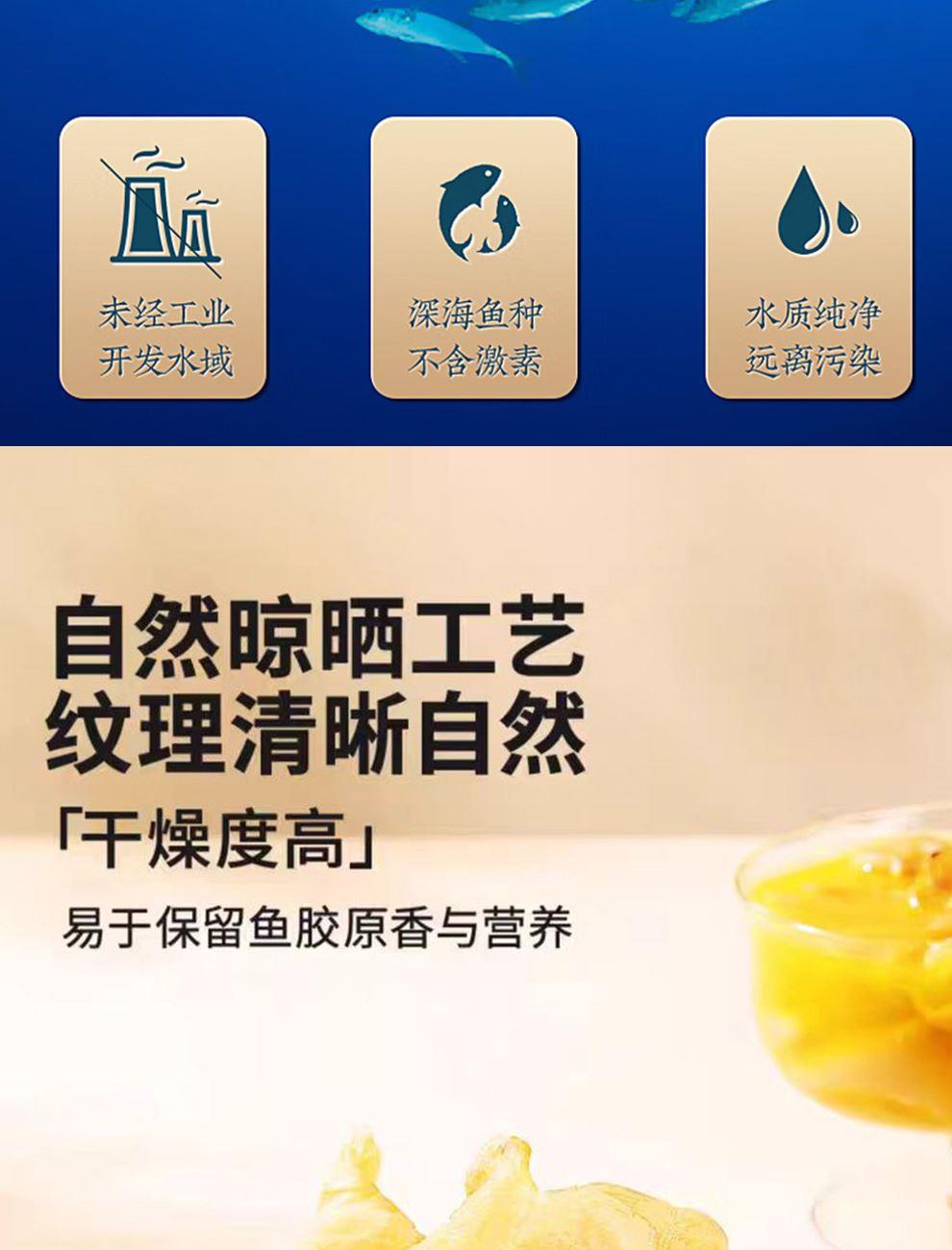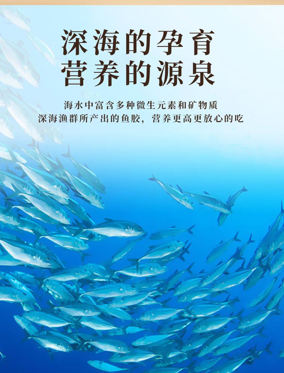规格:100克 卖点: - 纯净深海环境:来自新几内亚附近深海,那里海域相对未受污染,水质洁净。深海的低温、高压环境使得生活在其中的鱼类生长缓慢,鱼胶的质地往往更加紧实、营养成分积累也更丰富。