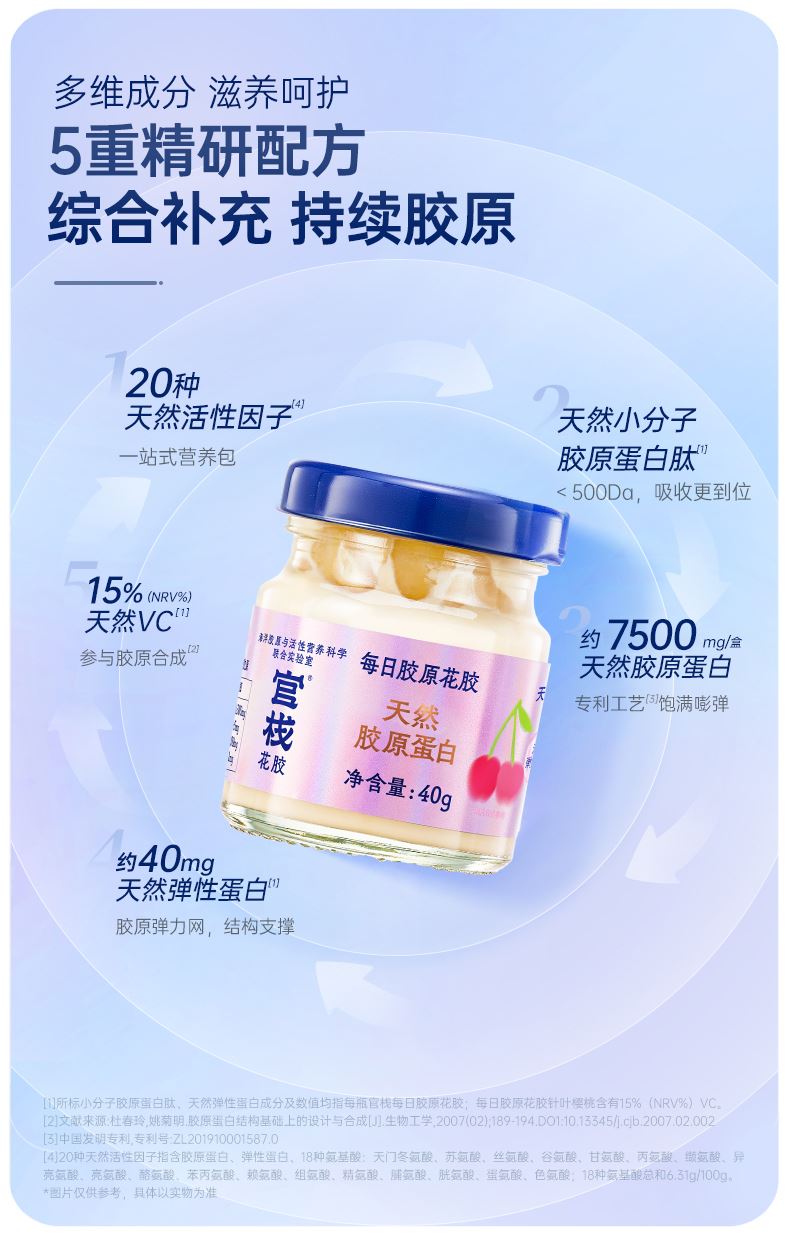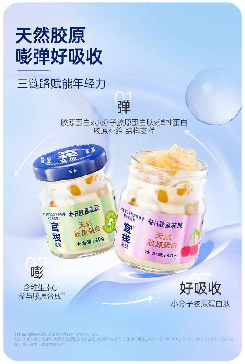 天然胶原蛋白×弹性蛋白肽×透明质酸钠,升级三维配方* 【胶原升级】天然小分子胶原肽<1000Da,营养好吸收 【配方升级】新增樱桃奇异果配方,高能VC加持 【适宜场景】加班压力大、熬夜通宵后、日常滋养