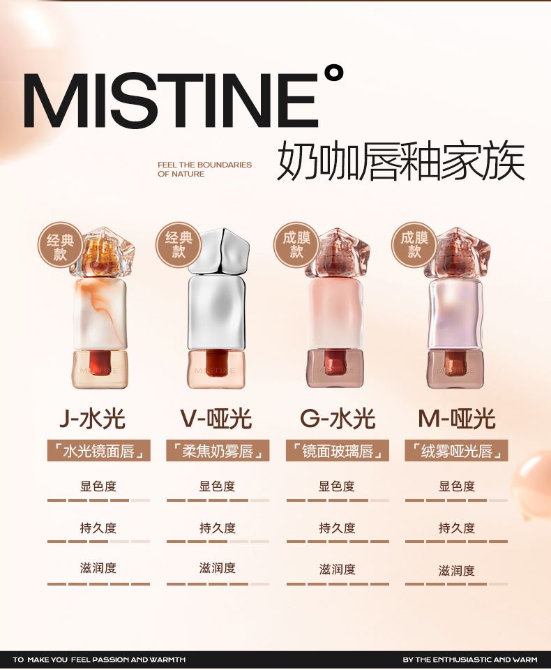 2大妆效: 霜转轻雾、水光嘟嘟 1)霜转雾面款带来丝滑绒绒触感,同时轻薄柔焦,持色不拔干: 01 一抿霜转雾,越抿越滑 • 触唇由霜转雾,一抿激活柔焦粒子,雾感弥漫 • 「熔岩奶咖」般绵密丝滑 02 越抿越润,不拔干不卡纹 • 外哑内润,抚平唇纹 • 玻尿酸入妆,干唇友好 04 融入泰妆精髓 专研低饱和奶咖色系 • 比口棕更显白嫩,比红调更提气色 2)水光款平衡水光唇釉的黏腻感和嘟嘟唇妆效: 01 1%丰唇肽入妆,一抿冻感亮嘟嘟 • 精华凝冻成膜,不粘不腻不拉丝 • 足量添加1%丰唇肽,立显饱满嘟嘟 02 三重奢养精华油,8H持续水嘟嘟 • 持续养护双唇,卸妆后依然软软嫩嫩 03 清透高遮盖,深唇也能嫩嘟嘟 • 专研高显色配方,薄涂即可高覆盖 • 一抹即卸不染唇 04 融入泰妆精髓 专研奶咖色系 • 比口棕更显白嫩,比红调更提气色