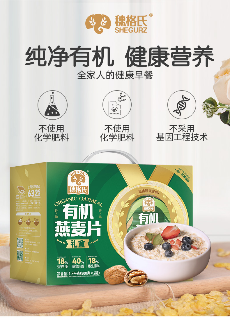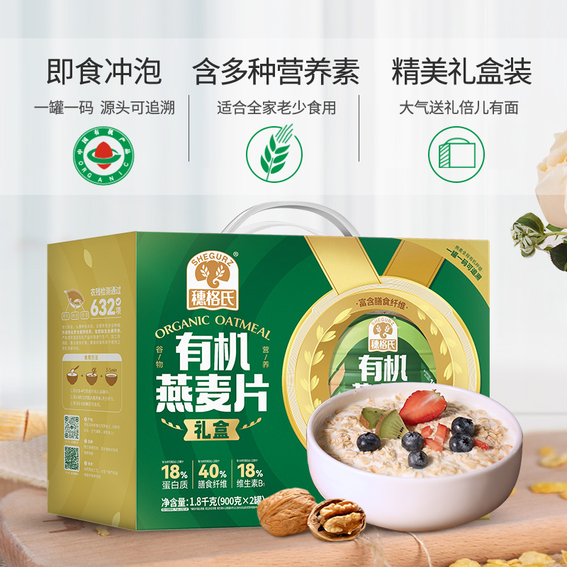 穗格氏有机燕麦礼盒1.8kg 配料表:有机燕麦片 产品卖点: 1,一罐一码 全程有机可追溯; 2,穗格氏专属有机种植基地,张家口市农业科学院育成品种“坝莜一号”; 3,高膳食纤维,含有蛋白质,无添加蔗糖,含维生素B1; 4,通过632项农残检测; 5,适合青少年,上班族,宝妈,中老年人的有机新生活。 6,精美年货礼盒。