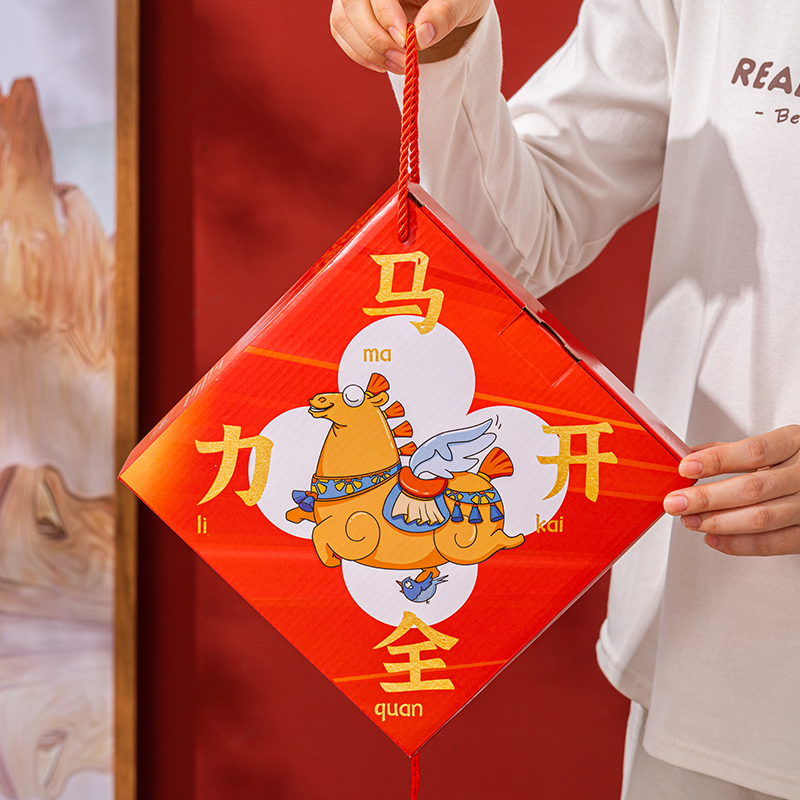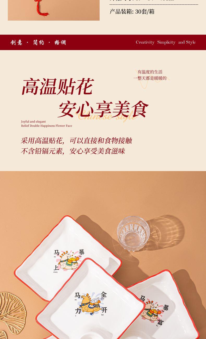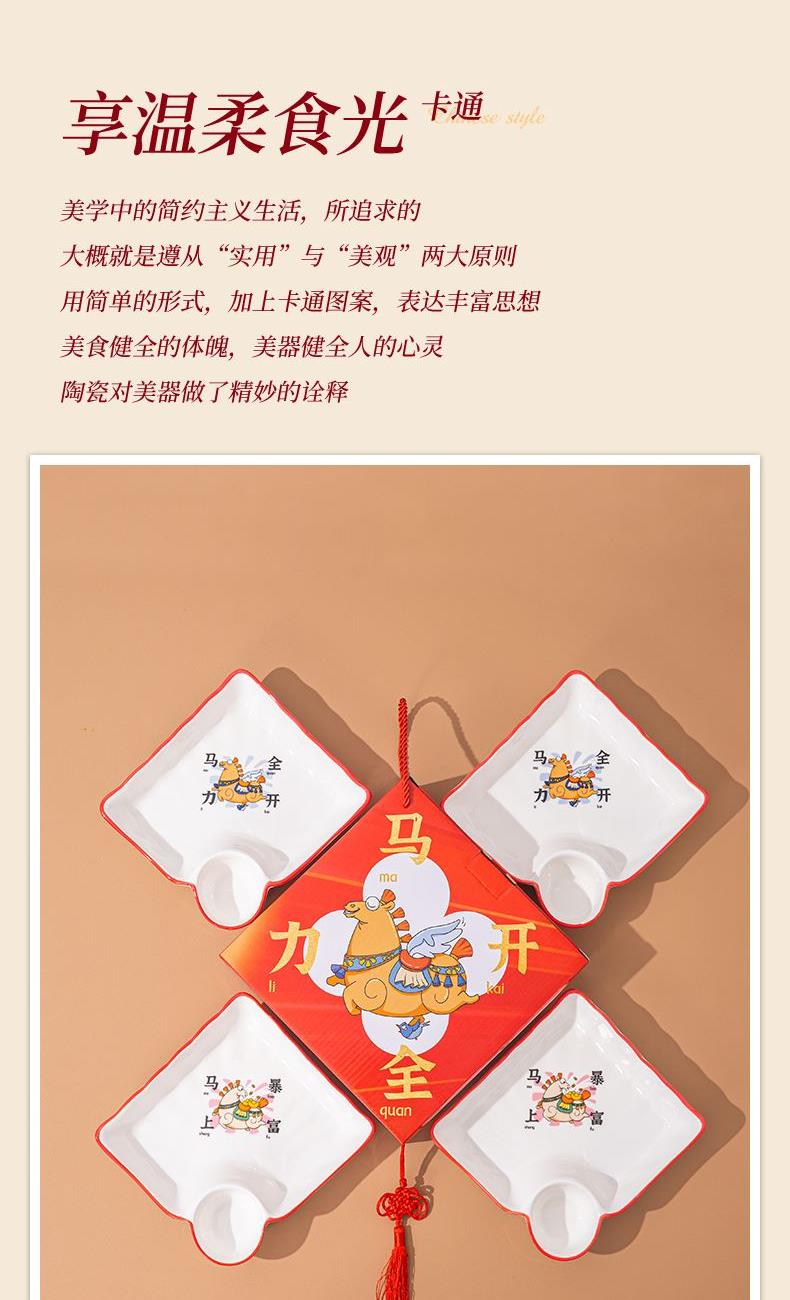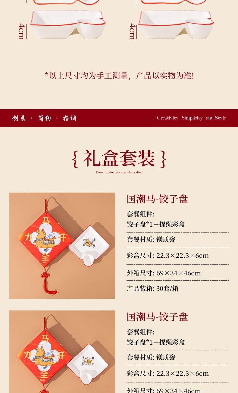 产品组成:整套=1饺子盘+提绳彩盒 产品材质:镁质瓷 产品规格:宽17.5*长19cm,高度4cm; 彩盒尺寸:22.3×22.3×6 cm 整箱毛重:23kg 外箱尺寸:69×34×46cm ------------------- “活力十足+财运满满”双buff叠满的礼品套装! 「翼马踏燕」纹样灵动鲜活,仿佛骏马振翅带风,踏出满室生机;不是老气的纹样,反而有点卡通新国风那味儿,摆桌上直接拉满视觉张力;让人新的一年活力十足,马力全开。 「元宝驮马」图案精致讨喜,圆润金元宝衬着矫健骏马,一眼见财气。马上驮的金元宝更绝,画得圆滚滚还带点小俏皮,像刚从“财富星球”运回来的,看着就超有范。