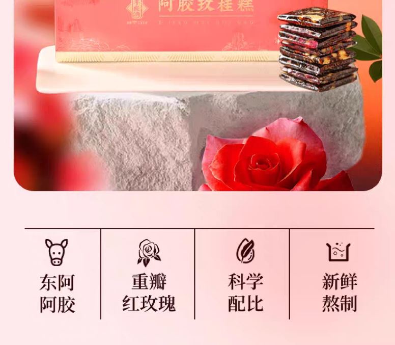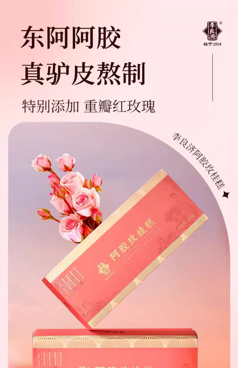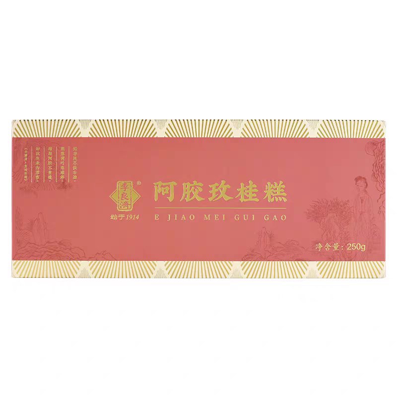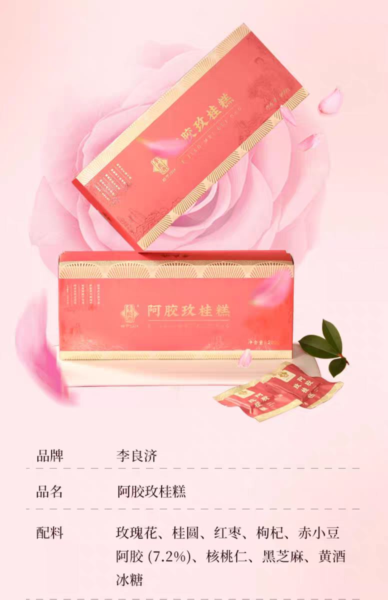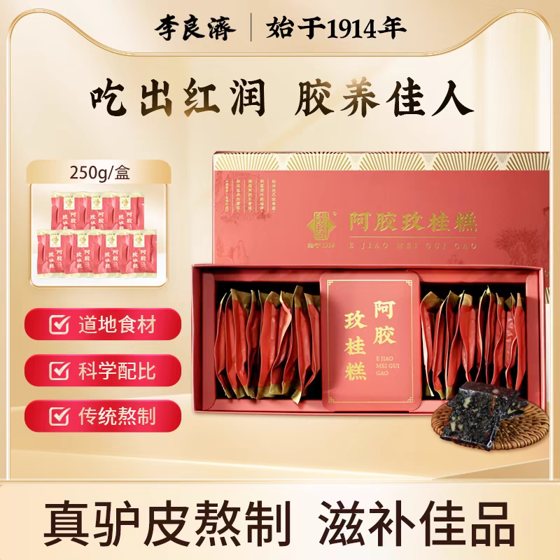 产品:李良济阿胶玫桂糕 规格:250克 贮藏方法:阴凉干燥通风处存放,防潮,防异味 配料表:阿胶、枸杞等 独立包装,开袋即食 甄选材料,科学配比 精致包装,送礼佳选