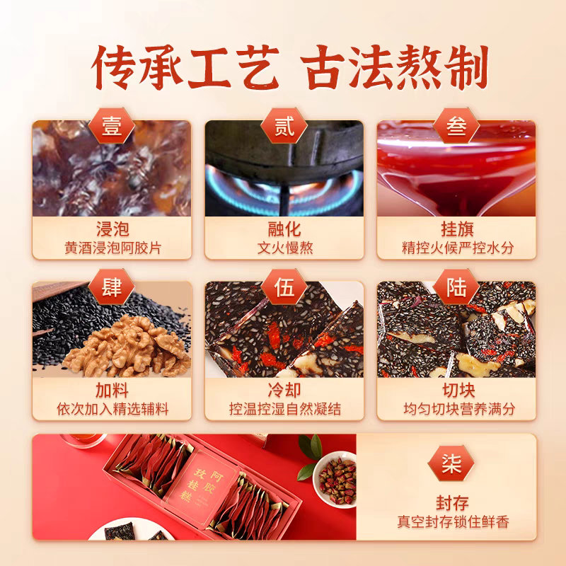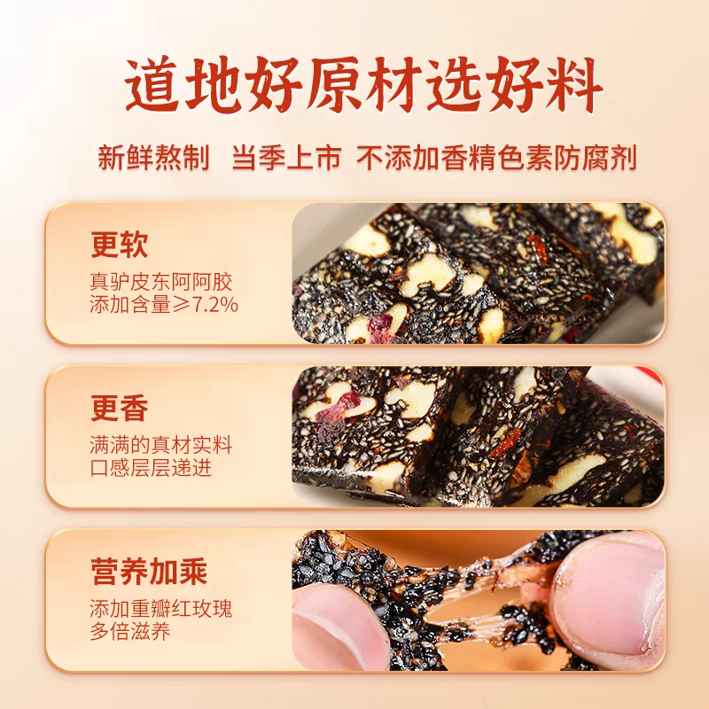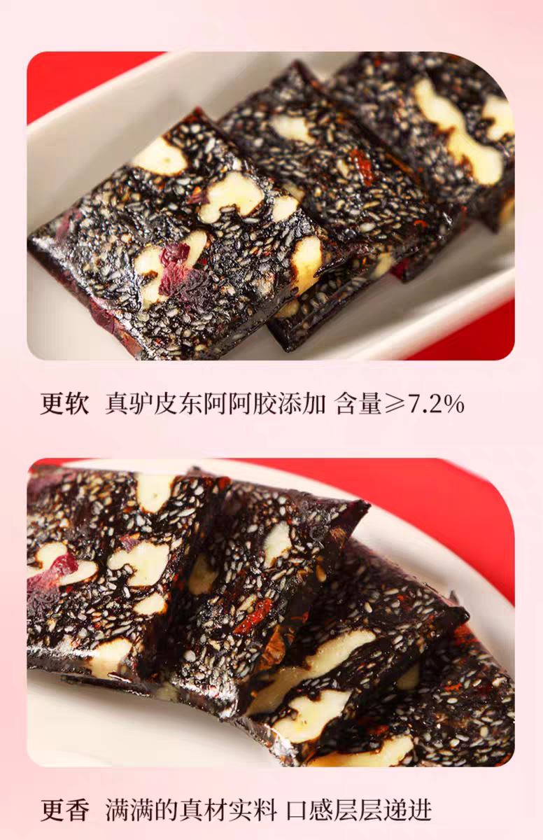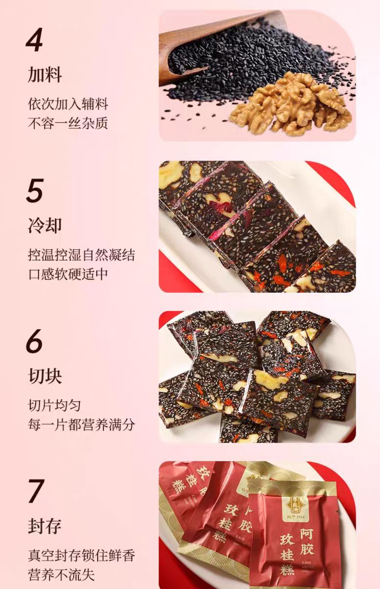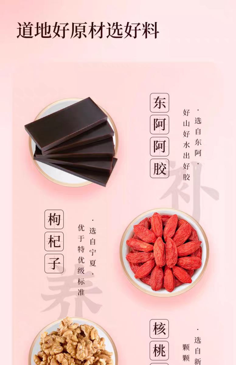 产品:李良济阿胶玫桂糕 规格:250克 贮藏方法:阴凉干燥通风处存放,防潮,防异味 配料表:阿胶、枸杞等 独立包装,开袋即食 甄选材料,科学配比 精致包装,送礼佳选