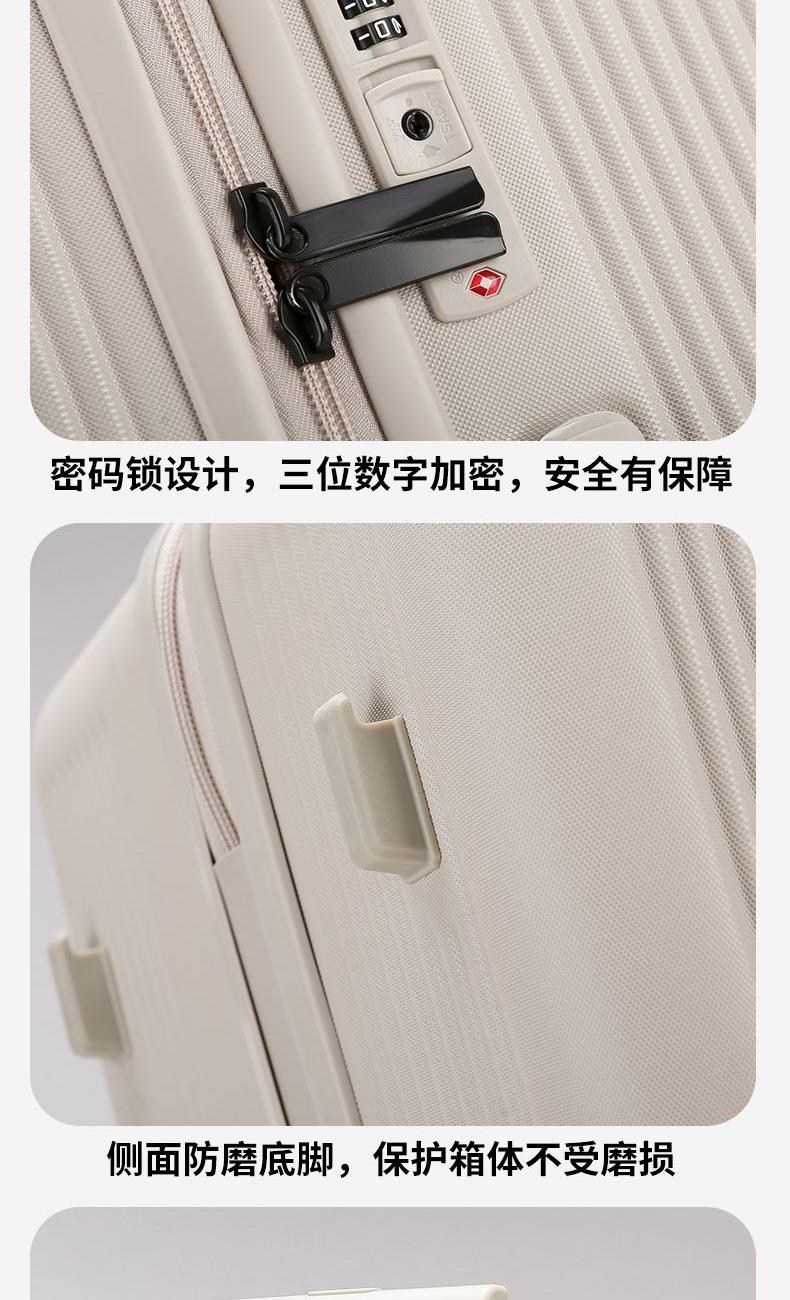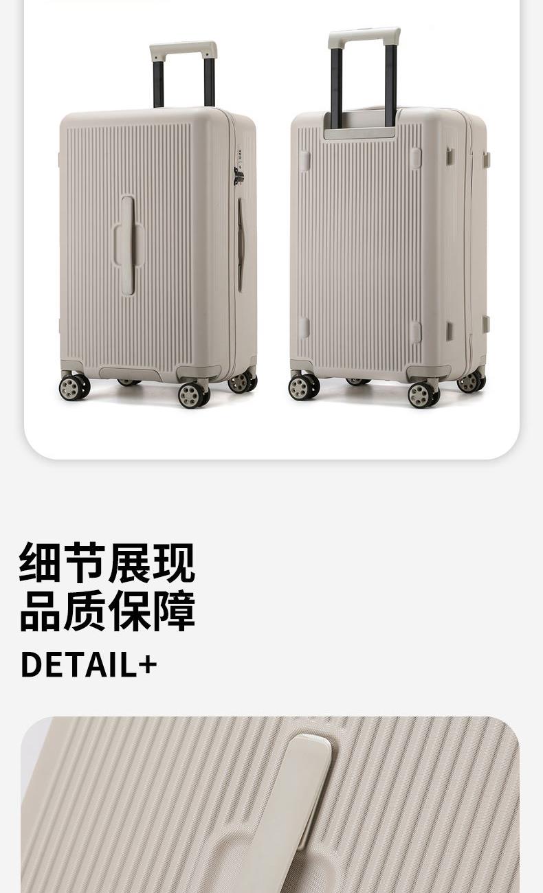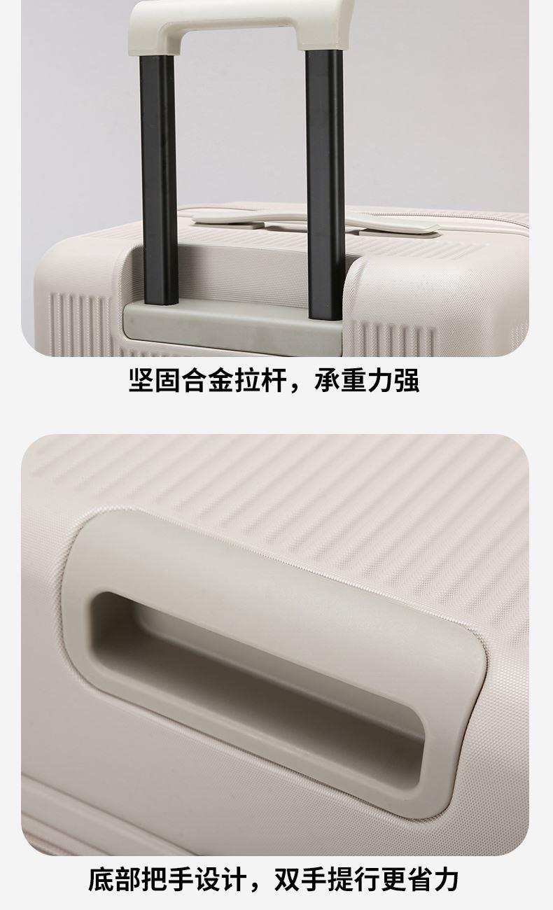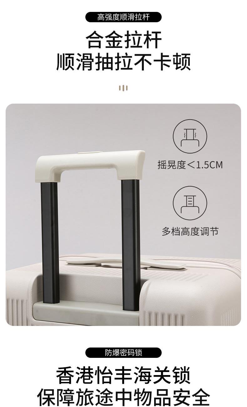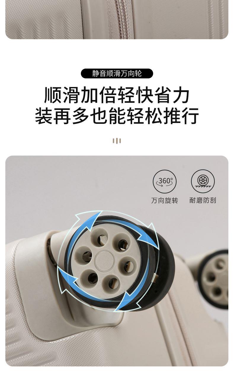 产品型号:HYX8083-24 产品重量:3.98kg 产品规格:24英寸 产品颜色:黑色/灰色/米白/绿色 卖点:德国拜耳PC材质,质地轻盈,高耐热、抗冲击、阻燃、刚硬、柔韧(可踩、摔不变形),犹如护盾般保护着箱内物品; 优质触感耐用提手,柔软触感,温柔接触; 全配色耐磨万向静音轮,运用跑车车轮的设计原理,采用静音材质包裹,360度自由旋转,降噪减震灵动自如,耐磨高弹性TPE材料,触感柔软,负重与减震能力俱佳; 铝合金拉杆,航空铝材,美观耐用; 双层防爆拉链,装再多都有双重保障; 怡丰海关密码锁,标准海关开箱检查锁具。