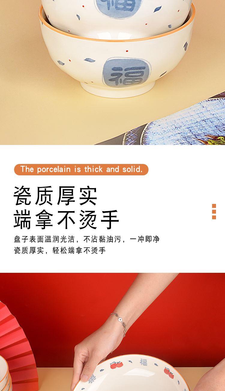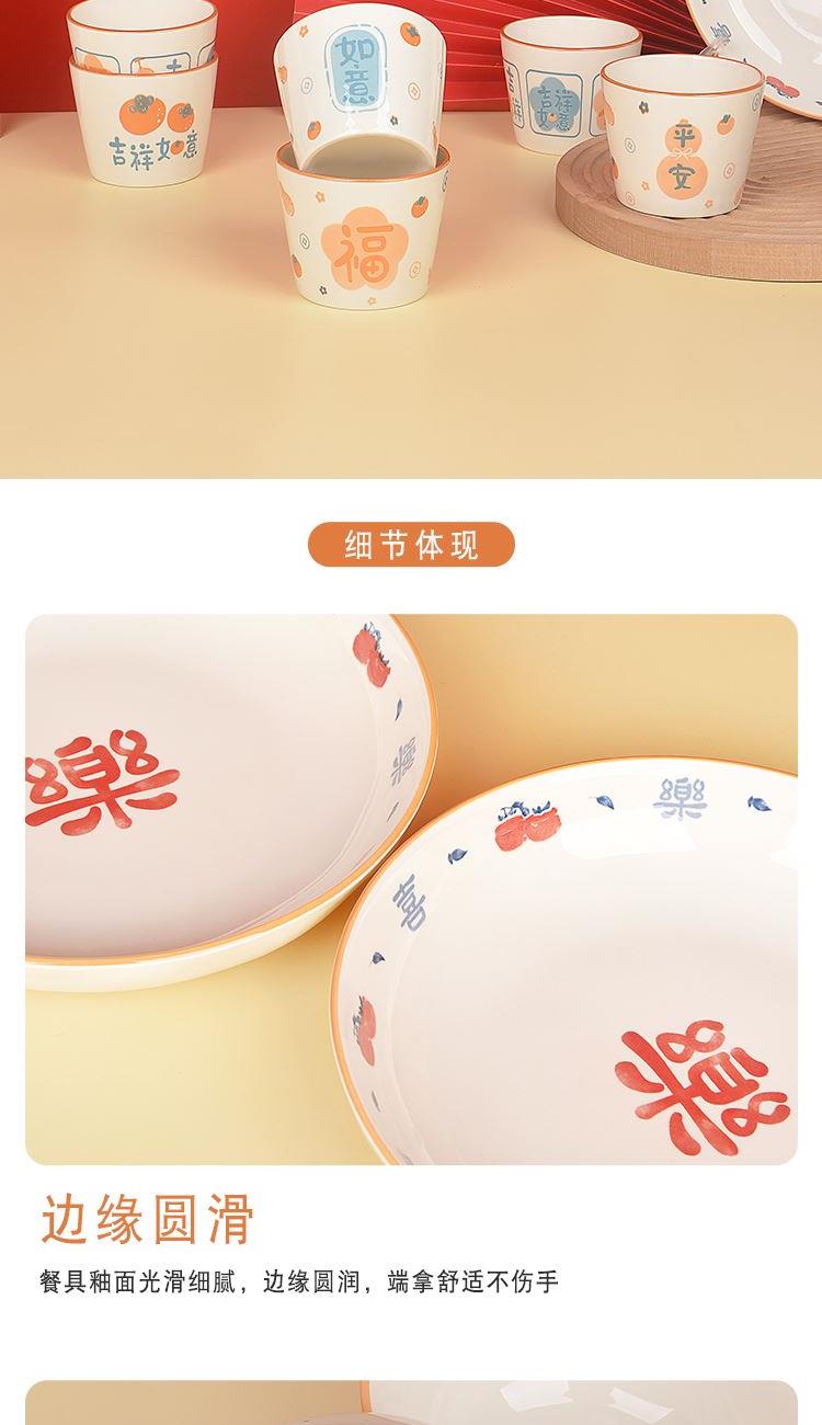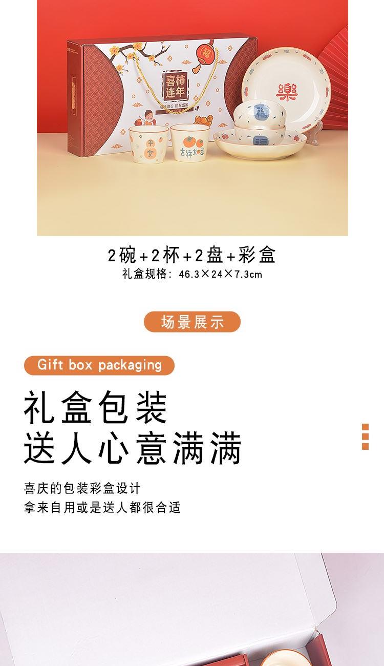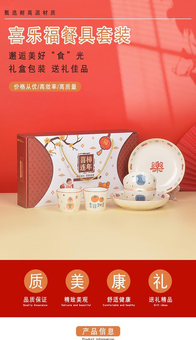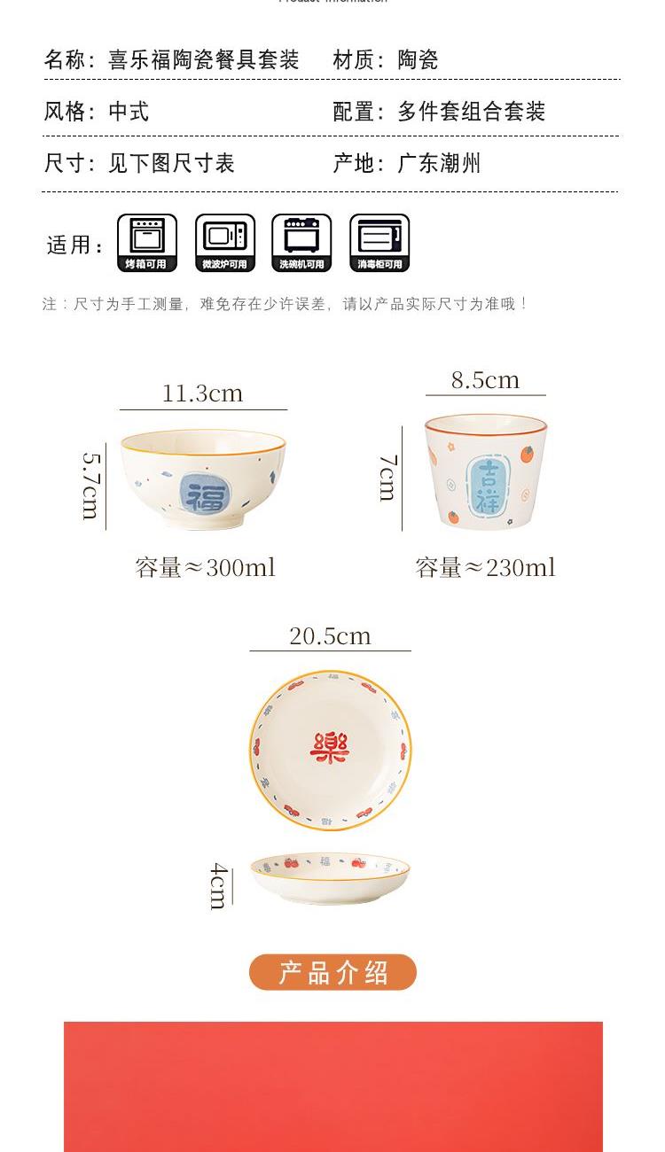 产品组成:整套=2碗+2杯+2盘+彩盒 产品材质:新骨瓷 产品规格:杯=口径8.5cm,高度7cm,容量230ml; 陶瓷碗=口径11.2cm,高度5.5cm;盘=口径20.5cm 彩盒尺寸:46.3*24*7.3cm 外箱毛重:32kg 外箱尺寸:63.5*47*50cm ------ ”生活美学搭子”。让每一天,每一刻都自带vibe, 把这套“喜乐福”餐具当礼物再合适不过。细腻瓷质摸得到的踏实,灵动花纹藏着“愿大家常享乐、常伴福”的期许。花纹里的“福”气看得见,用它装着家常菜,连饭菜都多了份温馨。 送长辈是孝心,送手足是心意,让每一次围坐用餐,都是“意满、乐足、福常在”的幸福滋味~轻松拿捏生活里的小确幸,让日子“city感”十足!幸福感直接拉满! 三餐烟火暖,四季皆安然。选意乐福陶瓷,喜乐常伴,福气满满。