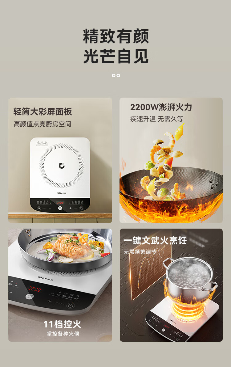 轻简悦目大彩屏,唤启烹饪好心情 加大加宽面板,适配更多锅具 2200W智慧恒匀火,迅猛加热 炒菜更香 11档控火,轻松驾驭各种火候
