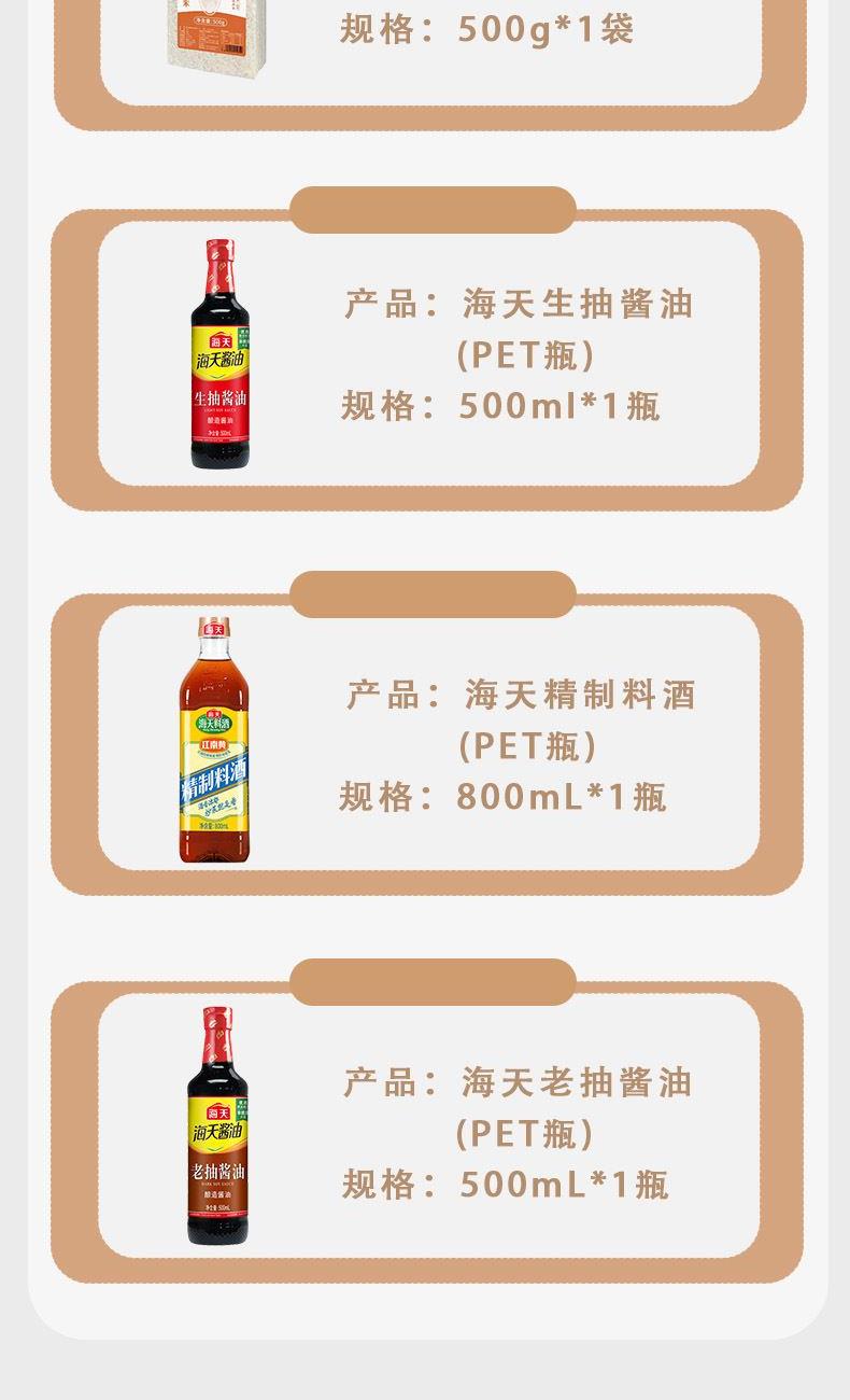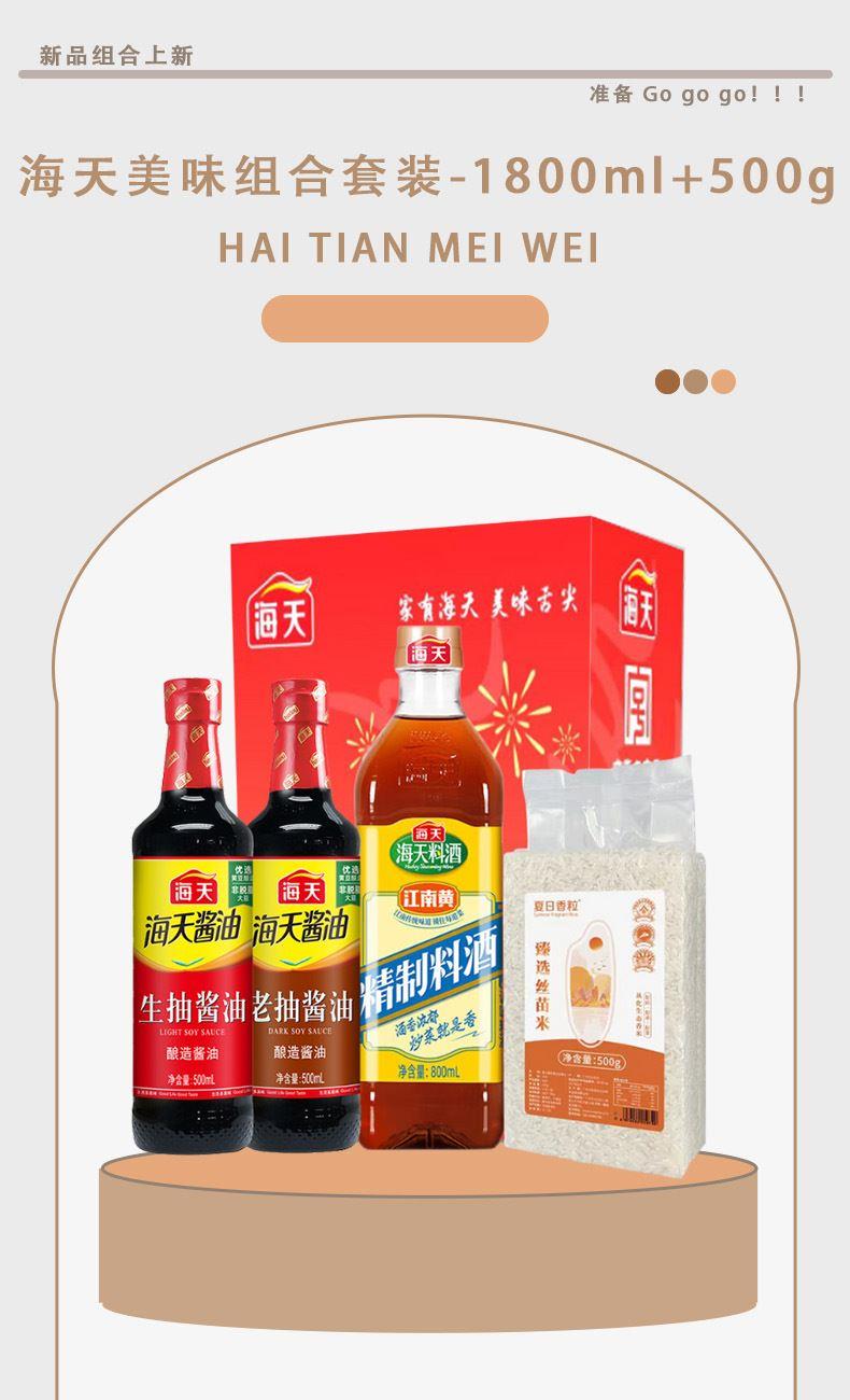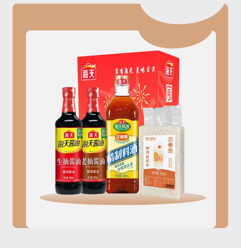 配置: 海天生抽酱油500mL(PET瓶)*1瓶 海天老抽酱油500mL(PET瓶)*1瓶 海天精制料酒800mL(PET瓶)*1瓶 夏日香粒臻选丝苗米500g(真空装)*1袋 卖点: 可选产品丰富多样,礼箱随心组合,多种价位因需而定,充分满足各种送礼需求,是商务送礼、单位福利的用心之选。