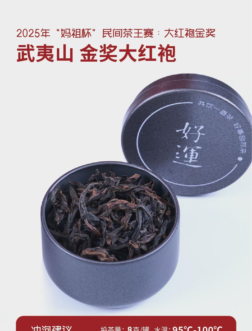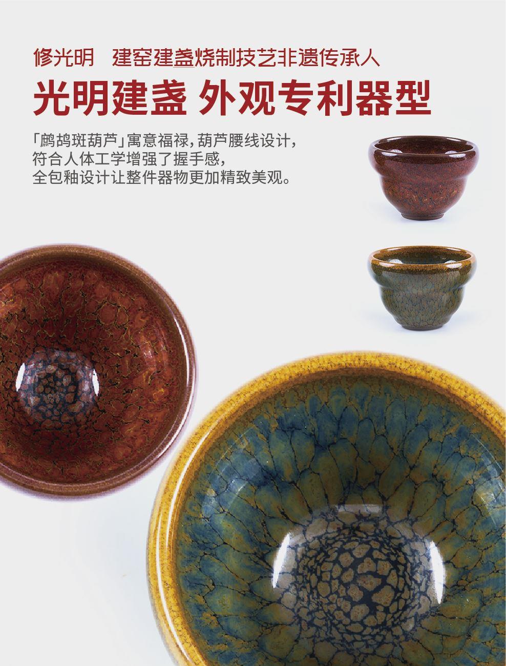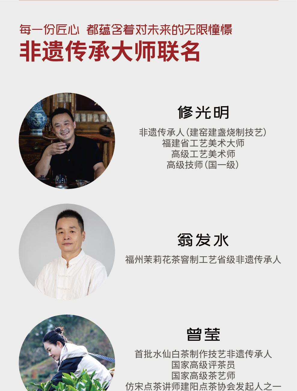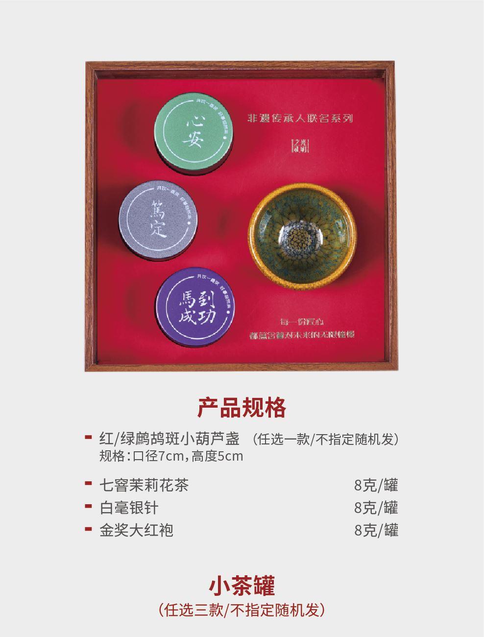 -非遗修光明建盏*1(规格:口径7高度5cm) -福州茉莉花茶*8克/罐(省级非遗翁发水) -荒野白毫银针*8克/罐(首批水仙白非遗曾莹) -金奖大红袍*8克/罐(2025“妈祖杯”大红袍金奖) -礼盒尺寸:21*21*7cm