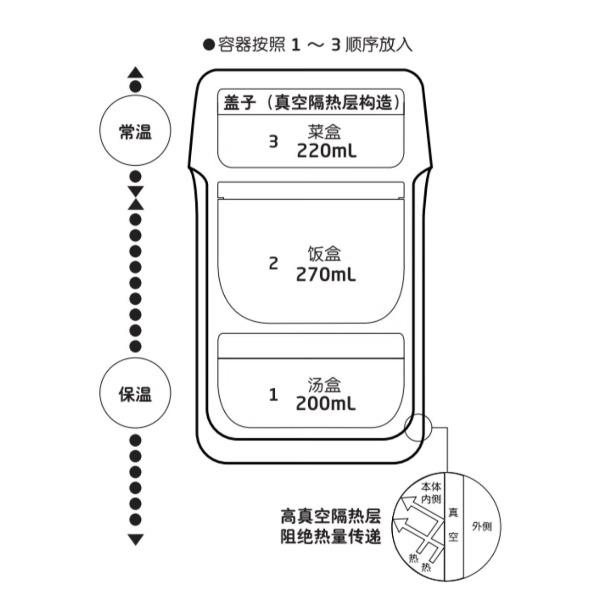 颜 色:NPK珊瑚红/NBL海洋蓝 容 量:菜盒220mL 饭盒270mL 汤盒200mL 材 质:上盖:PP 桶身:不锈钢 密封圈:硅橡胶 菜盒:PP+硅橡胶 饭盒/汤盒:PP 筷子:316L不锈钢 筷盒:ABS 类 型:保温便当桶 定 制:可以定制