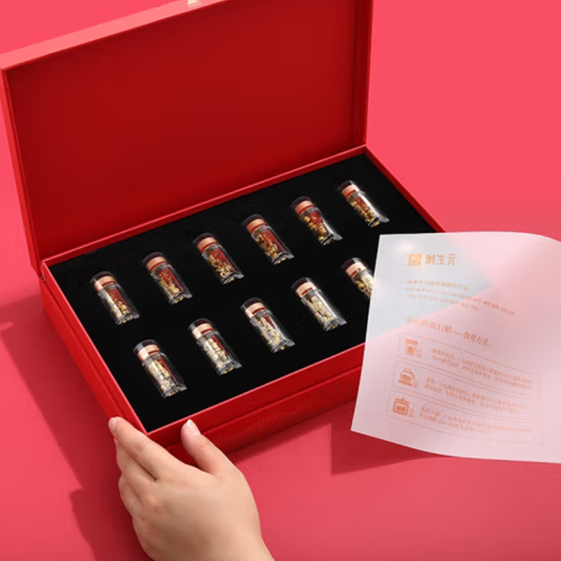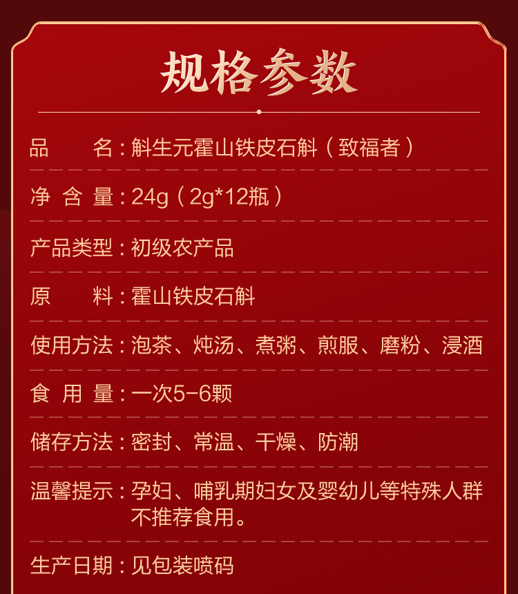 产地:安徽 产品规格:24g(2g*12瓶) 礼盒尺寸: 35.5*23.5*7 (cm) 保质期:36个月 霍山道地三年生铁皮石斛,石斛多糖含量高 18道古法技艺炮制,精选道地高品质原生态食材 胶质浓郁,口齿留香,营养价值高 独立包装,存储时间长