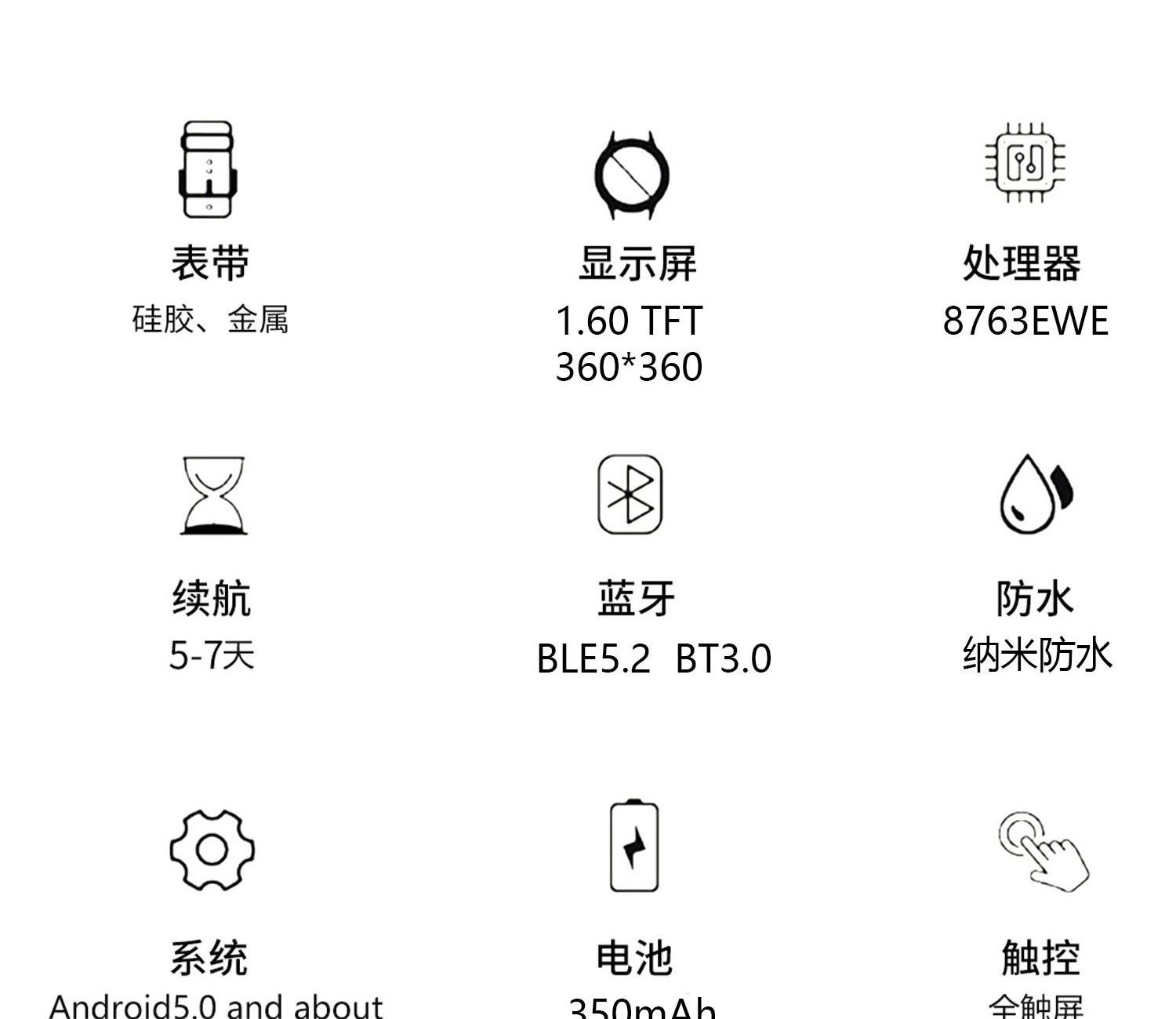 CPU:瑞昱8763EWE 屏幕尺寸:1.6寸TFT屏、分辩率360*360 使用时间:3-5天 充电方式:磁吸式 电池容量:350mAh 智能手表尺寸(mm):44*8.9*200mm 产品材质:锌合金材质,ABS+PC 产品净重:43g 裸机 APP: FitCloudPro 防水等级:IP68 产品清单:手表+充电线+说明书+包装盒 1.6寸TFT屏、分辩率360*360、350mAh电池、双蓝牙芯片通话(播放蓝牙音乐和蓝牙通话)限量款运动推送8+1模式、心率检测、计时器、呼吸训练(在手环查看近期数据记录)、时间日期显示、计步、卡路里、距离带屏显示、常用联系人功能、睡眠监测(睡眠时间、睡眠质量)、语音助手、呼吸训练、床头钟、标准运动功能(计步、距离、卡路里)、GPS轨迹运动、来电提醒,来电、短信、邮件、微信、QQ等消息内容推送、秒表、查找手机、达标提醒、喝水提醒、抬手亮屏、久坐提醒、闹钟提醒、摇一摇拍照、日历