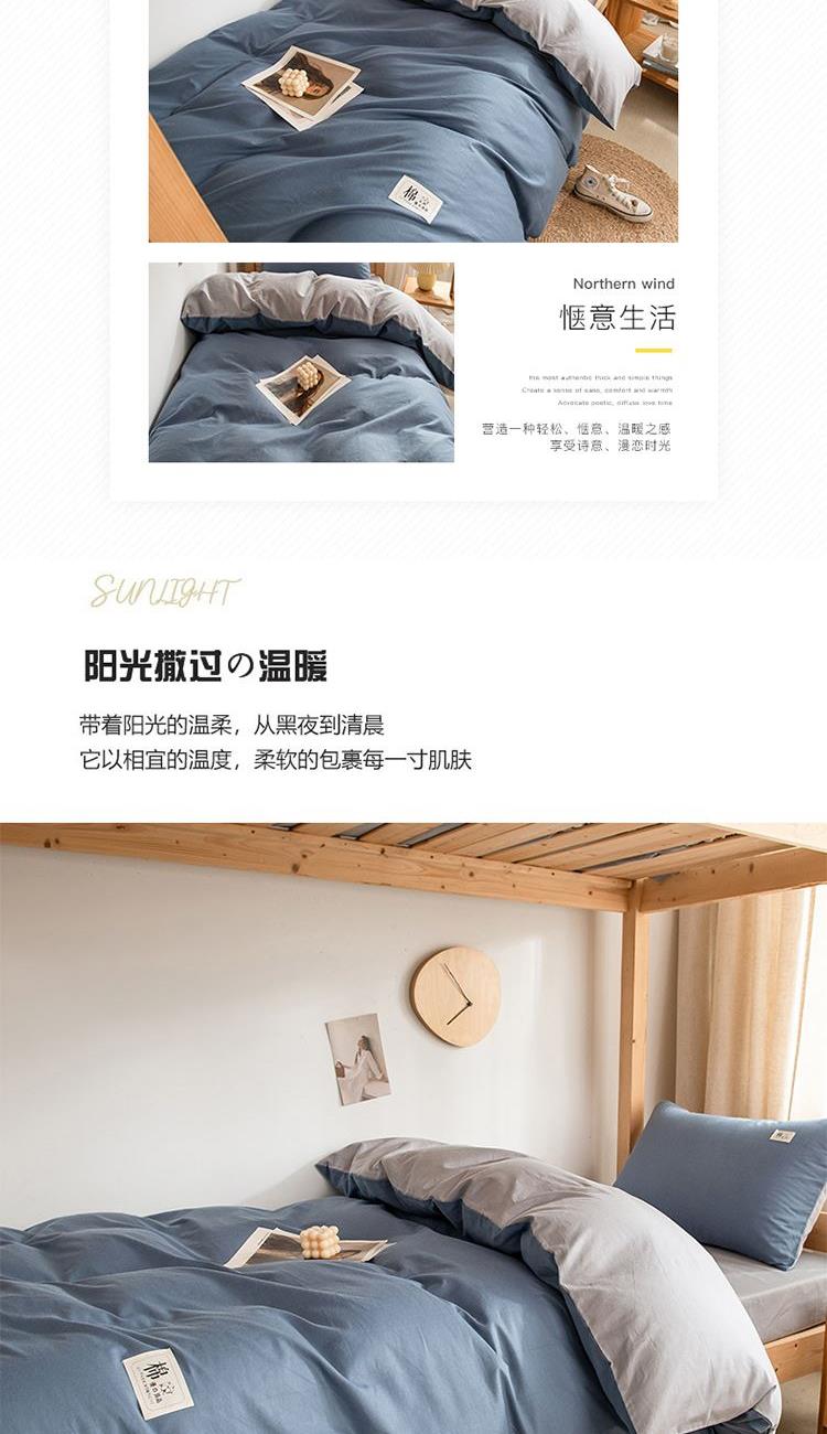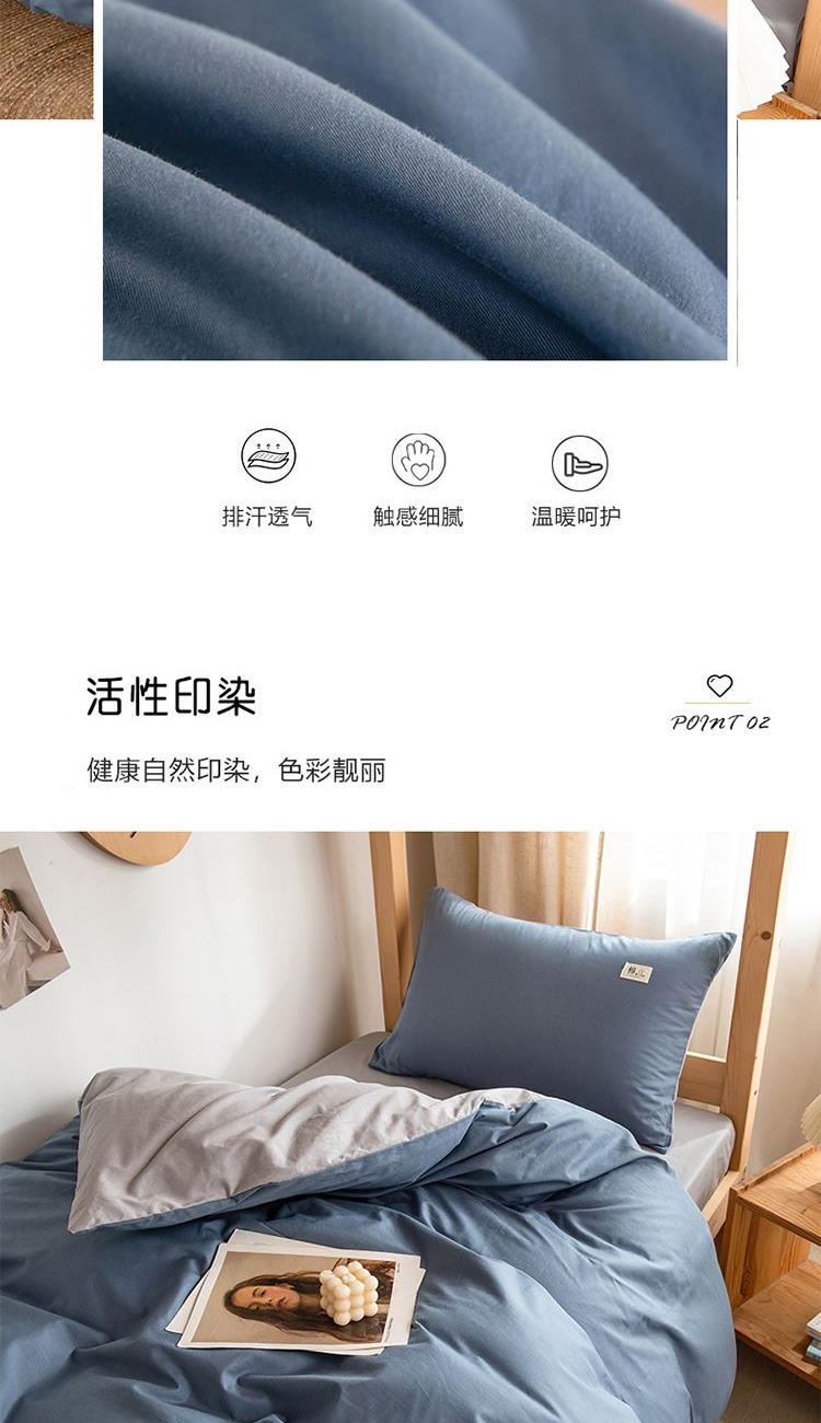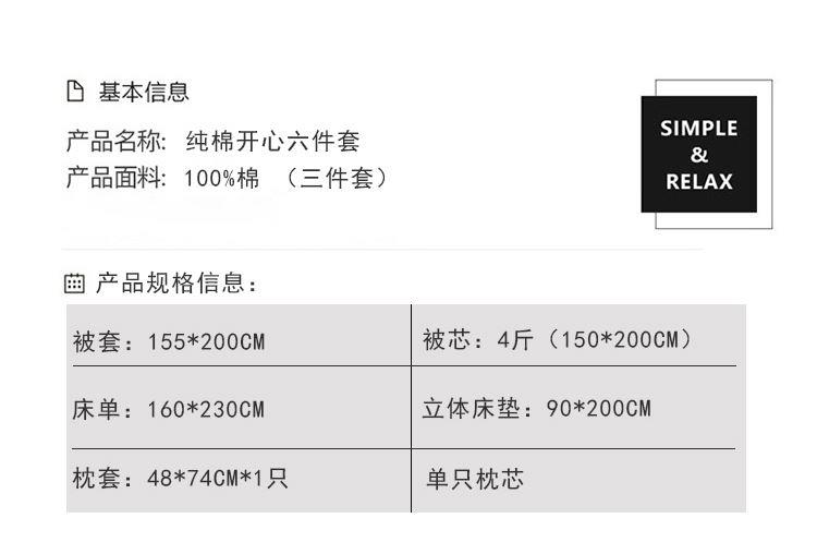 三件套:被套:155*200cm; 床单:160*230cm;枕套:48*74cm*1; 被芯:4斤(150*200cm) 立体床垫:90*200cm;单只枕芯 面料:全棉 (三件套) 1、一站式购齐,领包入住 2、三件套优选好棉,贴身的更要精挑细选 3、采用新一代活性印染工艺,健康环保 4、吸湿亲肤舒适,轻薄透气,缩水率低