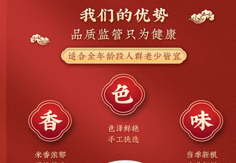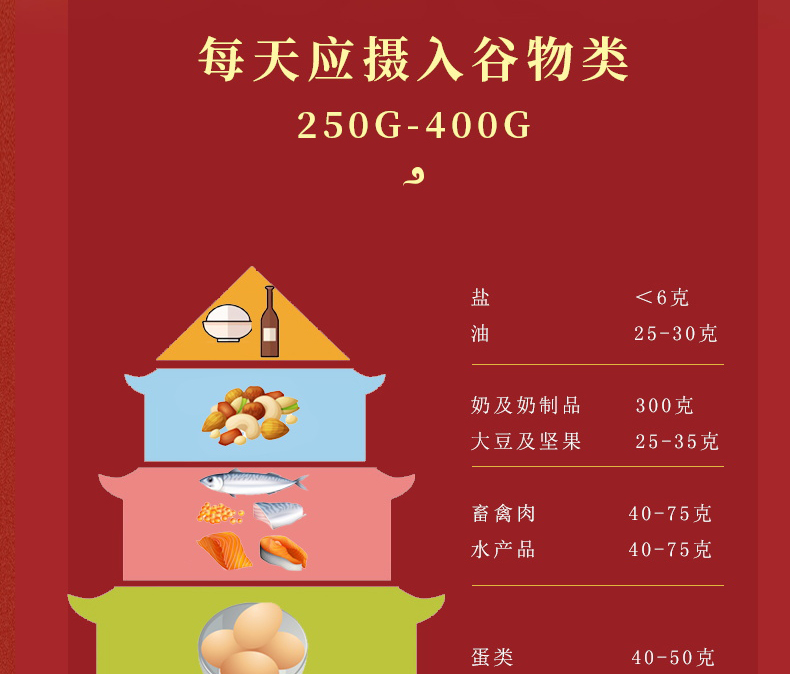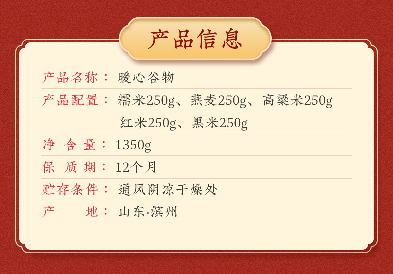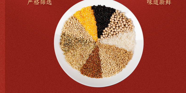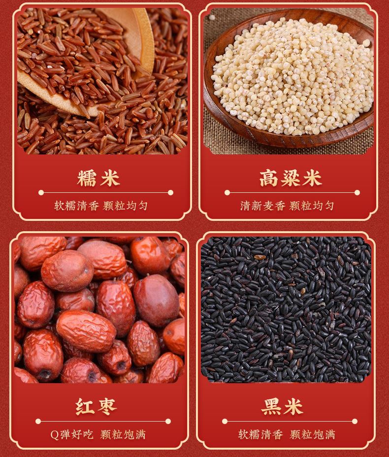 产品规格配置:糯米、燕麦、高粱米、红米黑米各250g、红枣100g 盒尺寸:36*9.5*26cm 箱尺寸:60*37.5*54 体 积:0.122方 箱重量:20.4kg