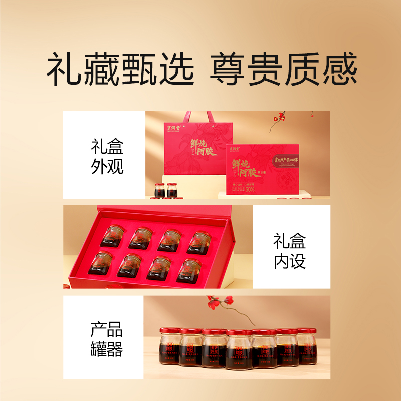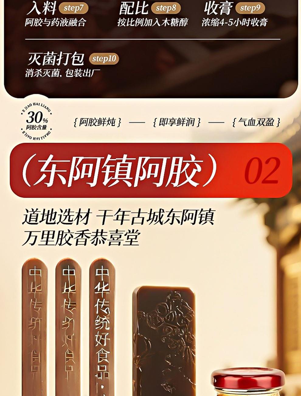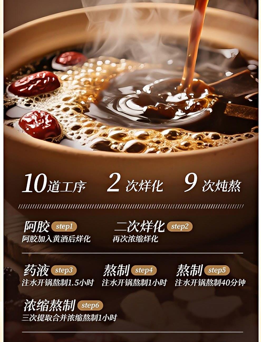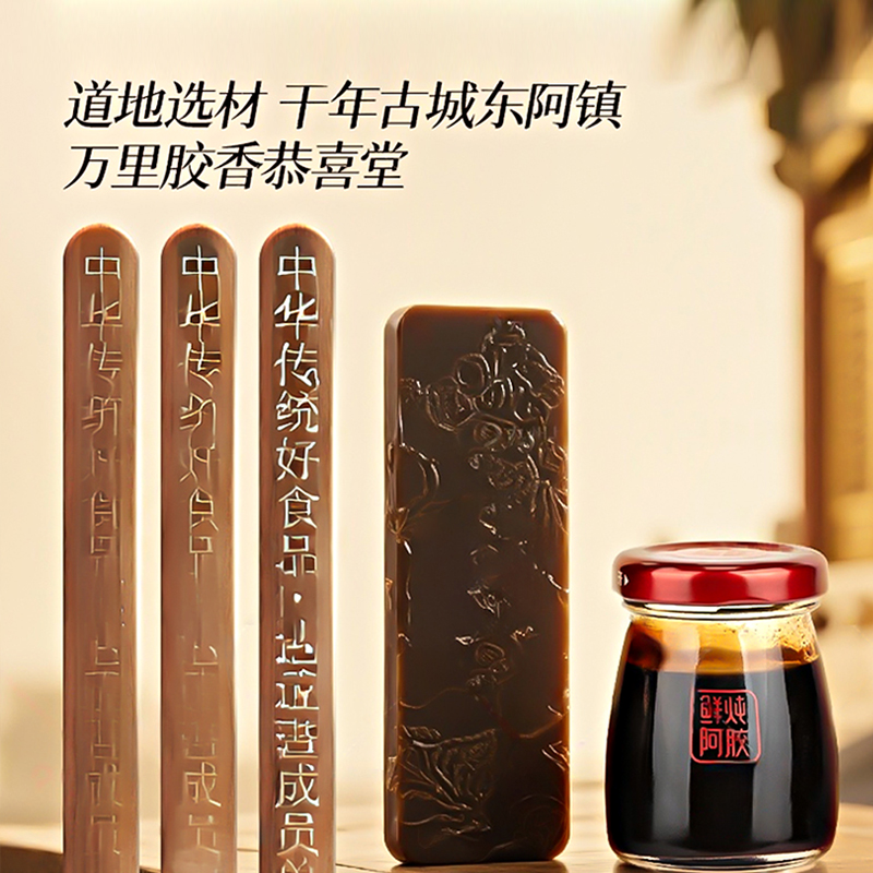 规格:400克(50克*8瓶)、阿胶添加量≥30% 卖点: 我们坚持采用古法熬制工艺,历经泡皮、刮毛、焯皮、化皮、靠汁、打沫、过滤、浓缩、凝胶、切胶等多道繁琐工序,每一步都严格遵循传统标准,由经验丰富的老匠人精心把控。在熬制过程中,掌握火候与时间,使阿胶的胶质充分释放,与其他食材相融合,保留了阿胶及各种食材的营养成分与天然风味。这种传统工艺制作出的阿胶糕,质地均匀、软硬适中、胶香浓郁,是现代工业化生产无法复制的匠心之作。