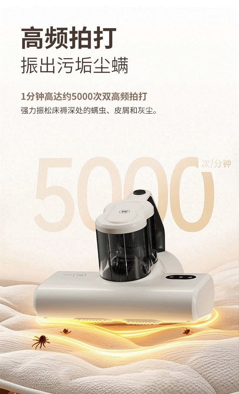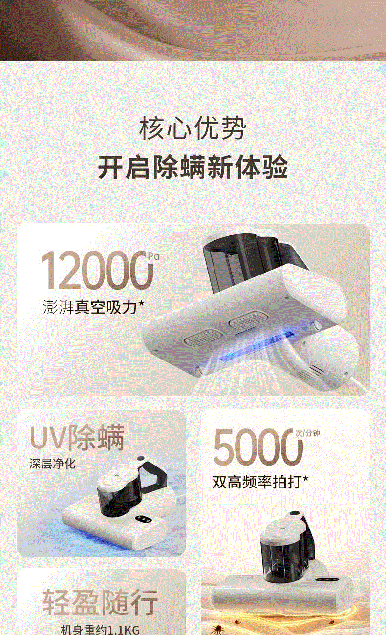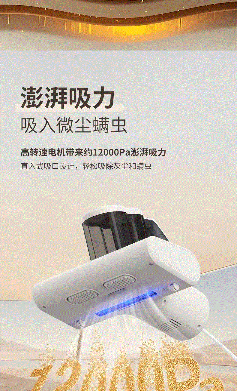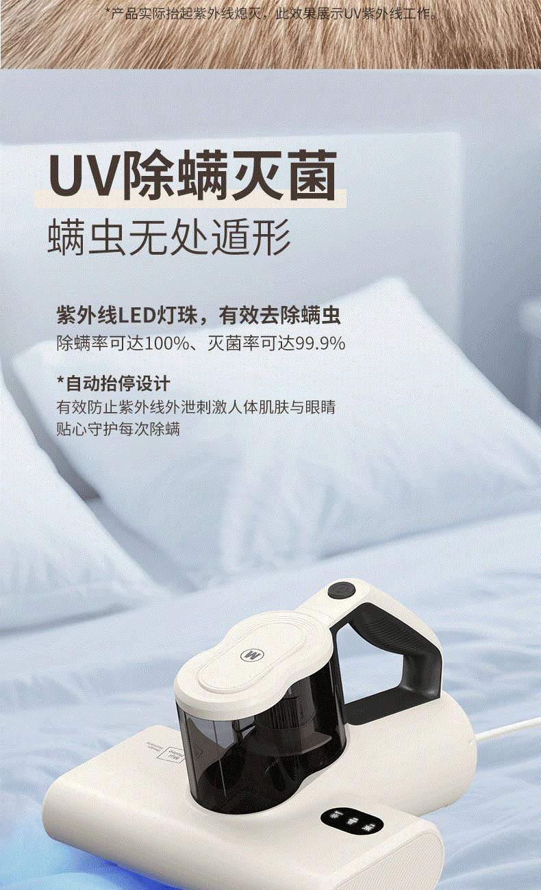 机身小巧轻便,便于携带,随取随用。 流线飞机造型,手持设计,时尚绒白色,简洁美观。 轻量化手提式设计,机身仅重约1.1kg(不含电源线重量),轻巧便携,久用手不酸。 多用途设计,工作范围不受限制,适合家庭、办公环境和车内吸尘等多种使用场景,使用更自由。 UV+双高频拍打,多场景深度清洁(床褥枕芯、沙发、布艺、毛毯、毛绒玩具、衣物、宠物窝等),品质生活加倍护航。 UV( 可与吸尘组合使用,也可单独进行UV),UV紫外线LED灯板,99.9%除螨效果,深净除螨,营造没螨空间。 5000次/分钟(±10%)双高频率拍打,震出床褥枕芯深处的螨虫、细菌、皮屑、灰尘等。 高转速电机(转速约35000转/分钟),旋风分离设计,可产生12000Pa强劲真空吸力,直入式吸口,深入穿透,吸尘无阻挡,轻松除尘螨,工作噪音≤76dB。 多重过滤机构*(尘杯分离 > 过滤海棉 > 气旋过滤),有效阻隔螨虫及其他灰尘物质,滤出新净界。(*尘杯分离:高速离心力,沉降较大颗粒物与絮状毛发; 过滤海棉:过滤微小尘粒;气旋过滤 :分化粉尘与尘气) 400ml透明尘杯,除尘效果清晰可见,及时倾倒,满足日常清洁所需。 尘杯、 过滤海棉,可水洗晾干循环使用,洁净更环保。 吸风口受堵时主电机自动断电,保护机体安全。 提起自动停止UV紫外线灯工作(顶部设置紫外线工作指示灯提醒),贴心防护,避免紫外线直接照射人体肌肤与眼睛而产生的危害。 高转速电机(转速约35000转/分钟),旋风分离设计,可产生12000Pa强劲真空吸力,直入式吸口,深入穿透,吸尘无阻挡,轻松除尘螨,工作噪音≤76dB。 多重过滤机构*(尘杯分离 > 过滤海棉 > 气旋过滤),有效阻隔螨虫及其他灰尘物质,滤出新净界。(*尘杯分离:高速离心力,沉降较大颗粒物与絮状毛发; 过滤海棉:过滤微小尘粒;气旋过滤 :分化粉尘与尘气) 400ml透明尘杯,除尘效果清晰可见,及时倾倒,满足日常清洁所需。 尘杯、 过滤海棉,可水洗晾干循环使用,洁净更环保。 吸风口受堵时主电机自动断电,保护机体安全。 提起自动停止UV紫外线灯工作(顶部设置紫外线工作指示灯提醒),贴心防护,避免紫外线直接照射人体肌肤与眼睛而产生的危害。
