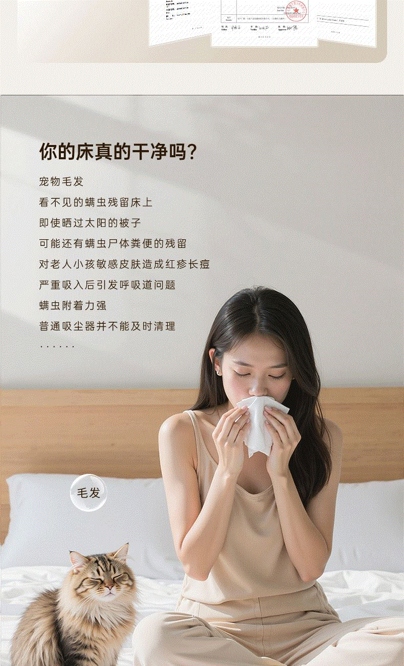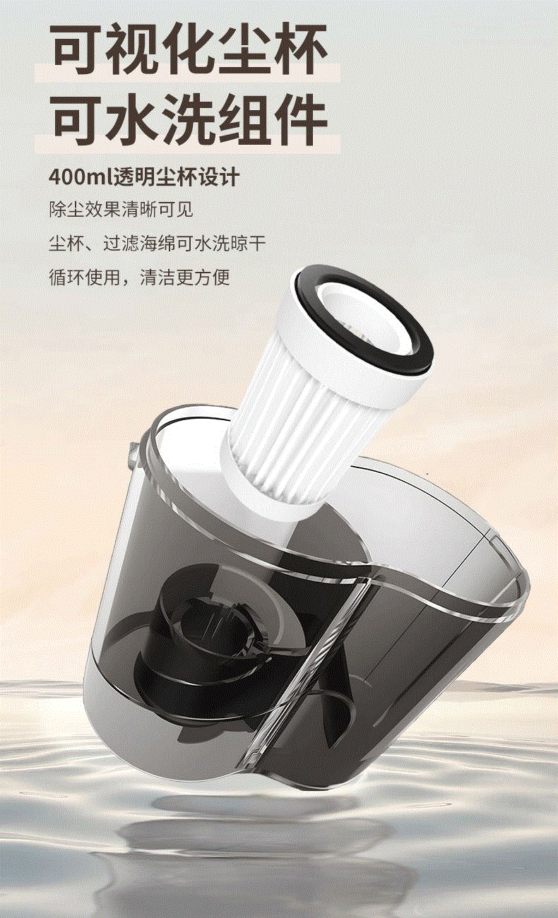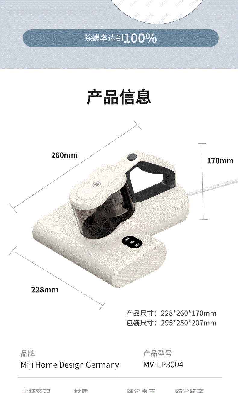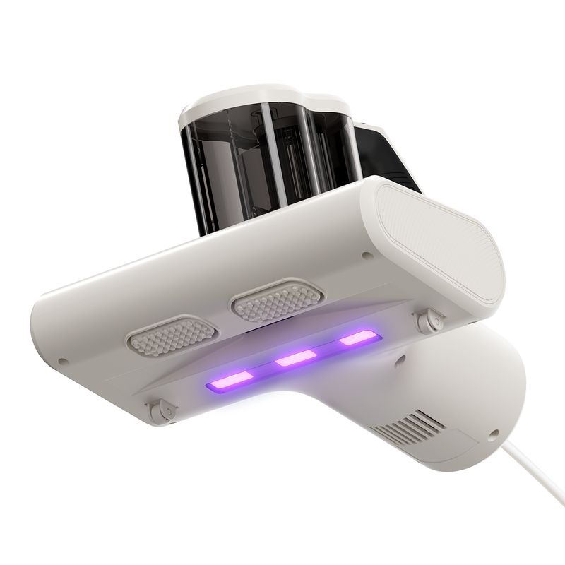 机身小巧轻便,便于携带,随取随用。 流线飞机造型,手持设计,时尚绒白色,简洁美观。 轻量化手提式设计,机身仅重约1.1kg(不含电源线重量),轻巧便携,久用手不酸。 多用途设计,工作范围不受限制,适合家庭、办公环境和车内吸尘等多种使用场景,使用更自由。 UV+双高频拍打,多场景深度清洁(床褥枕芯、沙发、布艺、毛毯、毛绒玩具、衣物、宠物窝等),品质生活加倍护航。 UV( 可与吸尘组合使用,也可单独进行UV),UV紫外线LED灯板,99.9%除螨效果,深净除螨,营造没螨空间。 5000次/分钟(±10%)双高频率拍打,震出床褥枕芯深处的螨虫、细菌、皮屑、灰尘等。 高转速电机(转速约35000转/分钟),旋风分离设计,可产生12000Pa强劲真空吸力,直入式吸口,深入穿透,吸尘无阻挡,轻松除尘螨,工作噪音≤76dB。 多重过滤机构*(尘杯分离 > 过滤海棉 > 气旋过滤),有效阻隔螨虫及其他灰尘物质,滤出新净界。(*尘杯分离:高速离心力,沉降较大颗粒物与絮状毛发; 过滤海棉:过滤微小尘粒;气旋过滤 :分化粉尘与尘气) 400ml透明尘杯,除尘效果清晰可见,及时倾倒,满足日常清洁所需。 尘杯、 过滤海棉,可水洗晾干循环使用,洁净更环保。 吸风口受堵时主电机自动断电,保护机体安全。 提起自动停止UV紫外线灯工作(顶部设置紫外线工作指示灯提醒),贴心防护,避免紫外线直接照射人体肌肤与眼睛而产生的危害。 高转速电机(转速约35000转/分钟),旋风分离设计,可产生12000Pa强劲真空吸力,直入式吸口,深入穿透,吸尘无阻挡,轻松除尘螨,工作噪音≤76dB。 多重过滤机构*(尘杯分离 > 过滤海棉 > 气旋过滤),有效阻隔螨虫及其他灰尘物质,滤出新净界。(*尘杯分离:高速离心力,沉降较大颗粒物与絮状毛发; 过滤海棉:过滤微小尘粒;气旋过滤 :分化粉尘与尘气) 400ml透明尘杯,除尘效果清晰可见,及时倾倒,满足日常清洁所需。 尘杯、 过滤海棉,可水洗晾干循环使用,洁净更环保。 吸风口受堵时主电机自动断电,保护机体安全。 提起自动停止UV紫外线灯工作(顶部设置紫外线工作指示灯提醒),贴心防护,避免紫外线直接照射人体肌肤与眼睛而产生的危害。
