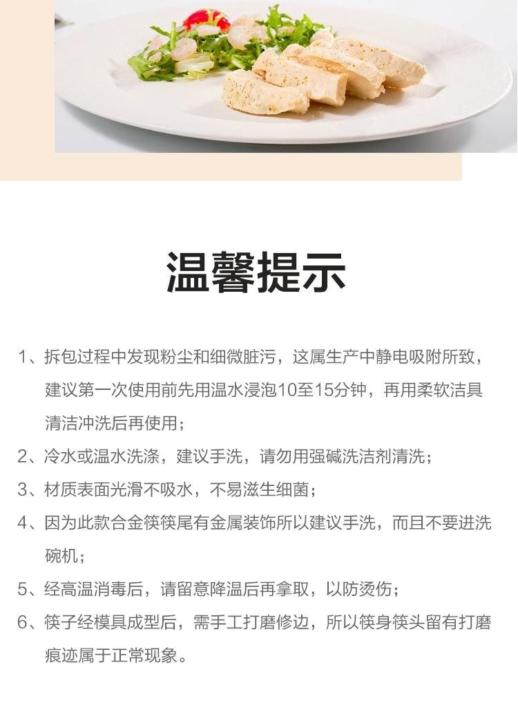 货号:TA030103243ZZ 产品材质:PPS+玻璃纤维合成材料 产品参数:10双 筷长:24.3cm 包装尺寸:26*13*5cm 产品介绍: 合金筷材质:高分子材料+玻璃纤维合成。 “合金”释解:由两种以上物质(元素)通过高温高压使产品性能发生改变,从而具备更加接近金属性能的特性,比如高耐温性、高耐磨性、高耐腐蚀性、高韧性等。 多样屋追溯源头使用全新料 为确保每一双合金筷耐用、健康安全,多样屋追溯工厂从产品制造升级为产品+原材料制造工厂,对各项材料配方进行严格甄选和品控。 多样屋新合金筷特点:蒸煮无异味 ;韧性好,不易断;刚性强,更耐磨。耐高温180℃不易变形。 温馨提示:(可有效延长筷子使用寿命) 1.高温消毒(120°C以下) 2.消毒时间(5-10分钟)3.消毒时距离发热管10cm以上