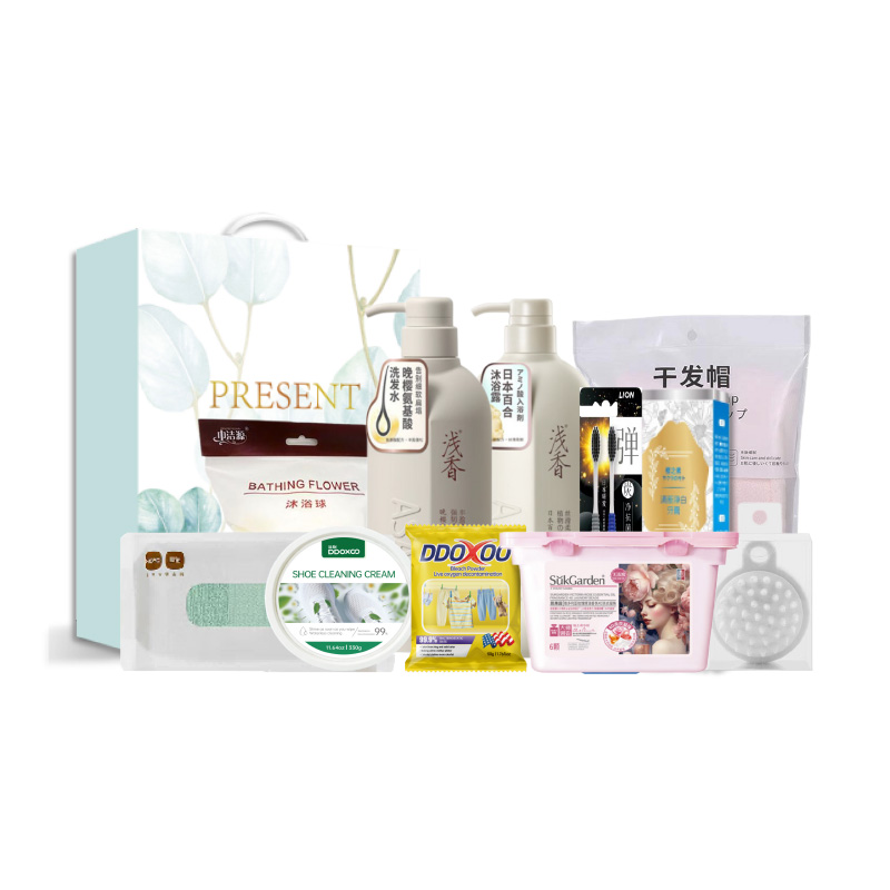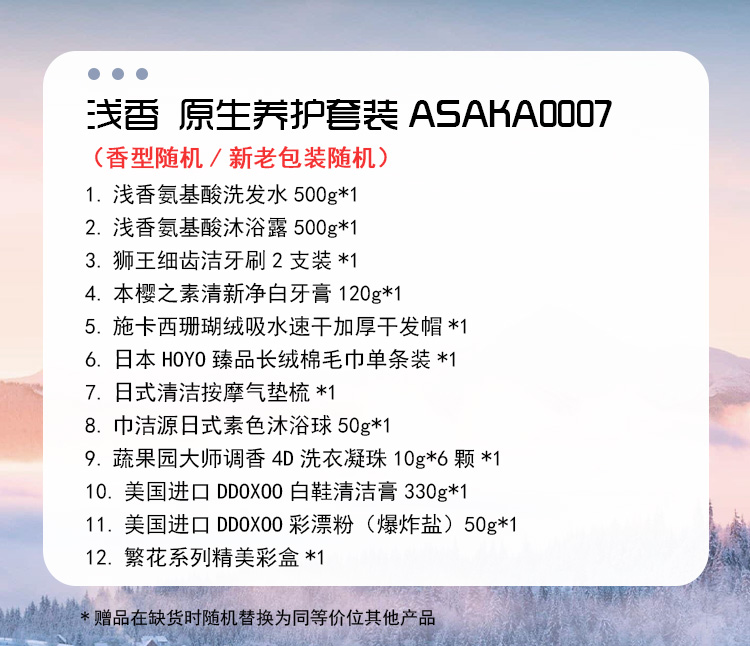 【套装配置】(香型随机/新老包装随机) 1.浅香氨基酸洗发水500g*1 2.浅香氨基酸沐浴露500g*1 3.狮王细齿洁牙刷2支装*1 4.本樱之素清新净白牙膏120g*1 5.施卡西珊瑚绒吸水速干加厚干发帽*1 6.日本HOYO臻品长绒棉毛巾单条装*1 7.日式清洁按摩气垫梳*1 8.巾洁源日式素色沐浴球50g*1 9.蔬果园大师调香4D洗衣凝珠10g*6颗*1 10.美国进口DDOXOO白鞋清洁膏330g*1 11.美国进口DDOXOO彩漂粉(爆炸盐)50g*1 12.繁花系列精美彩盒*1