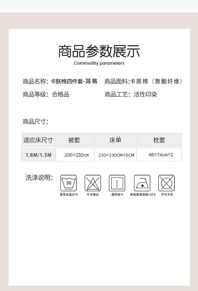 规格: 床单:230*230cm±5cm 被罩:200*230cm 枕套:48*74cmx2 面料:卡肤棉(聚酯纤维) 1、卡肤棉面料,采用新一代活性印染工艺,健康环保 2、棉质透气,吸湿亲肤舒适,轻薄透气,缩水率低