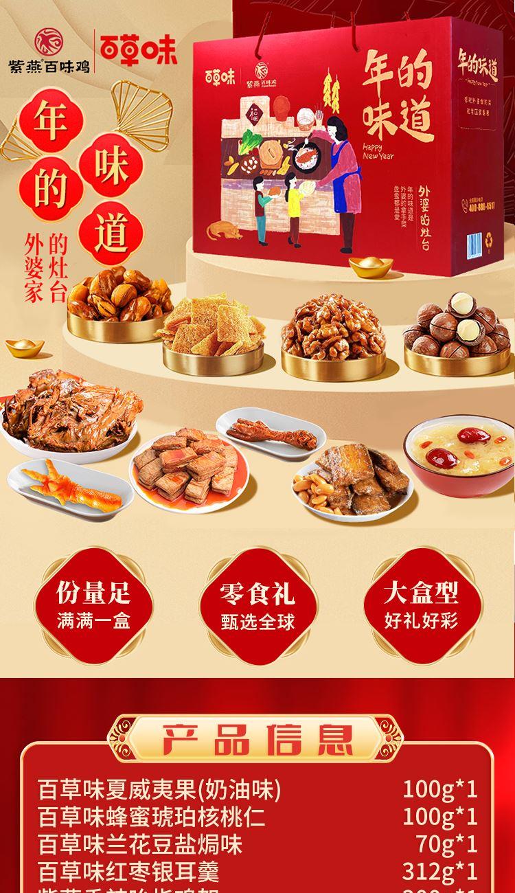 【百草味】夏威夷果(奶油味)100g*1 【百草味】蜂蜜琥珀核桃仁100g*1 【百草味】兰花豆盐焗味70g*1 【百草味】红枣银耳羹 312g*1 【紫燕】香辣吮指鸡架300g*1 【紫燕】豆香带鱼(香辣味)60g*1 【紫燕】去骨凤爪(柠檬味)(单只)24g*1 【紫燕】虎皮凤爪(卤香味)(单只)30g*1 【紫燕】风味鸡肉豆腩(鸡肉豆腩香辣味)60g*1 【紫燕】黄金蹦蹦脆(玉米锅巴牛肉味)135g*1 礼盒+组装+外盒