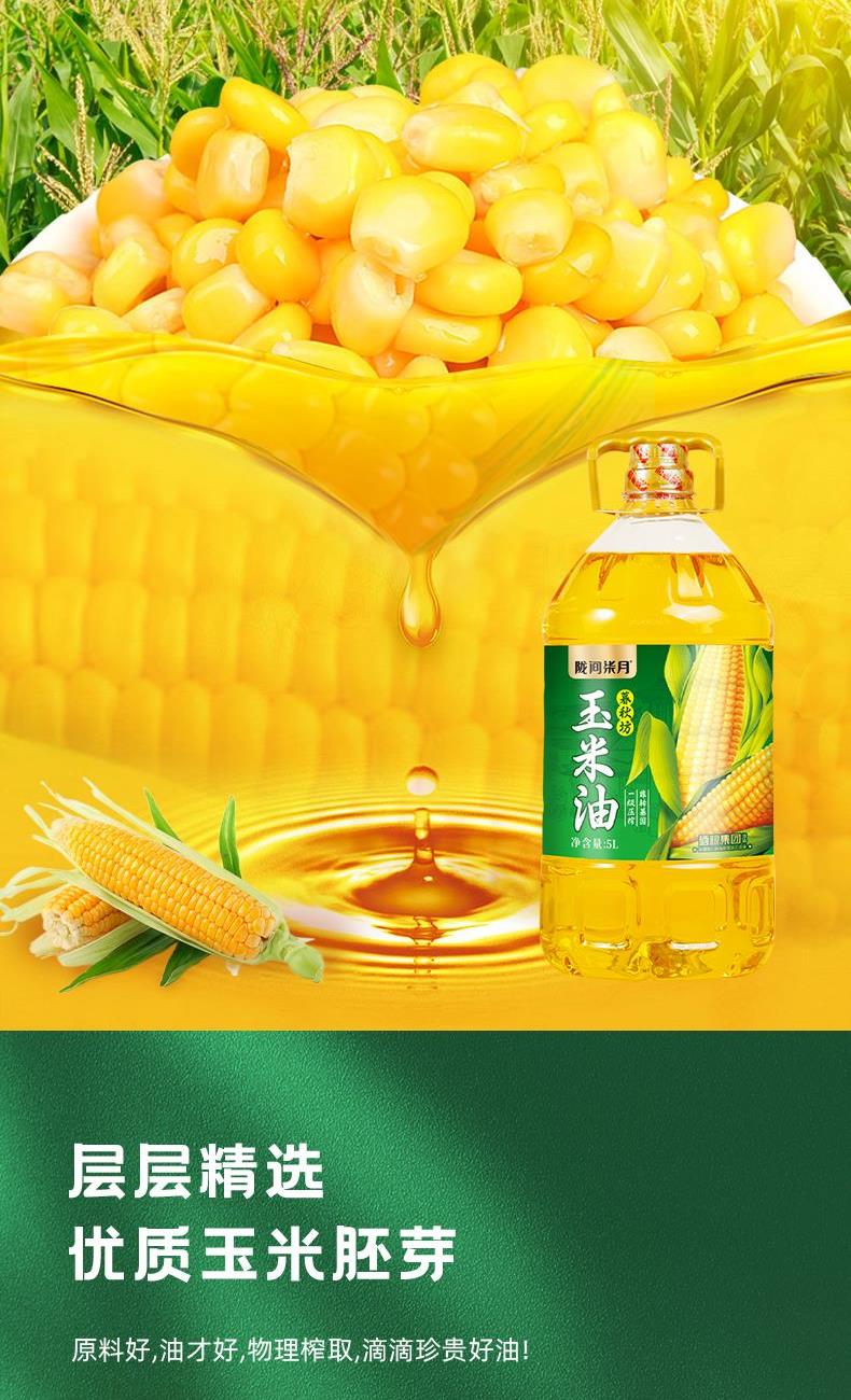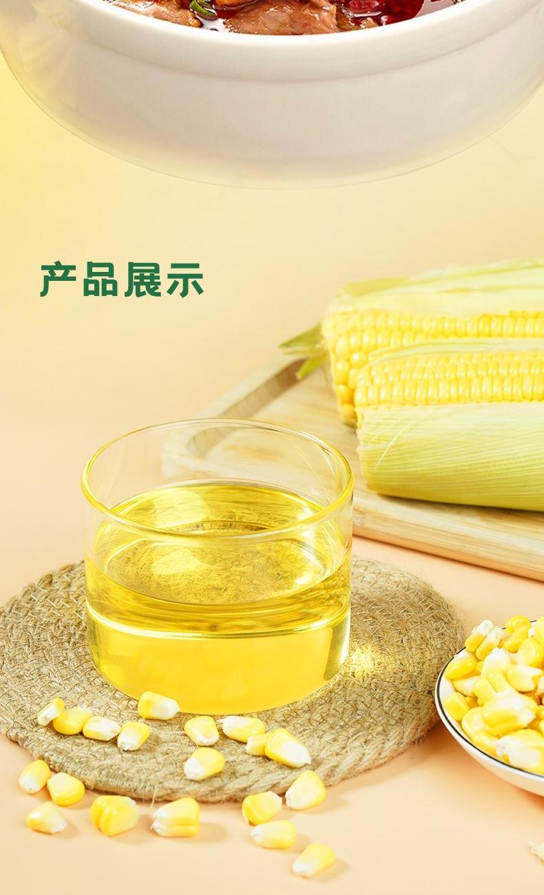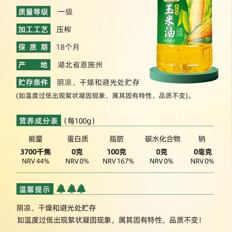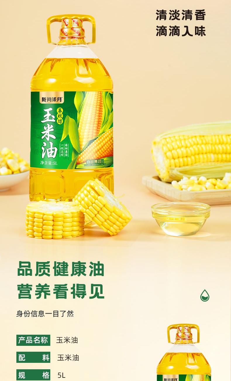 产品信息 品 名:玉米油5L 规 格:5L 箱 规:4桶/箱 产品特色 1、精选非转基因优质玉米,物理压榨 2、玉米油富含维生素E,营养价值高,享有“健康油”"长寿油”"放心油”等美称。 3、玉米油澄清透明,清香扑鼻,油烟点高,适合快速烹炒煎炸食物。