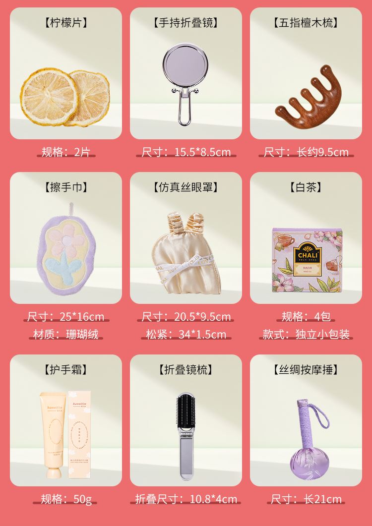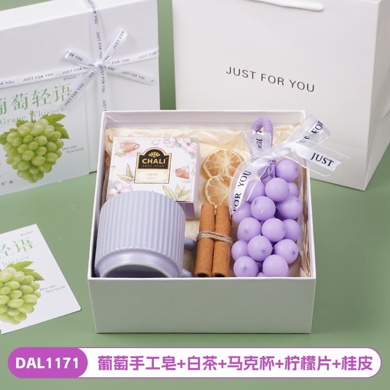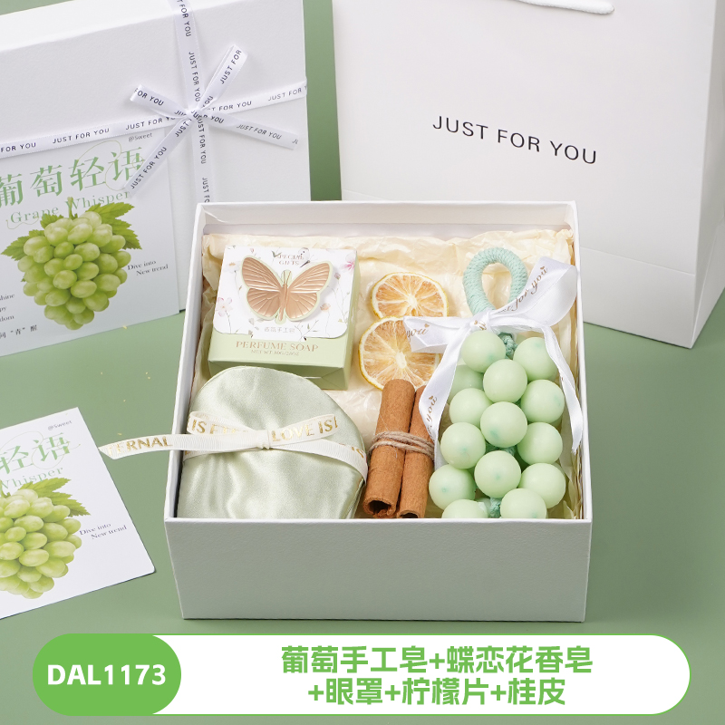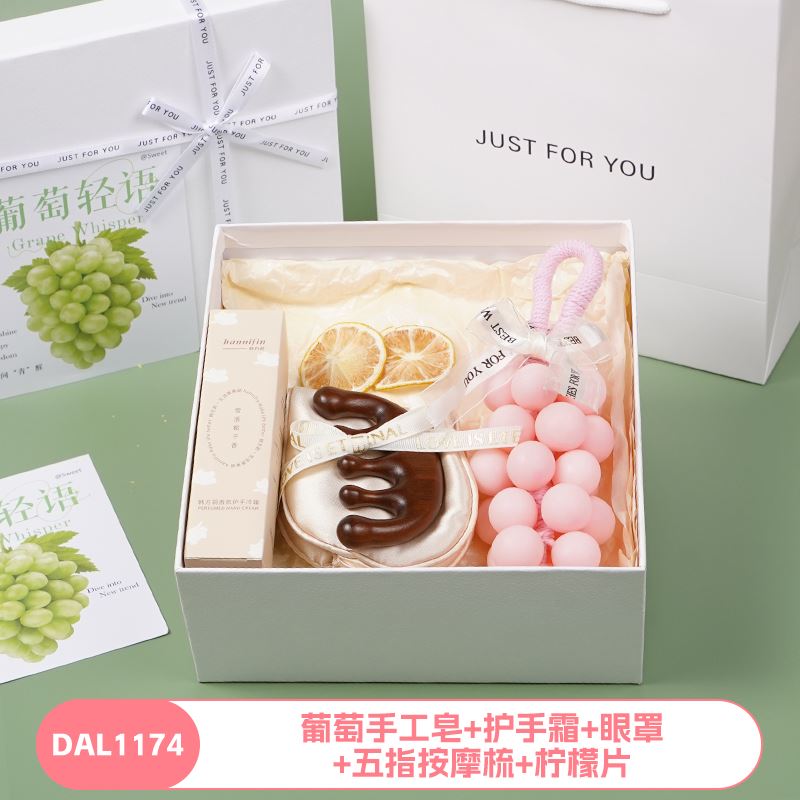 编码:DAL1171 内配:葡萄手工皂+白茶+马克杯+柠檬片+桂皮 编码:DAL1172 内配:葡萄手工皂+洗发梳+手持折叠镜+柠檬片+桂皮 编码:DAL1173 内配:葡萄手工皂+蝶恋花香皂+眼罩+柠檬片+桂皮 编码:DAL1174 内配:葡萄手工皂+护手霜+眼罩+五指按摩梳+柠檬片