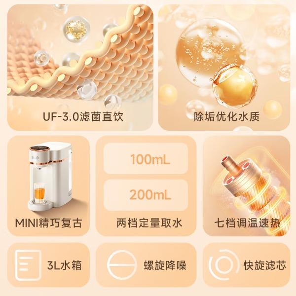 制水流速(常温):0.9L/分钟 额定净水量:1000L 产品尺寸:宽185mm 深328mm 高338mm 滤芯级数:3级 过滤原理:超滤 出水温度:热水 水压范围(Mpa):0.05-0.1 是否有压力桶:没有压力桶 用途:生活用水 饮用水 安装方式:免安装 额定功率:2200W 产品净重:3.6kg 旋流速热、螺旋降噪、快旋滤芯