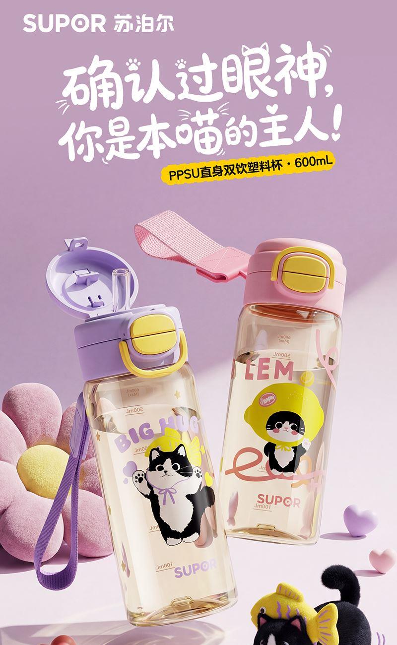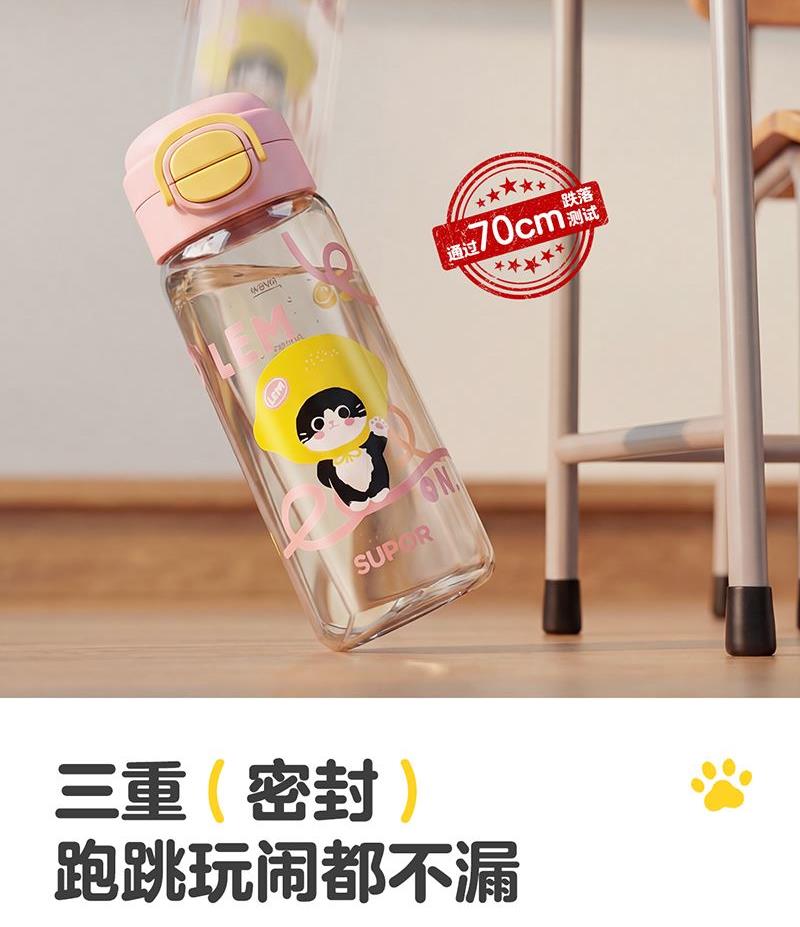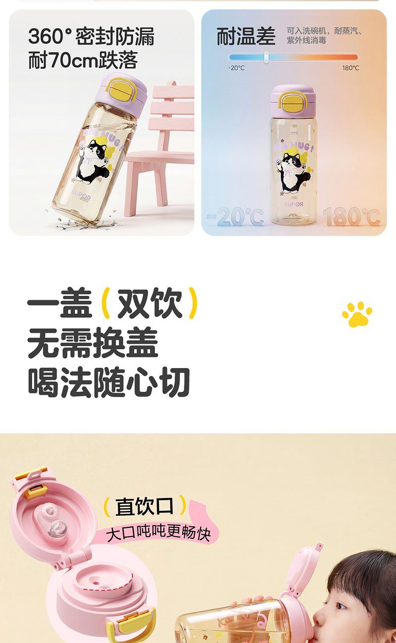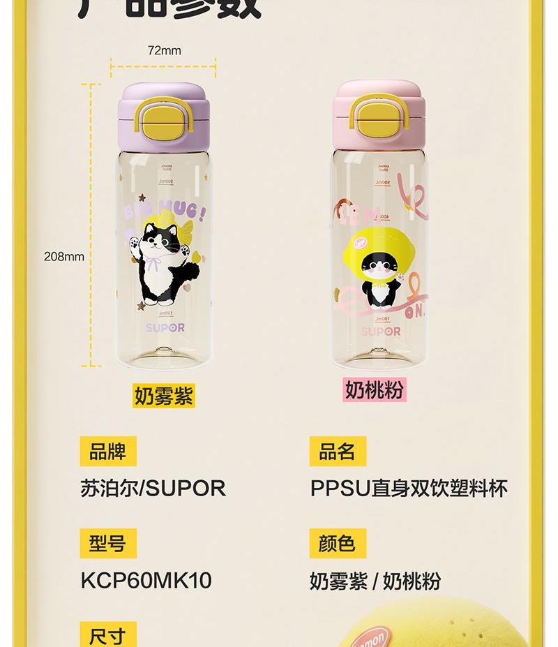 容量:600ml 524*515*229mm 9.9kgs 材质:PPSU 卖点: 1.一盖双饮模式,满足不同饮水需求 2.二段泄压设计,弹盖防喷溅更安全 3.72mm直径,轻松放进书包侧袋 4.自带提绳方便提拎 5.600mL容量,满足小朋友一天所需