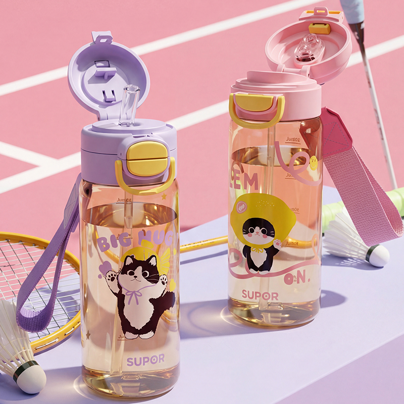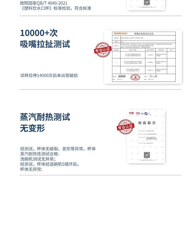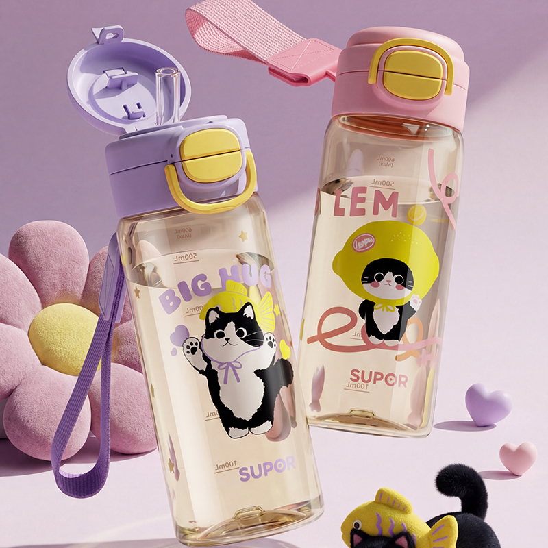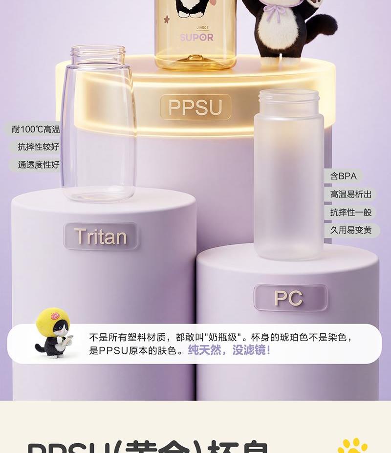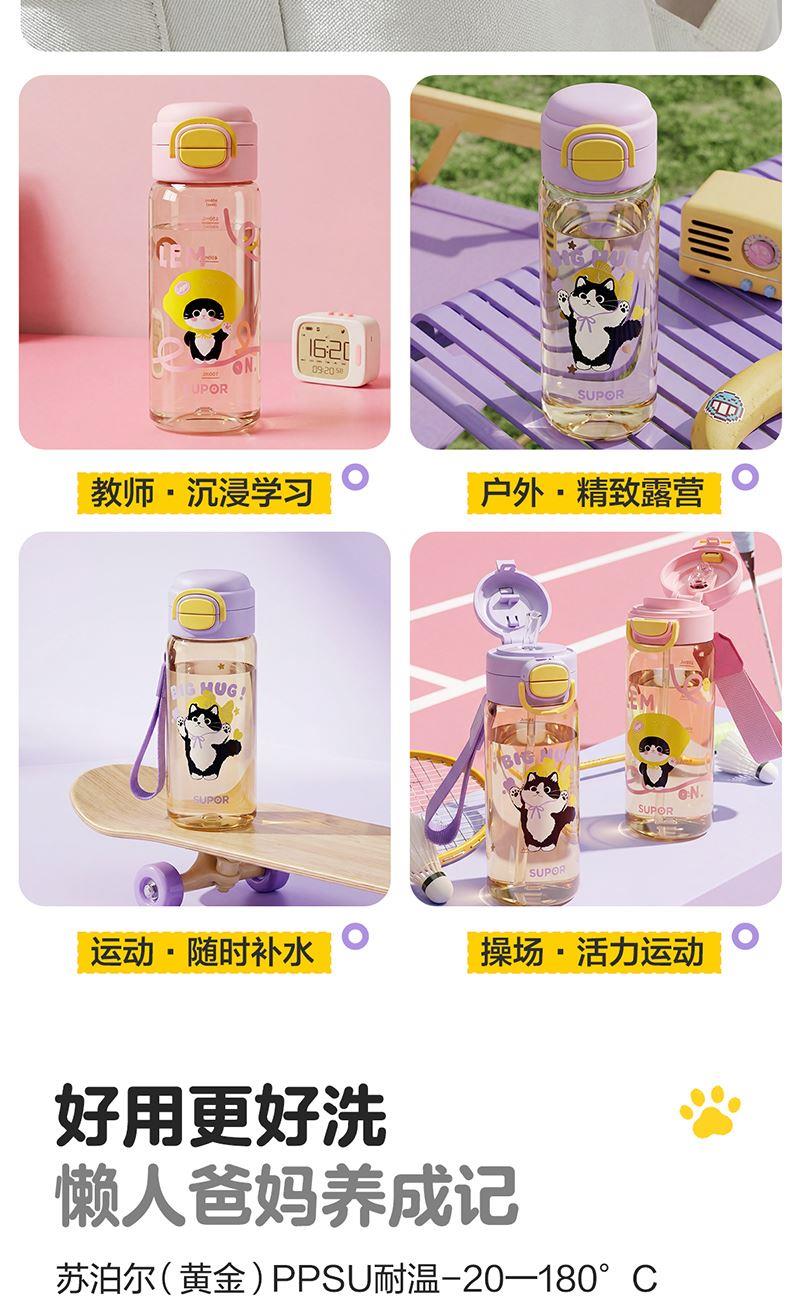 容量:600ml 524*515*229mm 9.9kgs 材质:PPSU 卖点: 1.一盖双饮模式,满足不同饮水需求 2.二段泄压设计,弹盖防喷溅更安全 3.72mm直径,轻松放进书包侧袋 4.自带提绳方便提拎 5.600mL容量,满足小朋友一天所需