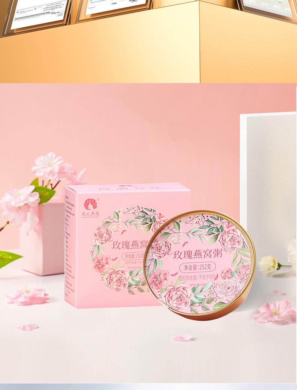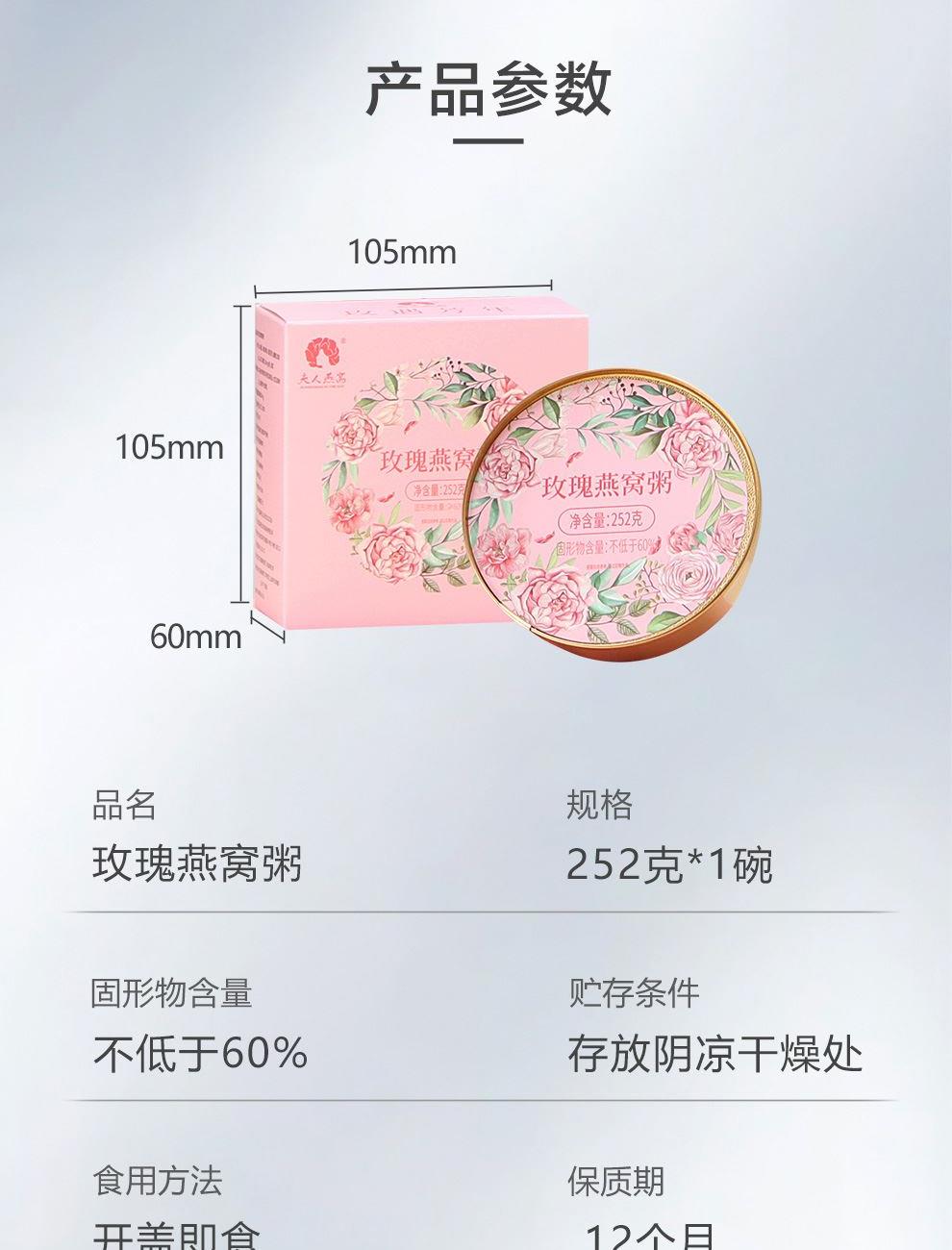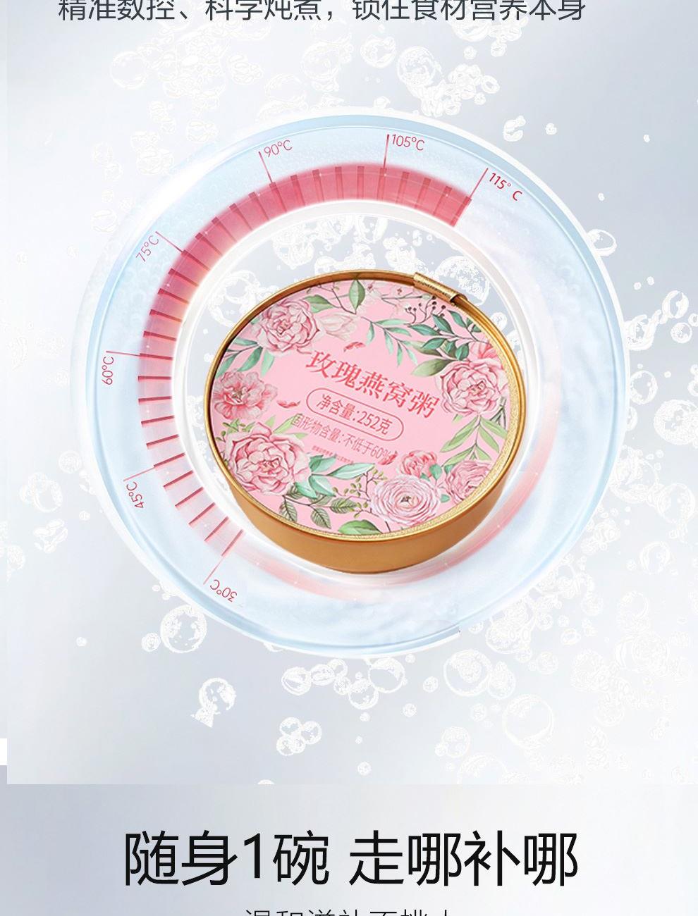 规格:252克*1碗、固形物不低于60% 卖点:玫瑰燕窝粥凭借 “燕窝的滋补 + 玫瑰的芬芳 + 粥品的温润” 三重优势,打破传统养生食品的单一属性,成为早餐、下午茶、产后调理等场景的优选。