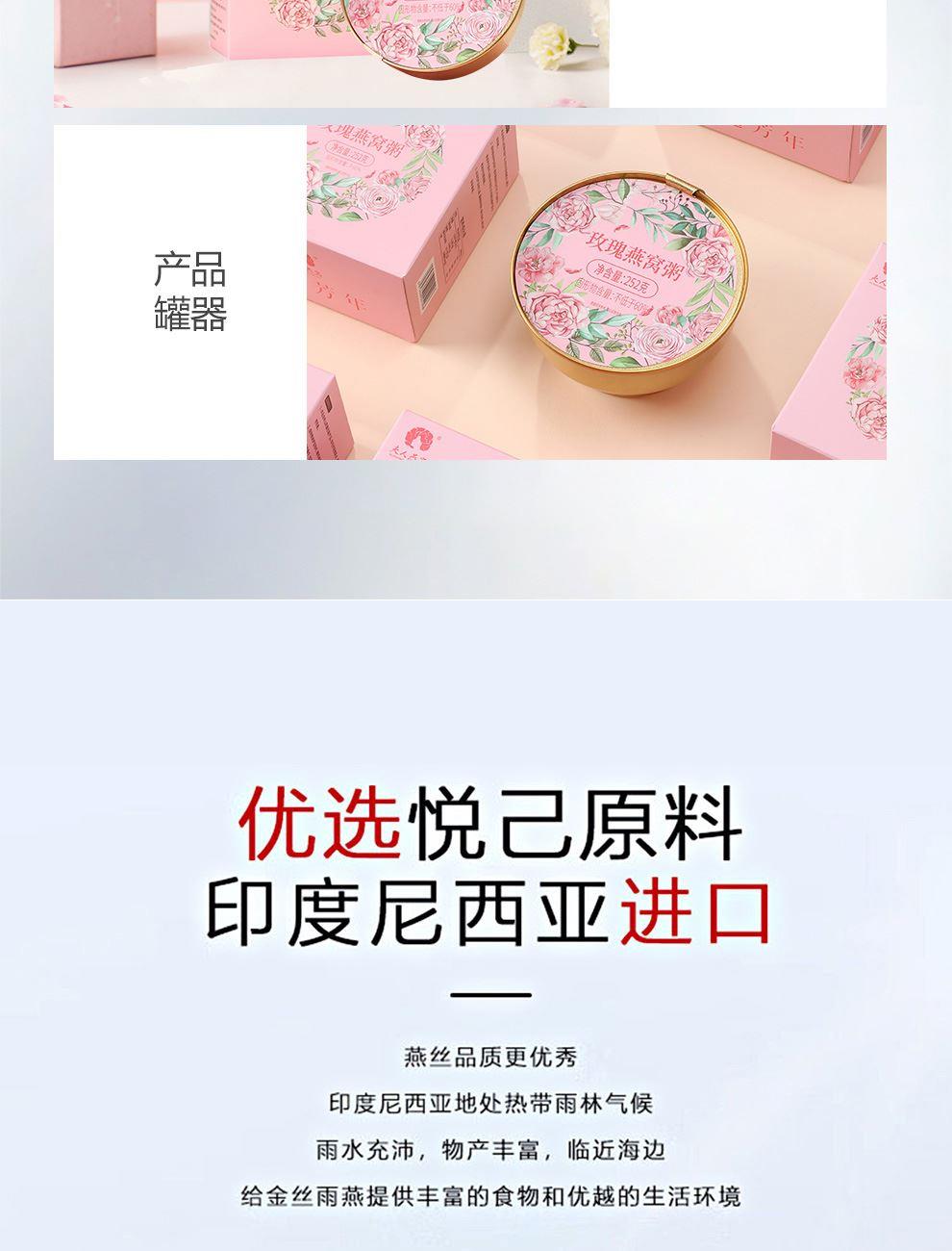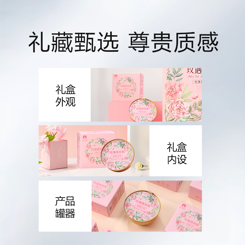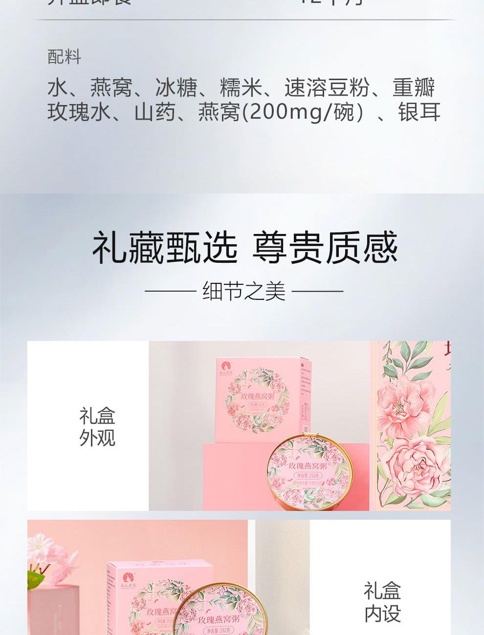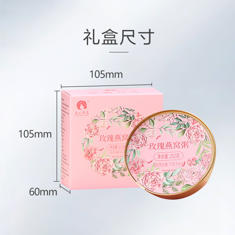 规格:252克*1碗、固形物不低于60% 卖点:玫瑰燕窝粥凭借 “燕窝的滋补 + 玫瑰的芬芳 + 粥品的温润” 三重优势,打破传统养生食品的单一属性,成为早餐、下午茶、产后调理等场景的优选。