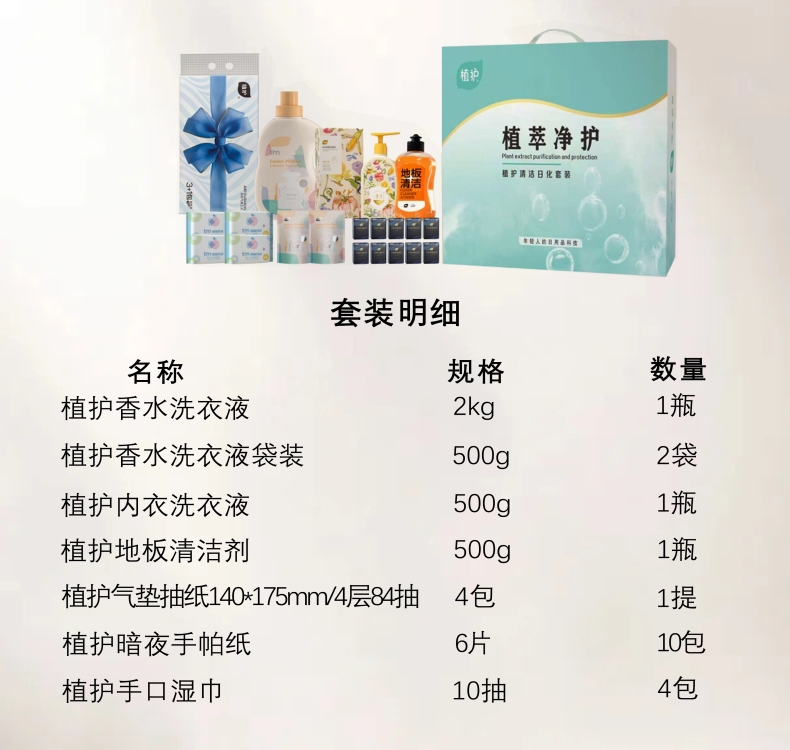 1.除螨,去渍柔护,低泡易漂,省心洁净; 2.蕴含洋甘菊滋养精华,有效舒缓肌肤敏感紧绷,保护肌肤水分屏障; 3.四层压合紧密,纤维排列细致,拉扯不易破; 4.纸质绵柔细腻,擦拭不留屑,亲肤零刺激; 5.深层补水保湿,密集水润,改善手部粗糙; 6.采用纯净生态海盐,天然清洁力强; 7.添加表面活性剂和污渍乳化剂,去污能力。 棉柔巾尺寸:150X200mm 销售规格:香水洗衣液2kg瓶装*1瓶+洗衣液袋装500g*2袋+内衣洗衣液500g*1瓶+地板清洁剂500g*1瓶+气垫抽纸4包/提*1提+手口湿巾10抽*4包+暗夜手帕纸6片*10包 产品毛重: 保质期:3年