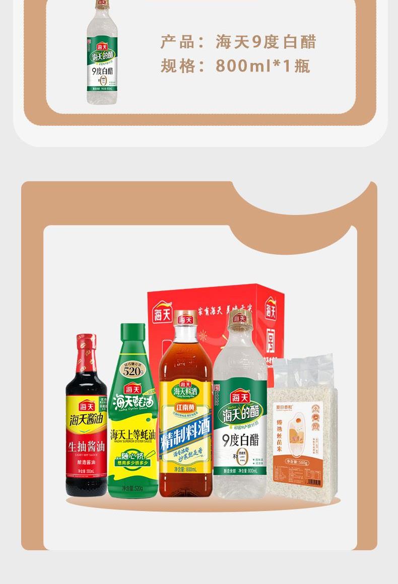 配置: 海天生抽酱油500mL(PET瓶)*1瓶 海天精制料酒800mL(PET瓶)*1瓶 海天9度白醋800mL(PET瓶)*1瓶 海天上等蚝油520g(PET瓶)*1瓶 夏日香粒臻选丝苗米500g(真空装)*1袋 卖点: 可选产品丰富多样,礼箱随心组合,多种价位因需而定,充分满足各种送礼需求,是商务送礼、单位福利的用心之选。