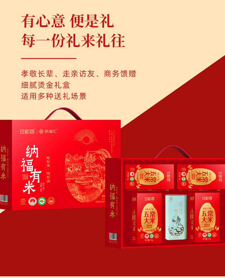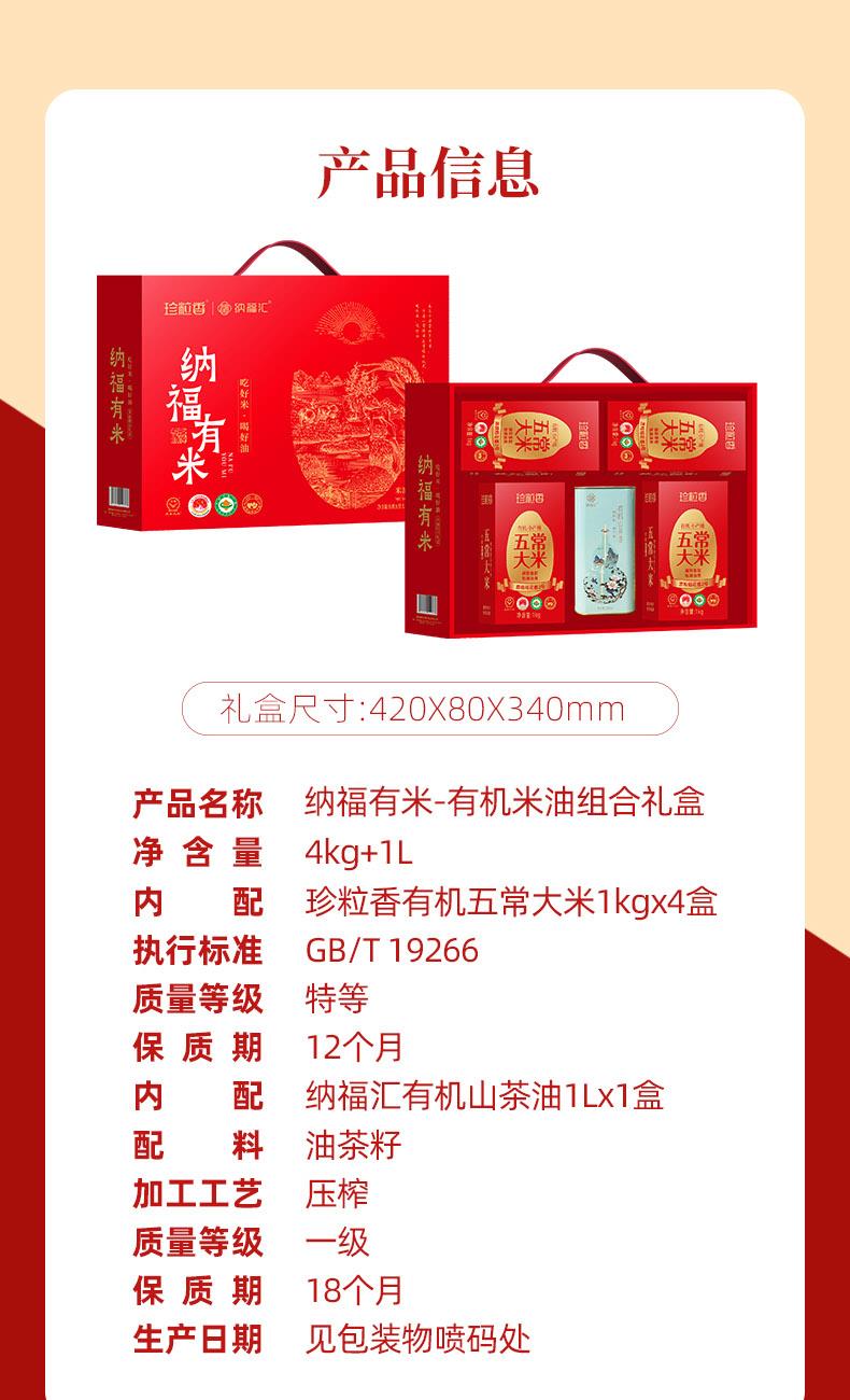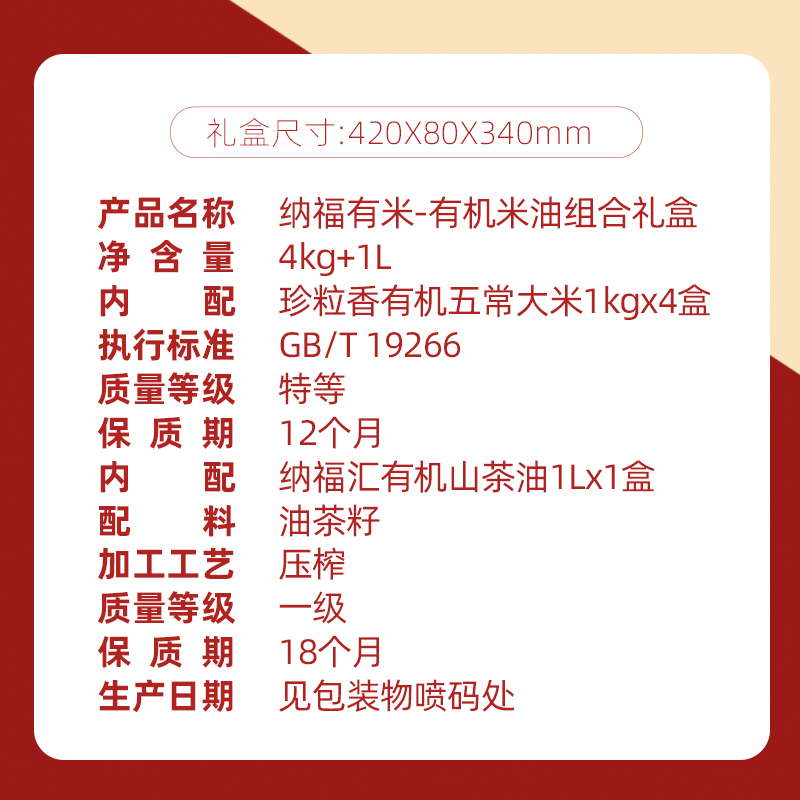 产品规格:有机小产地五常大米1kgX4+ 有机山茶油1L(铁罐装) 产品包装:米砖+油+礼盒 产品规格:4盒/箱 产品尺寸:420*80*340mm 条 码:6976641150364 发 货 地:浙江省丽水市 推荐理由: 1、有机五常大米大米+有机山茶油组合 2、限定五常龙凤山有机小产地生产 3、软糯香甜,口感劲糯 4、有机山茶油选自浙江丽水长寿之乡 5、有机山茶油口味香醇,色泽金黄