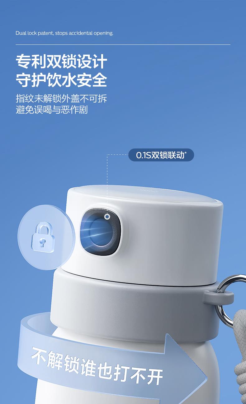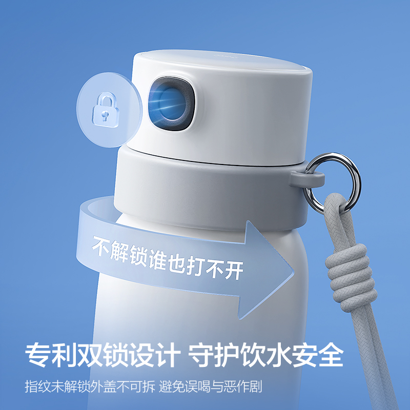 主要材质:不锈钢 容量:560mL 充电电压/电流:5V⎓1A 指纹识别开盖,个体专用;仅管理员可修改 温度可视,1s识别指纹弹盖 SUS316L内胆+SUS304外壳 带吸管、杯套(选配)15h保温