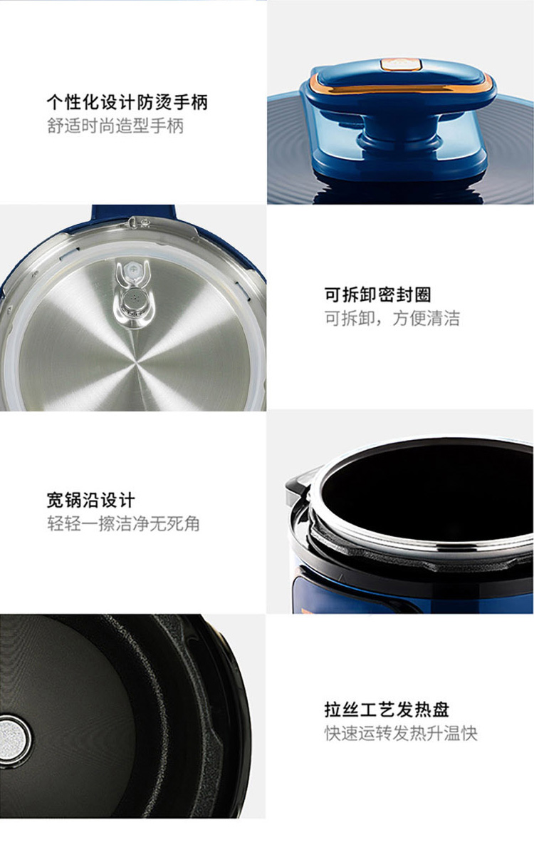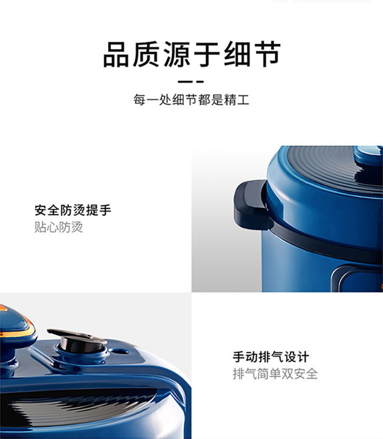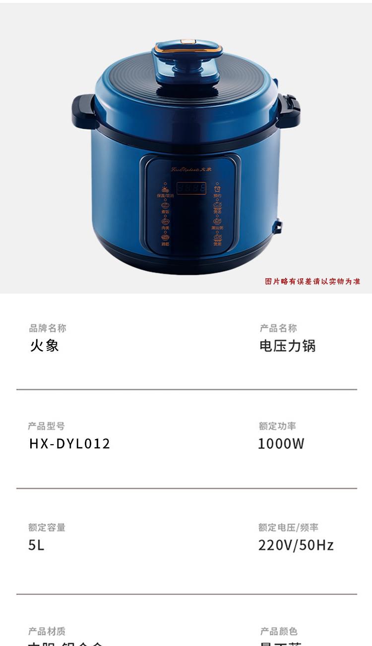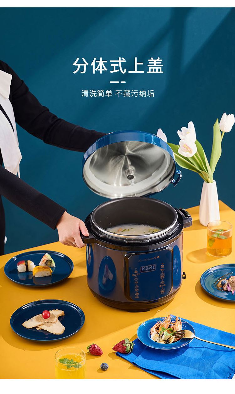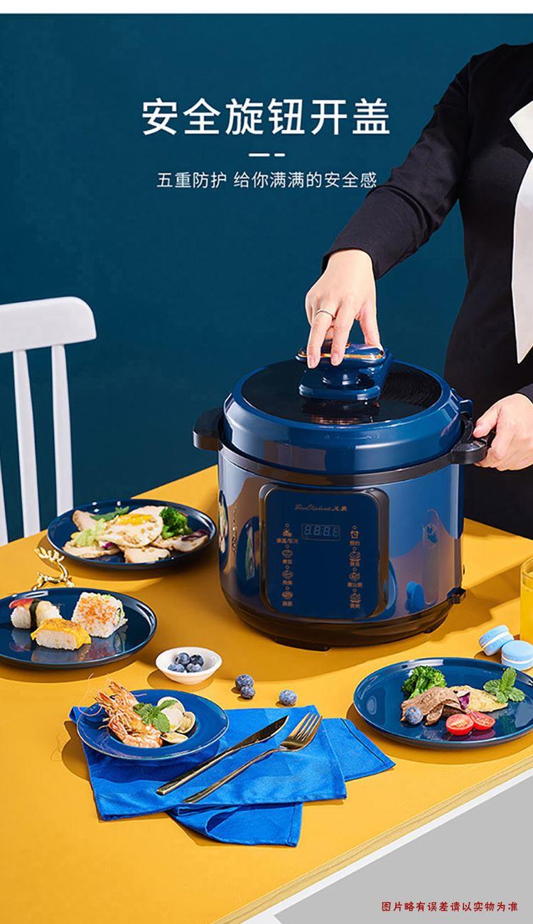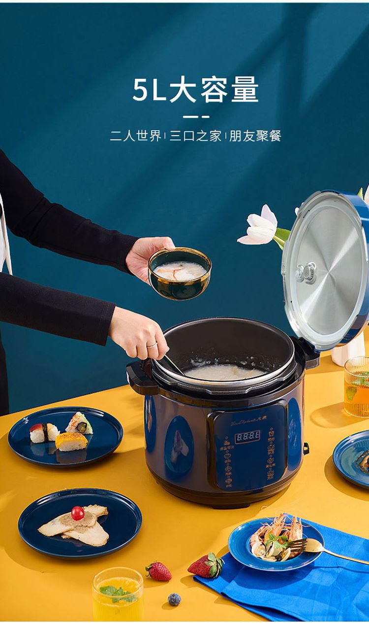 额定功率:1000W 额定电压:220V~ 额定频率:50 Hz 额定容量:5L 产品净重:3.95㎏/4.65㎏ 产品材质:内胆-铝合金,外壳-马口铁覆膜板, 塑料件-PP 产品颜色:垦丁蓝 产品规格:335*310*330mm 彩盒尺寸:315*315*360mm 外箱尺寸:645*325*735mm 多种烹饪功能,煮饭、煲粥、蛋糕、炖煮等。 预约定时功能,享受美味佳肴。 分体设计,可拆卸密封圈,清洗更方便。 55千帕超强压力设计,比普通电压力锅更高压力,更节能省时。 台湾垦丁蓝专色设计,外观典雅。