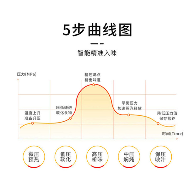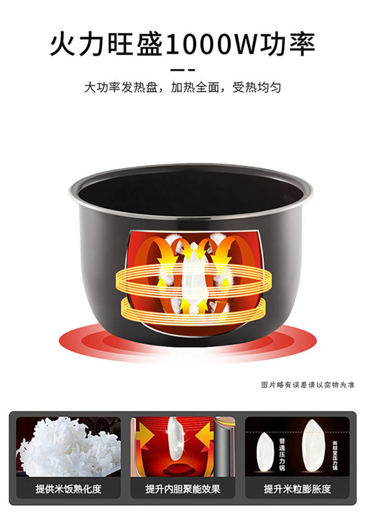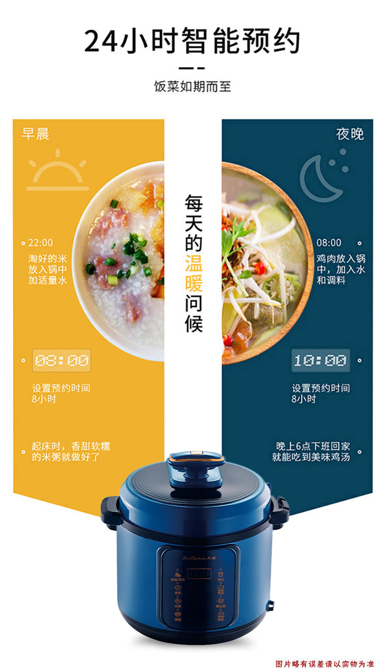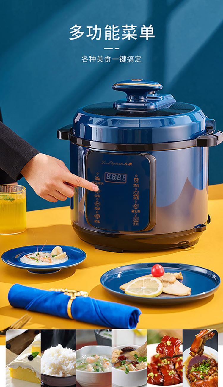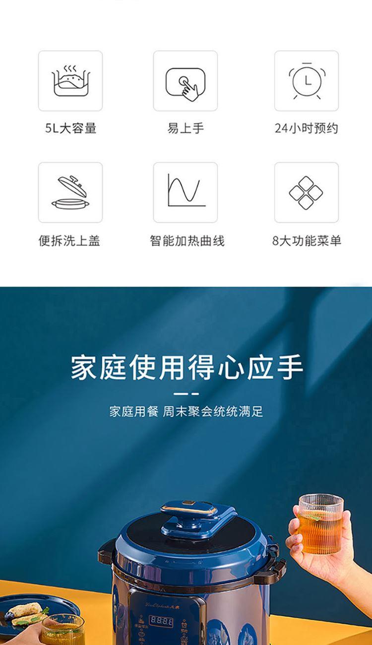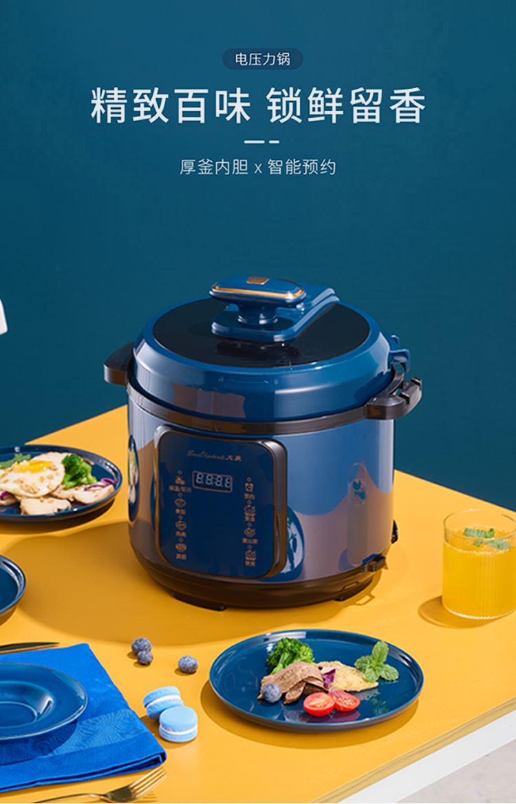 额定功率:1000W 额定电压:220V~ 额定频率:50 Hz 额定容量:5L 产品净重:3.95㎏/4.65㎏ 产品材质:内胆-铝合金,外壳-马口铁覆膜板, 塑料件-PP 产品颜色:垦丁蓝 产品规格:335*310*330mm 彩盒尺寸:315*315*360mm 外箱尺寸:645*325*735mm 多种烹饪功能,煮饭、煲粥、蛋糕、炖煮等。 预约定时功能,享受美味佳肴。 分体设计,可拆卸密封圈,清洗更方便。 55千帕超强压力设计,比普通电压力锅更高压力,更节能省时。 台湾垦丁蓝专色设计,外观典雅。