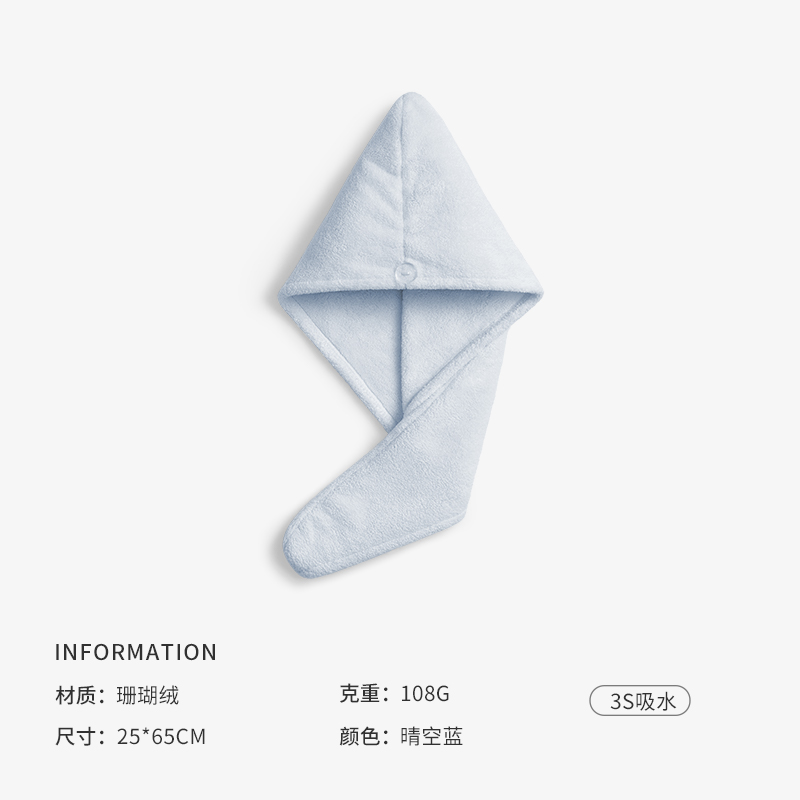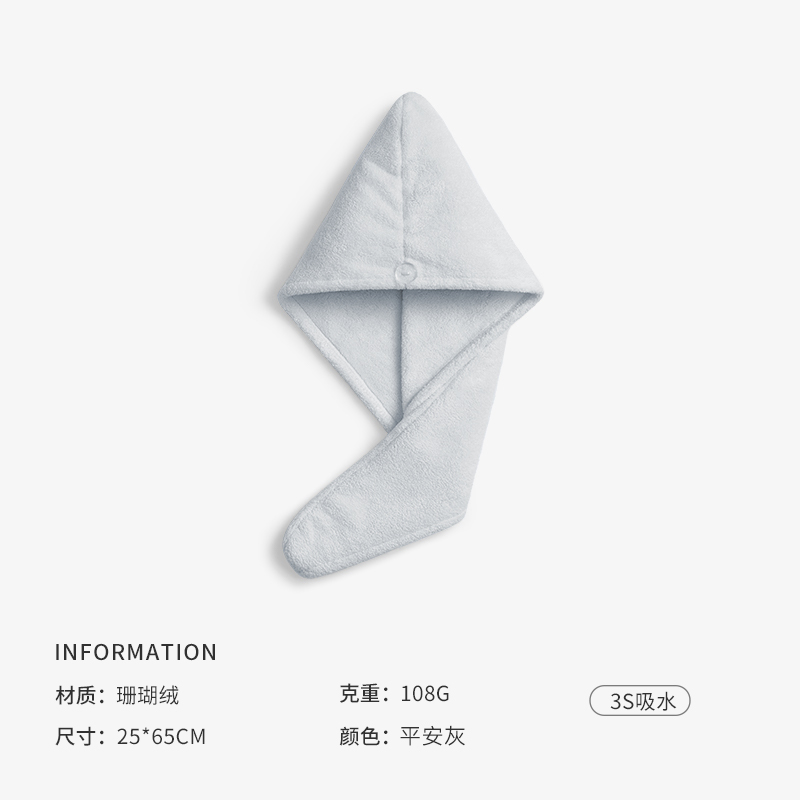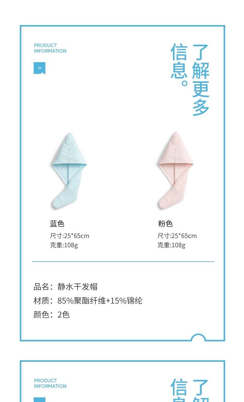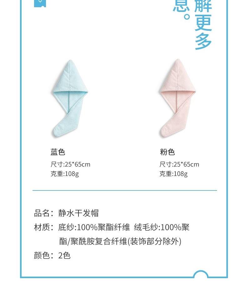 规格:25cm*65cm*1条 重量:108g/条*1条 颜色:蓝、粉、桃花粉、奶油米、晴空蓝、山岚绿、香芋紫、平安灰 材质:底纱:聚酯纤维 绒毛纱:聚酯/聚酰胺复合纤维(装饰部分除外) 平方克重:400 包装内容:静水干发帽 1条 1、采用加厚珊瑚绒面料,质地细腻,手感柔软,不易起球,不易掉色,吸水强劲。 2、加厚配置,加密长绒,吸水面积扩大,吸水力更足,让湿发在短时间内变得干爽 3、牢固纽扣设计,不易脱落,使用后方便悬挂。长尾设计,轻松包裹。