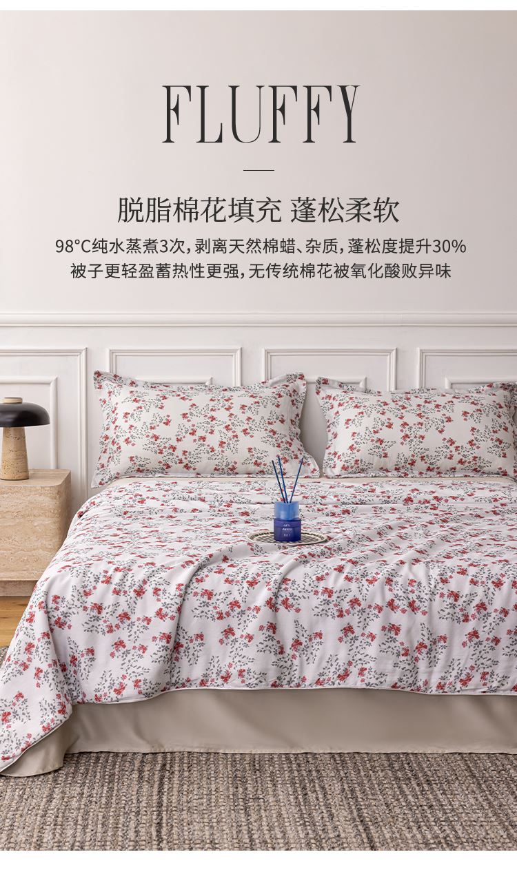商品参数: 面料:100棉 填充:100棉(脱脂棉花) 填充克重: 320g 规格:150*200cm(200*230可订制)