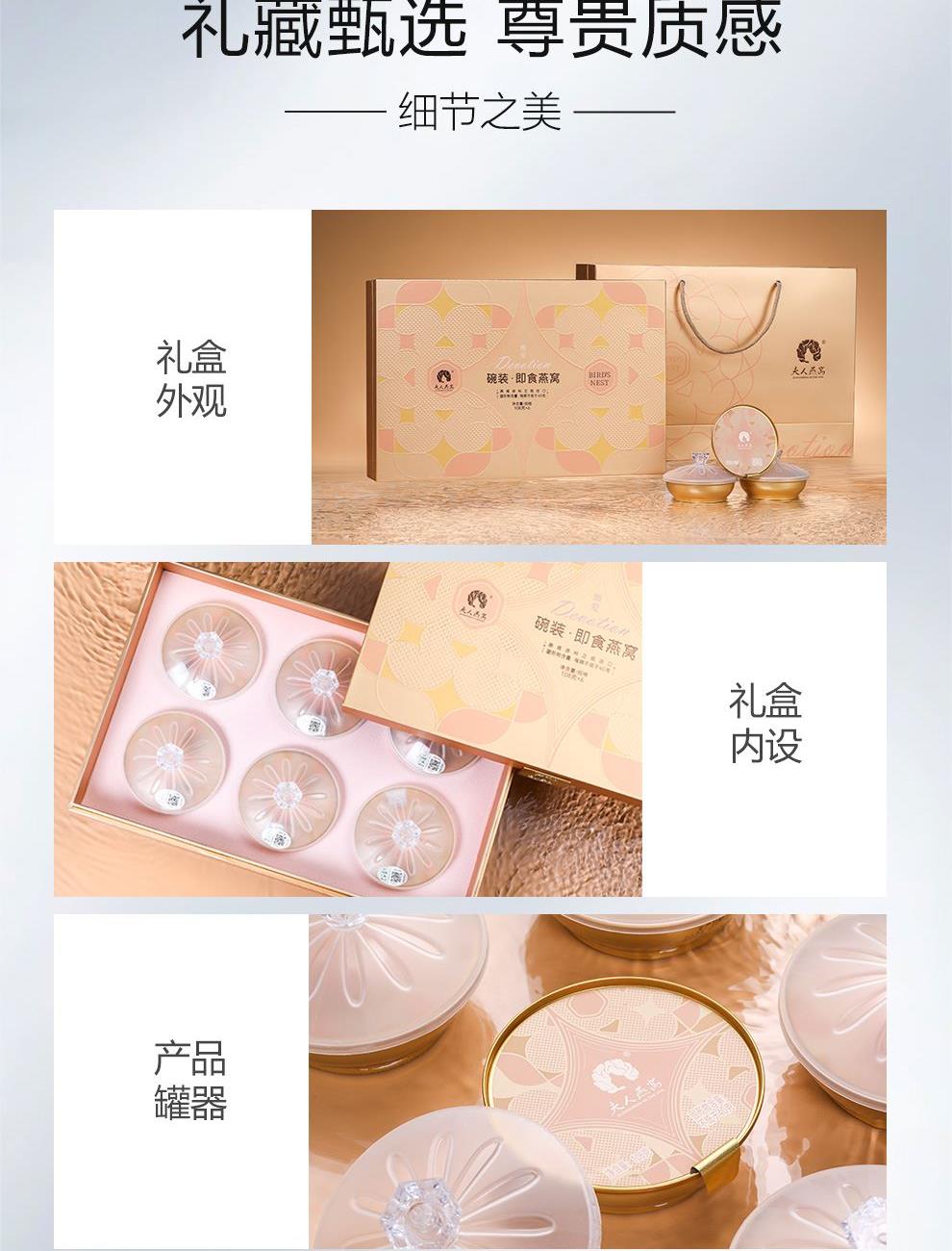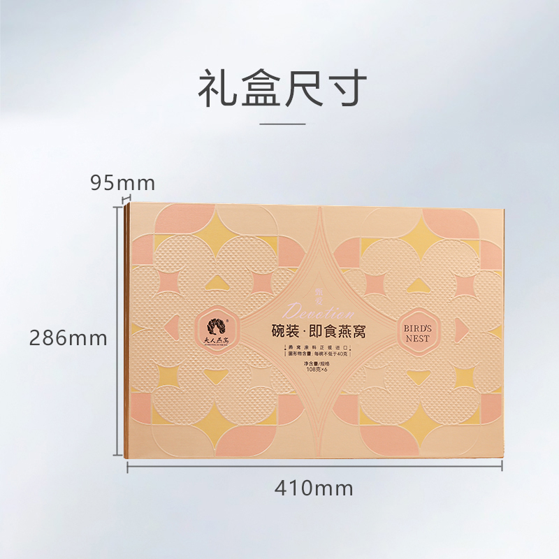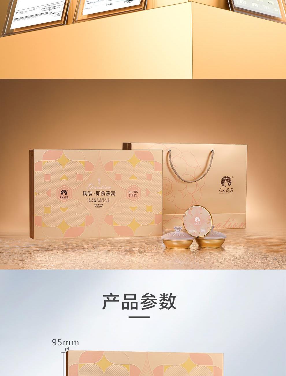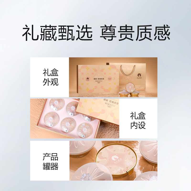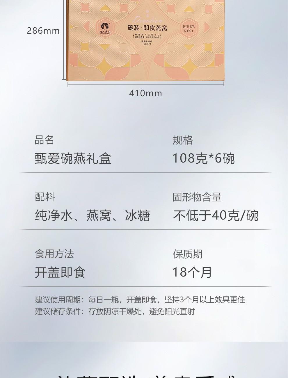 规格:648克(108克*6碗)、每碗不低于40克 卖点: 燕窝原料精选马来西亚、印尼森林雨季燕盏,洁净度更高,泡发率更好。121℃,1140秒数控,科学炖煮,保留燕窝营养,口感细腻爽滑。坚持 0添加 0色素 0防腐剂,孕妈和宝宝也可以放心享用。一瓶一码可溯源,开盖即食,开启滋补。