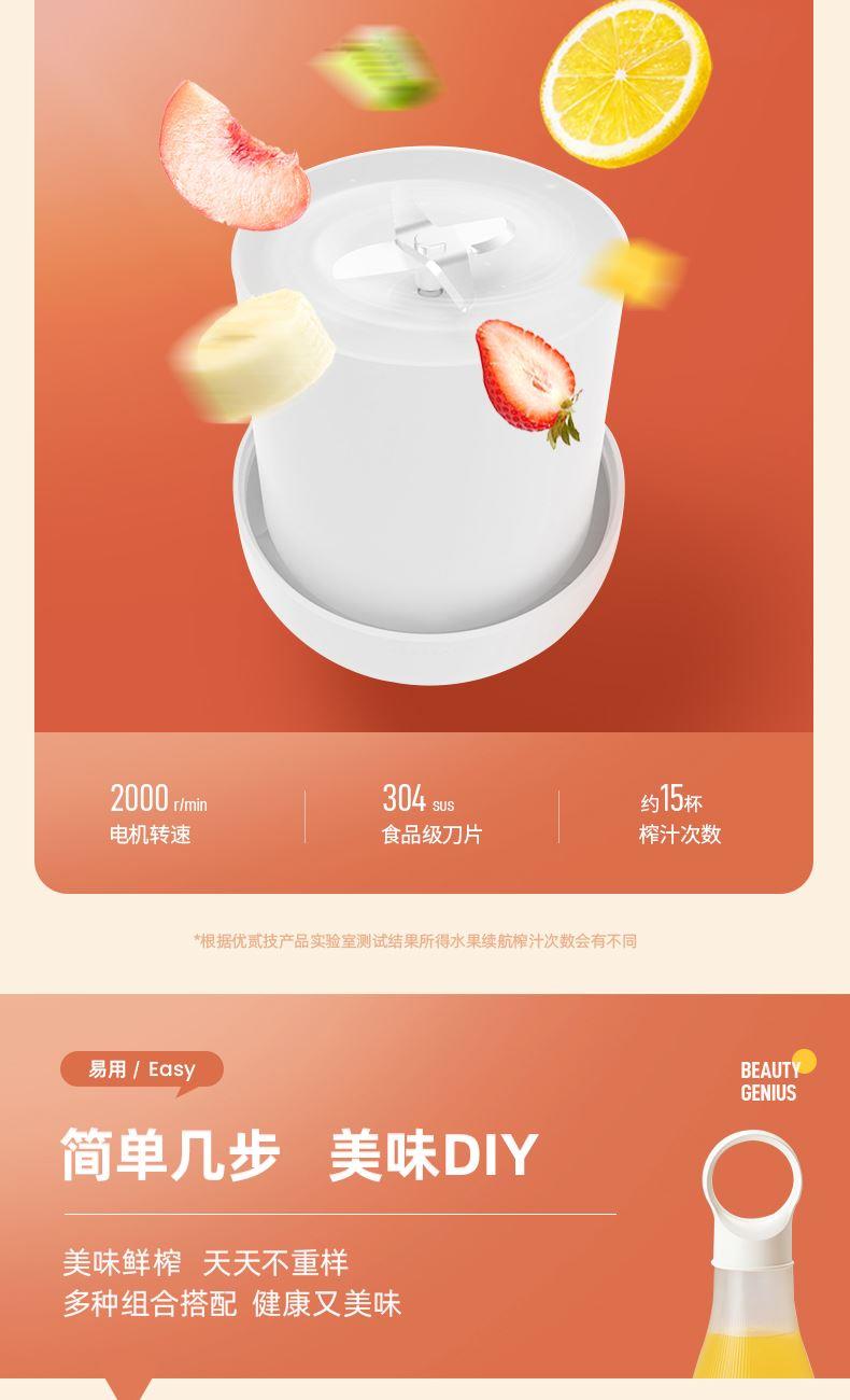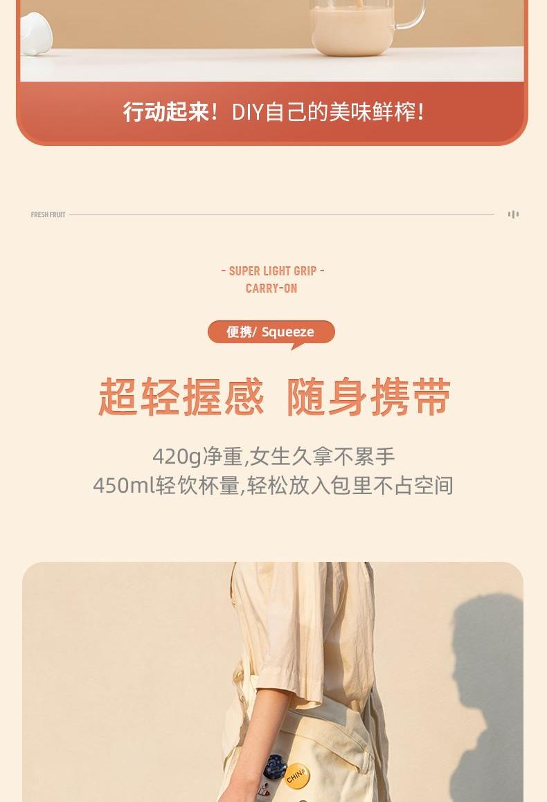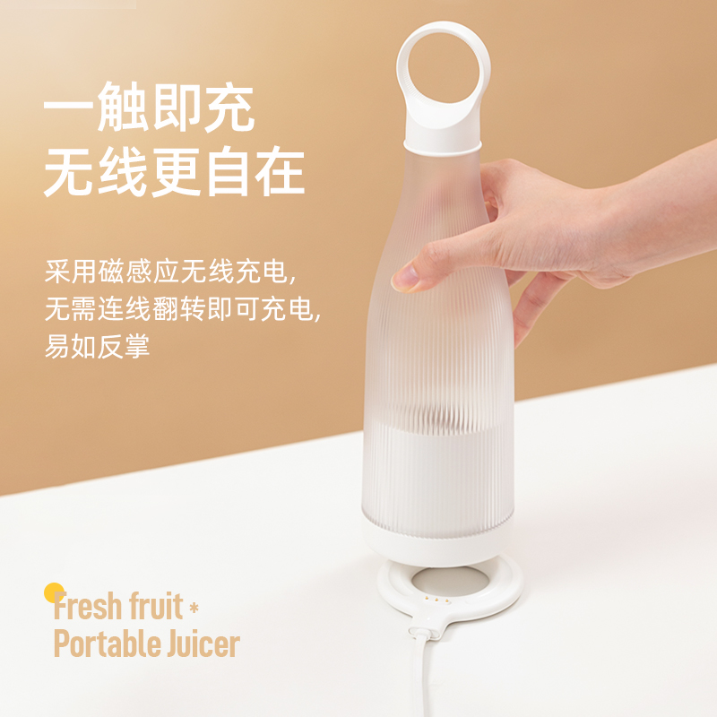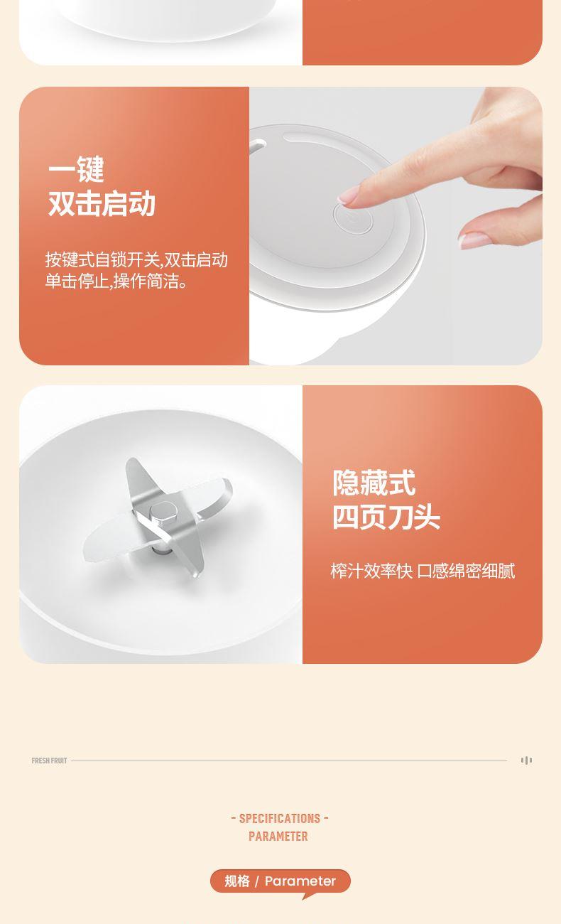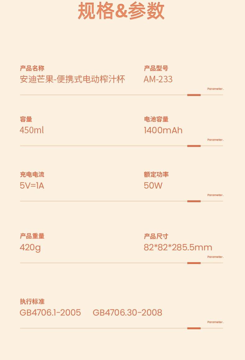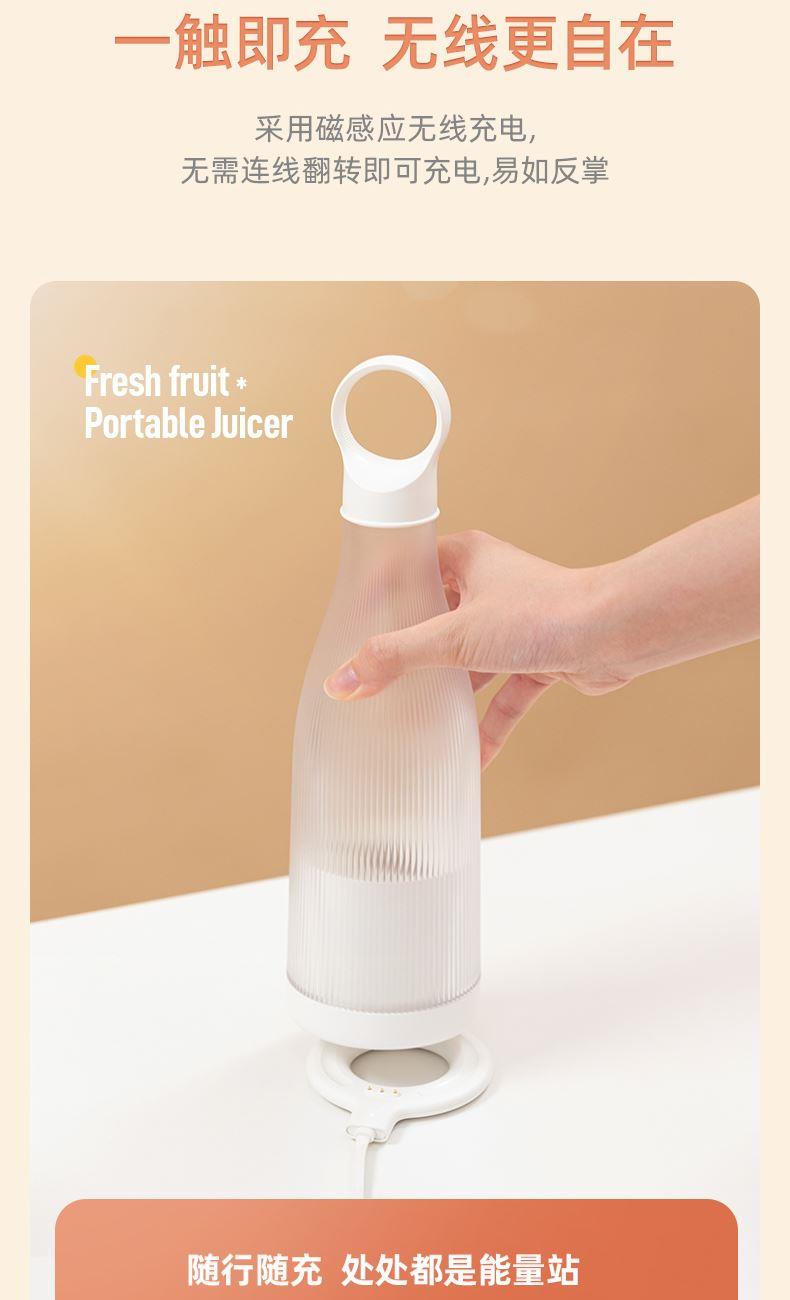 产品刀片:四叶刀头容 量:450ml电池电压:7.4V电池容量:1400mAh充电电压:5V=1A额定功率:50W 产品尺寸:82*82*285.5mm 包装尺寸:100*100*320mm 成品裸重(克):420g 毛重:577g 隐藏四页刀头 超轻握感,随身便携 无线充电,持久续航