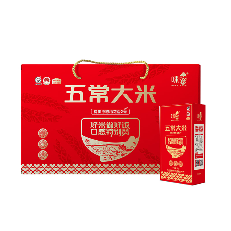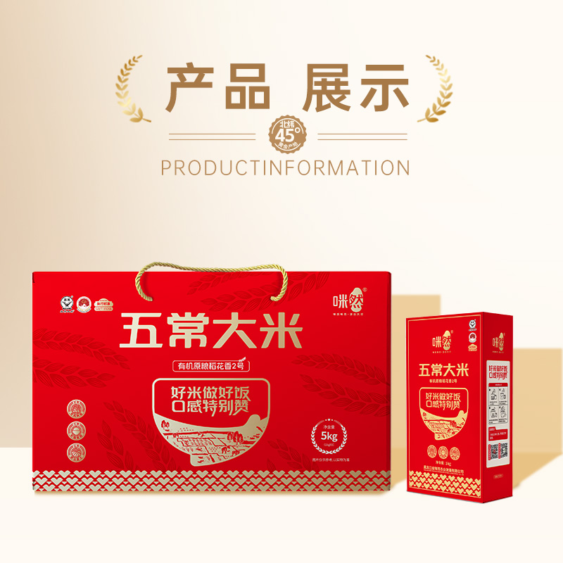 产 品 : 五常大米-有机原粮稻花香2号礼盒5kg 执行标准 :GB/T 19266 保 质 期 :12个月 产 地 :黑龙江省五常市 箱 规 :4*5kg
