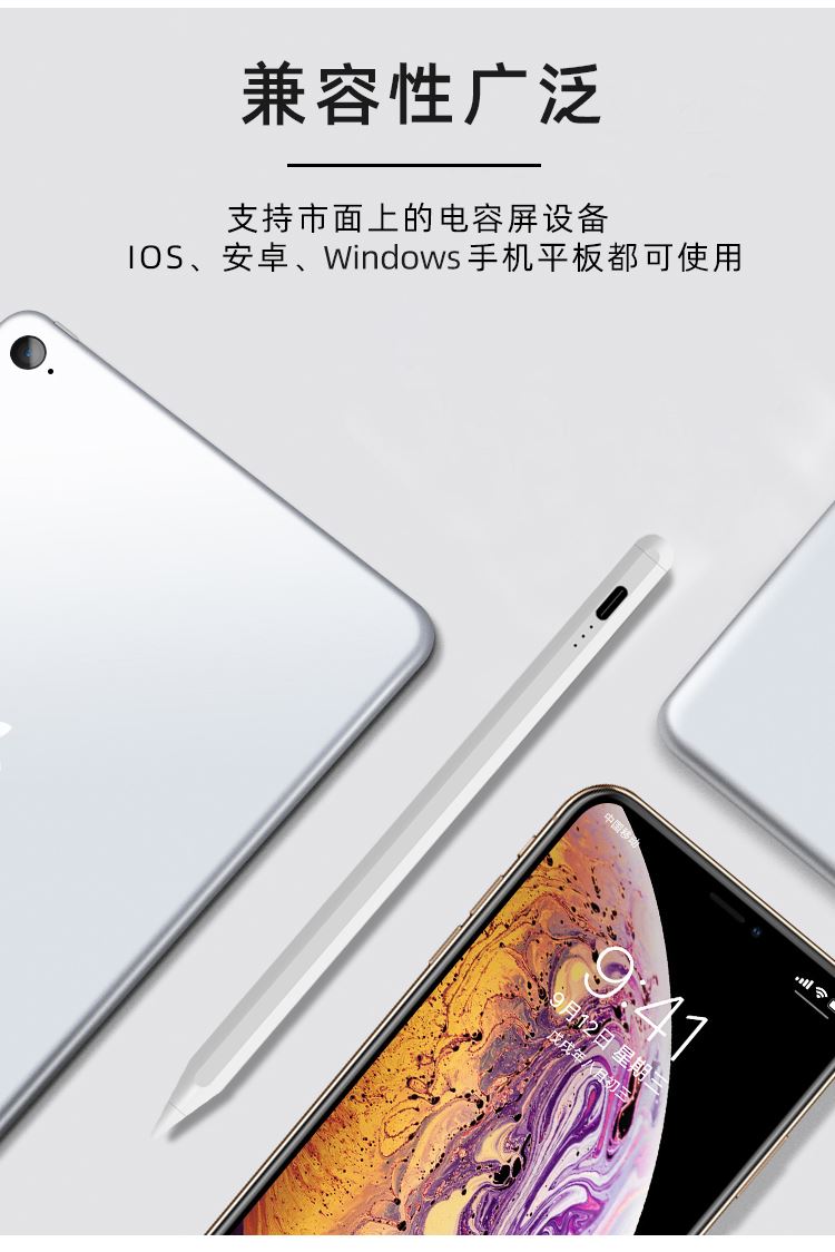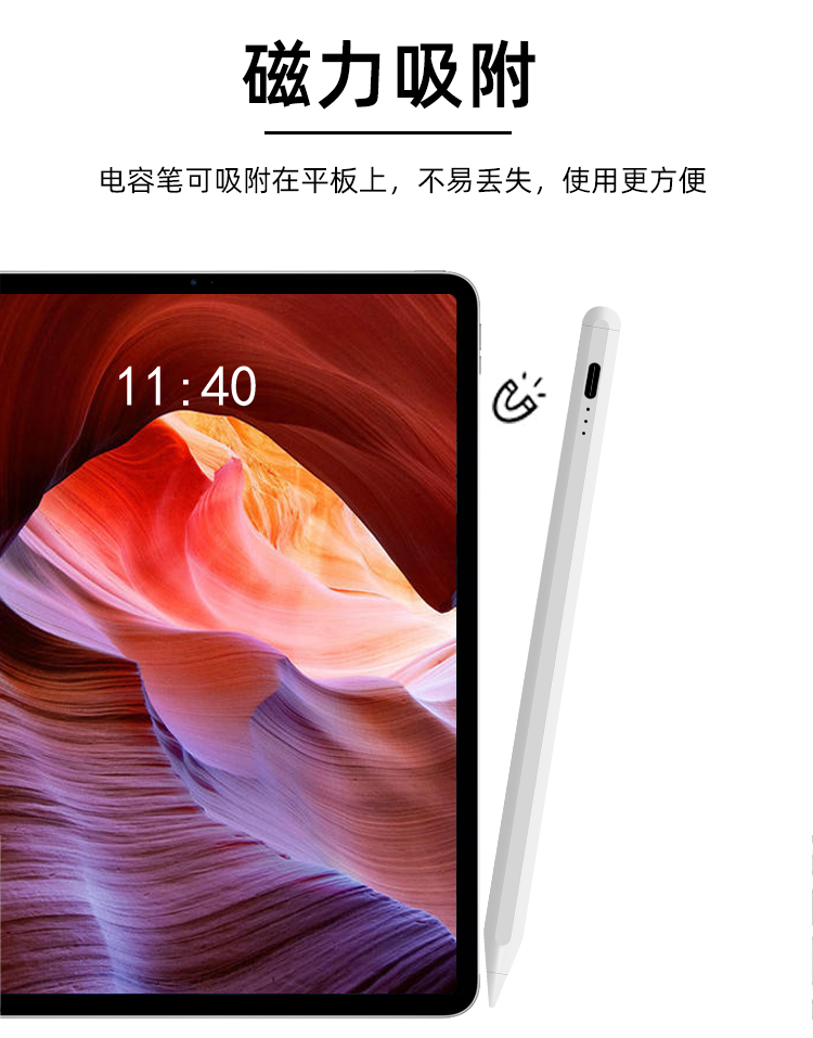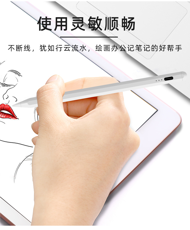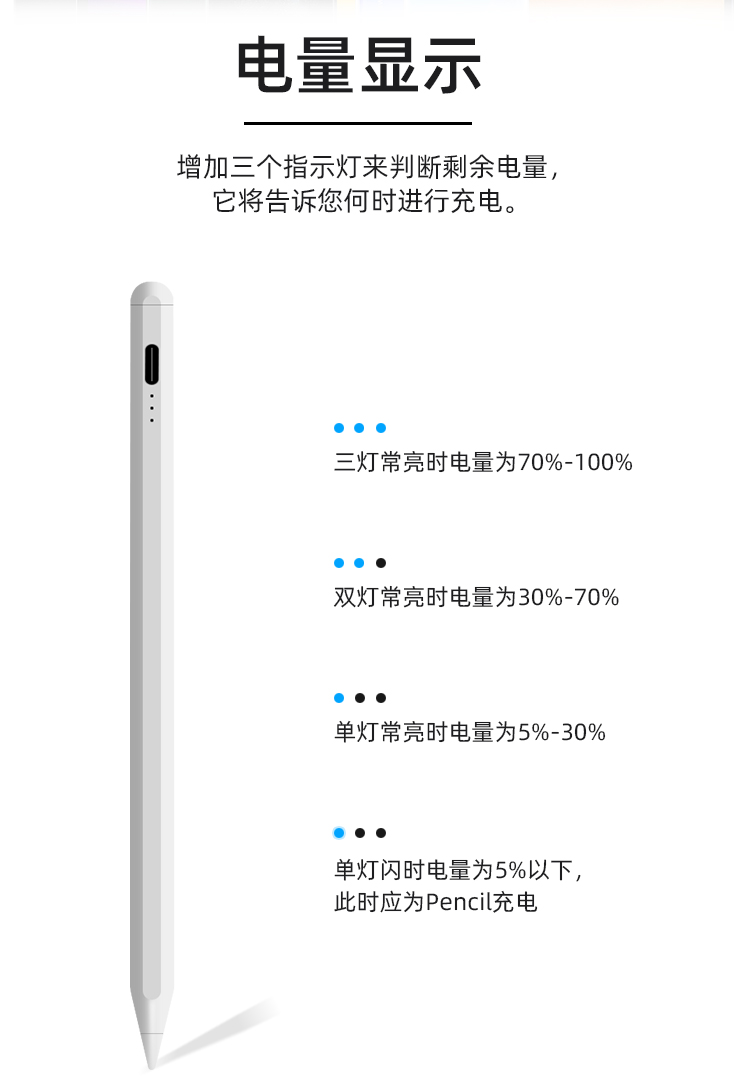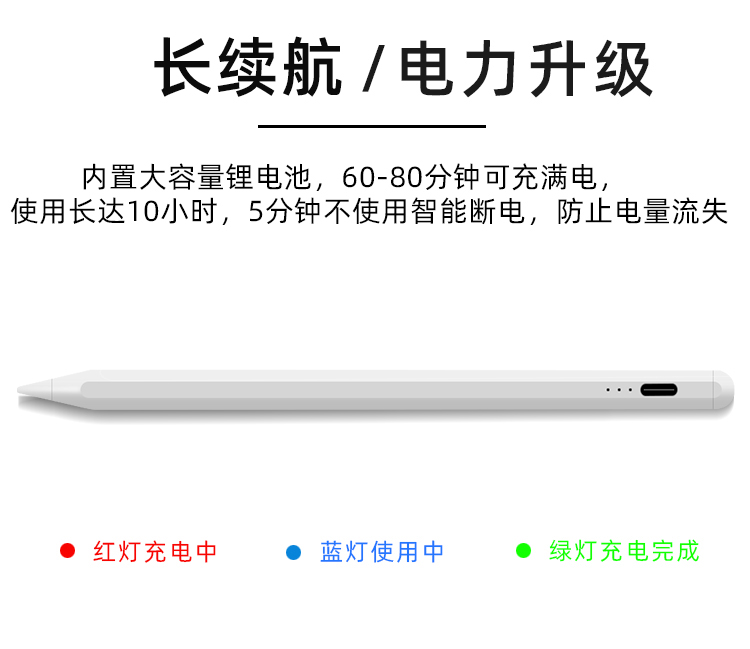 1.Pencil同款笔尖进口POM材质笔头,与官网同款材质提升了绘画书写灵敏性,写字声音小不怕折断,不会对屏幕产生损伤。 2.使用灵敏顺畅不断线,犹如行云流水,绘画办公记笔记的好帮手。 3.笔头可拆卸更换,可吸附ipad.长续航/电力升级,内置大容量锂电池,60-80分钟可充满电,使用长达10小时,5分钟不使用智能断电,防止电量流失. 红灯充电中●蓝灯使用中●绿灯充电完成产品信息 产品尺寸主动式电容笔 166mm*9mm 兼 容ioS/Windows/安卓系统平板与手机 充电方式Type-c线连接