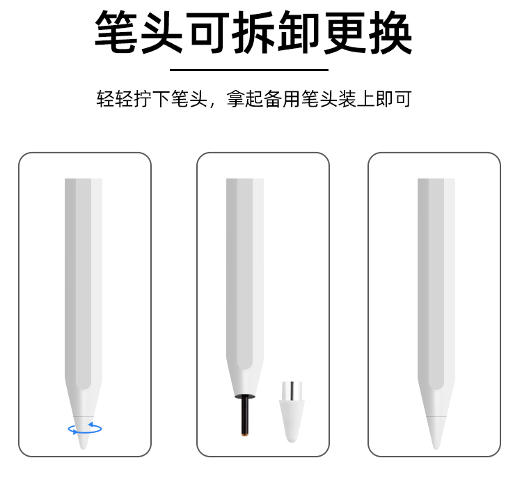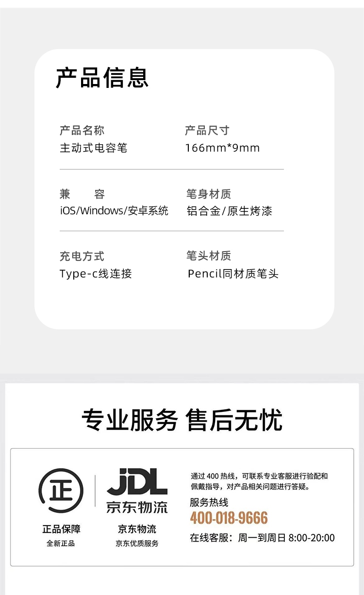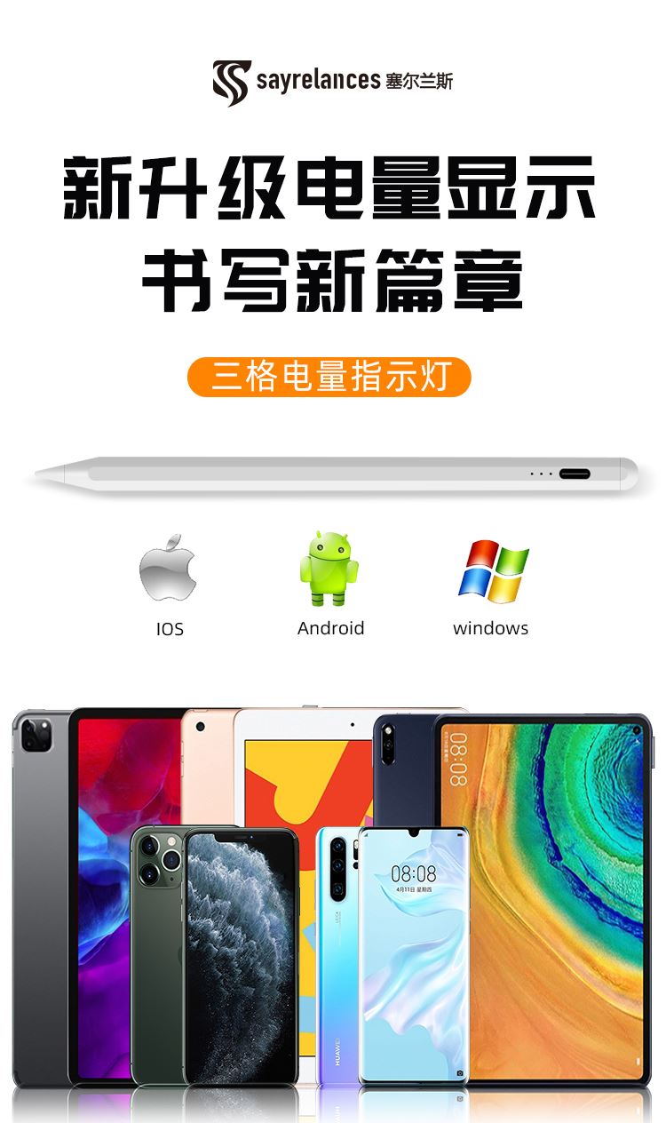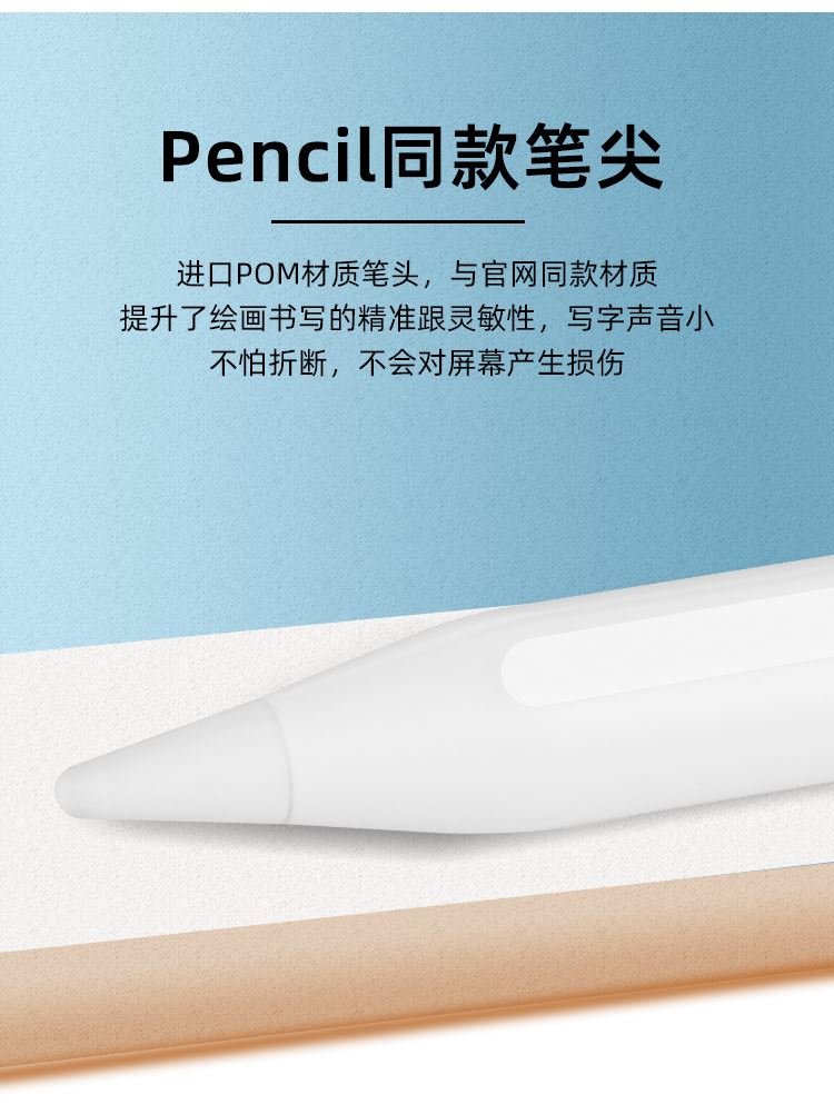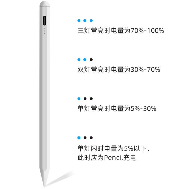 1.Pencil同款笔尖进口POM材质笔头,与官网同款材质提升了绘画书写灵敏性,写字声音小不怕折断,不会对屏幕产生损伤。 2.使用灵敏顺畅不断线,犹如行云流水,绘画办公记笔记的好帮手。 3.笔头可拆卸更换,可吸附ipad.长续航/电力升级,内置大容量锂电池,60-80分钟可充满电,使用长达10小时,5分钟不使用智能断电,防止电量流失. 红灯充电中●蓝灯使用中●绿灯充电完成产品信息 产品尺寸主动式电容笔 166mm*9mm 兼 容ioS/Windows/安卓系统平板与手机 充电方式Type-c线连接