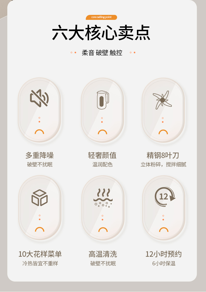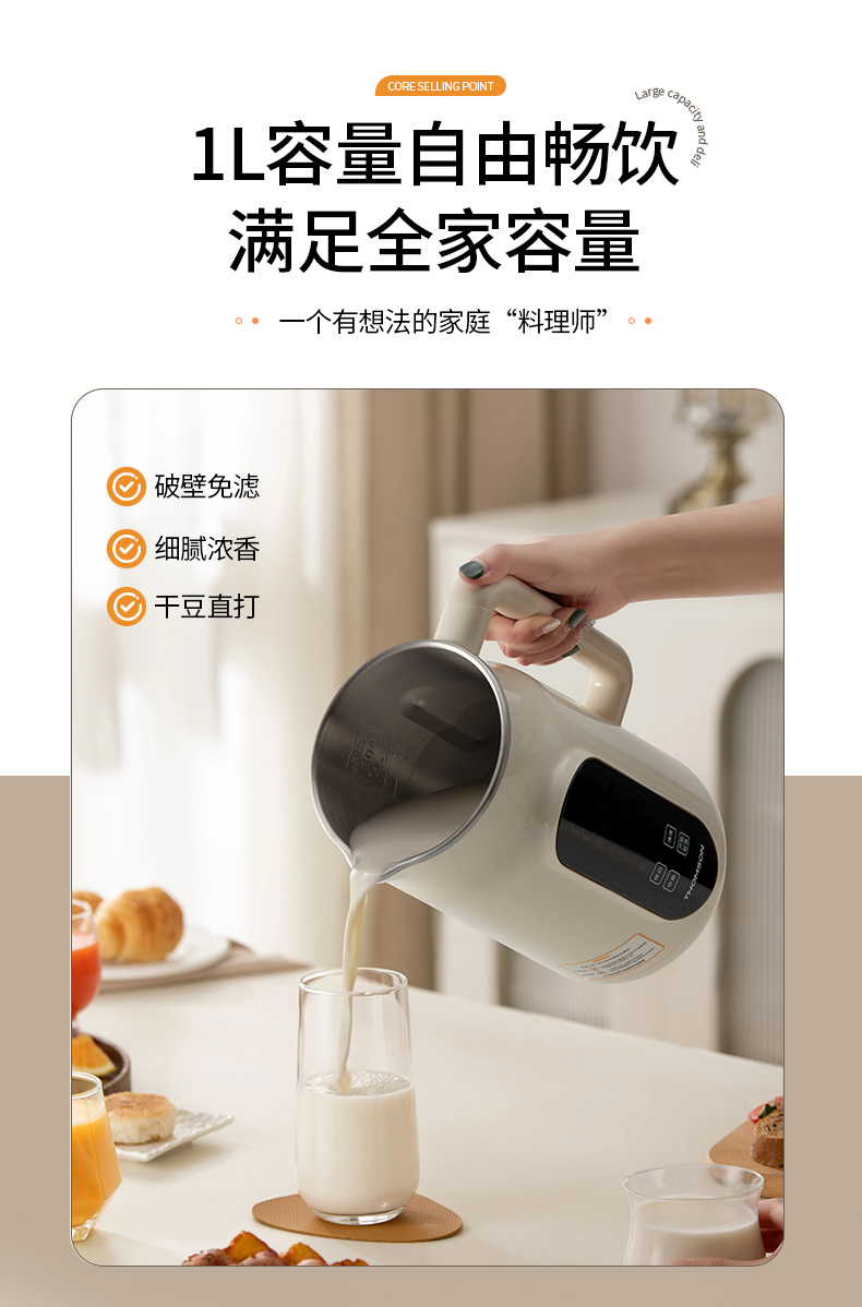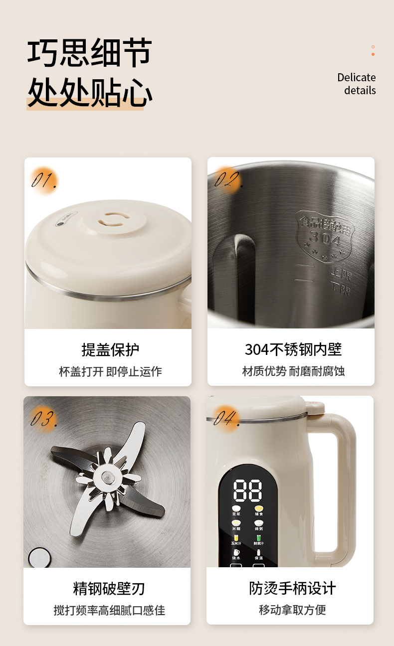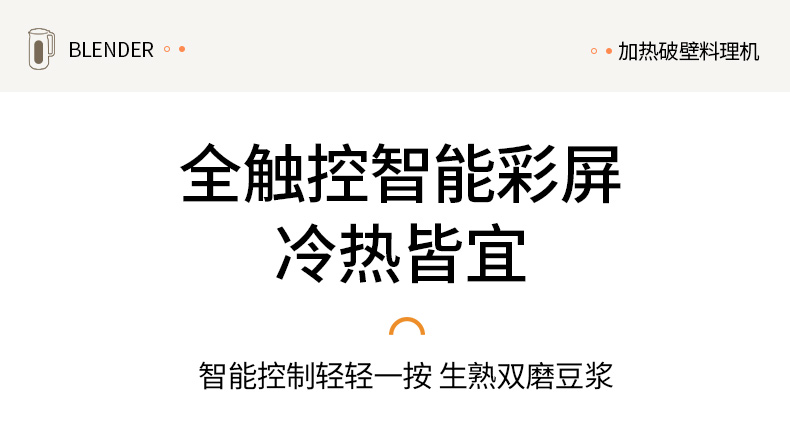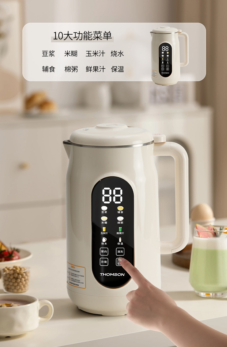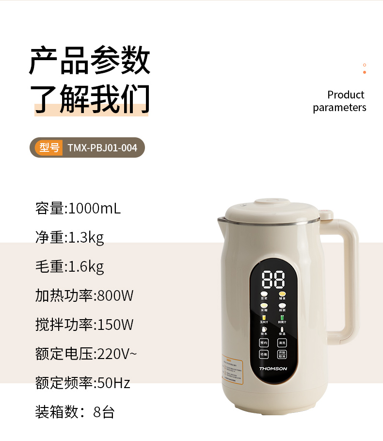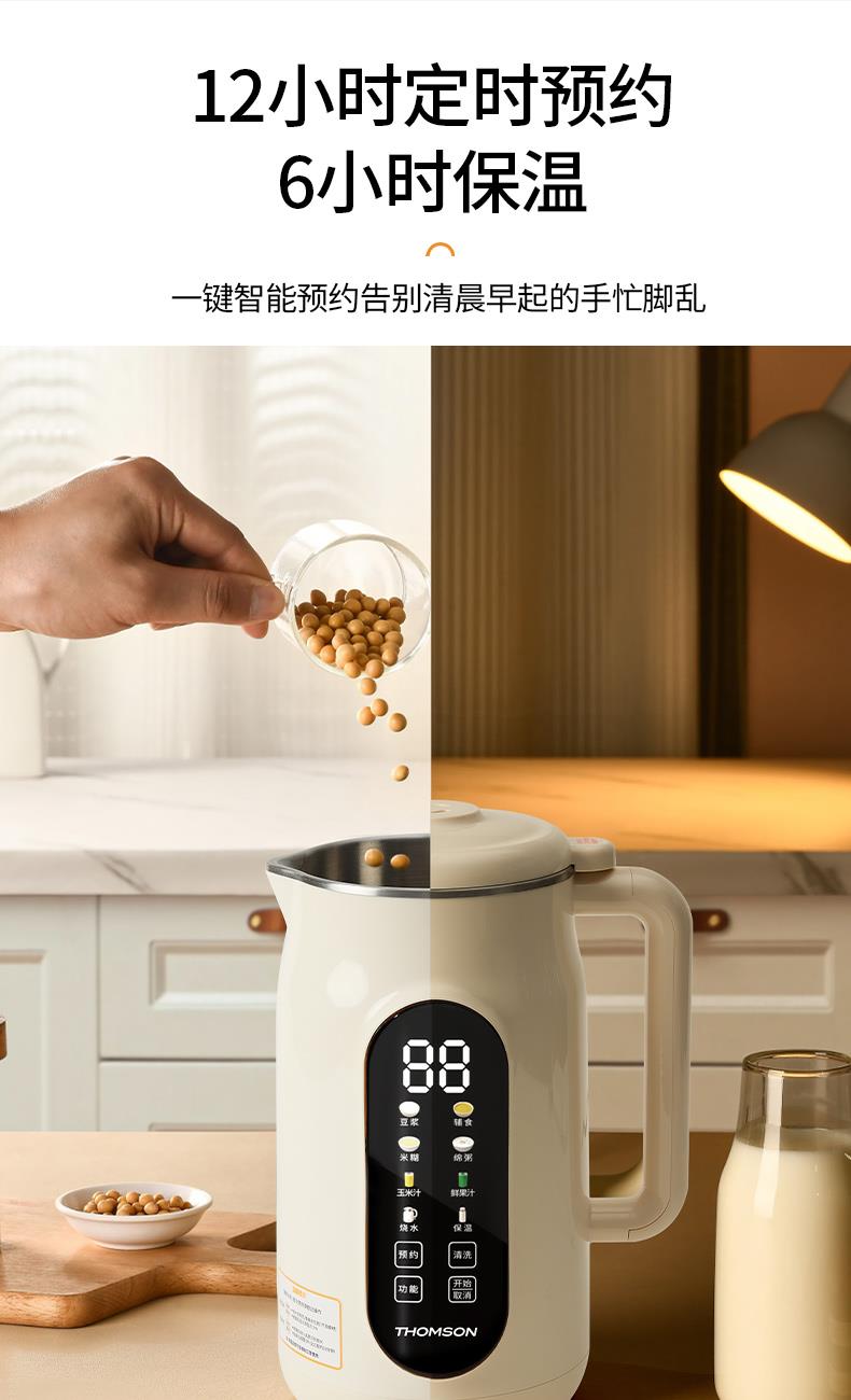 产品参数: 额定容量:1000mL 净重:1.3kg 毛重:1.6kg 加热功率:800W 搅拌功率:150W 额定电压:220V~ 额定频率:50Hz 彩盒尺寸:200*198*340mm 外箱尺寸:542*473*271mm 产品卖点: 1L容量,满足全家容量 全触控智能彩屏 10大功能菜单,冷热皆宜随心选 一键高温清洗,解放双手,省时省力 12小时预约+6小时保温