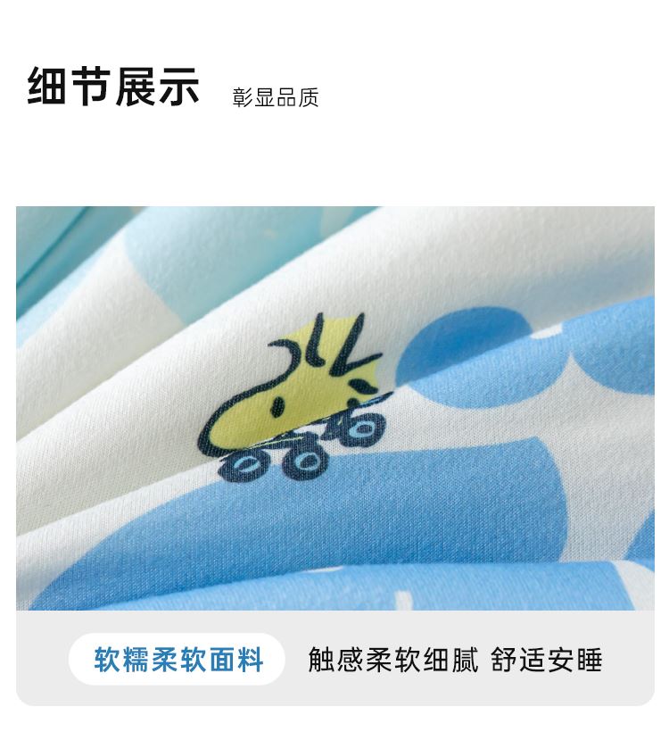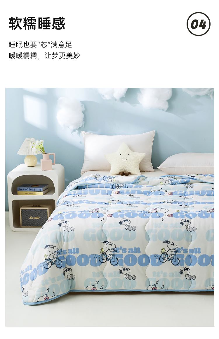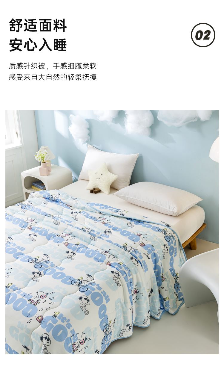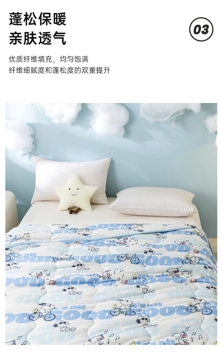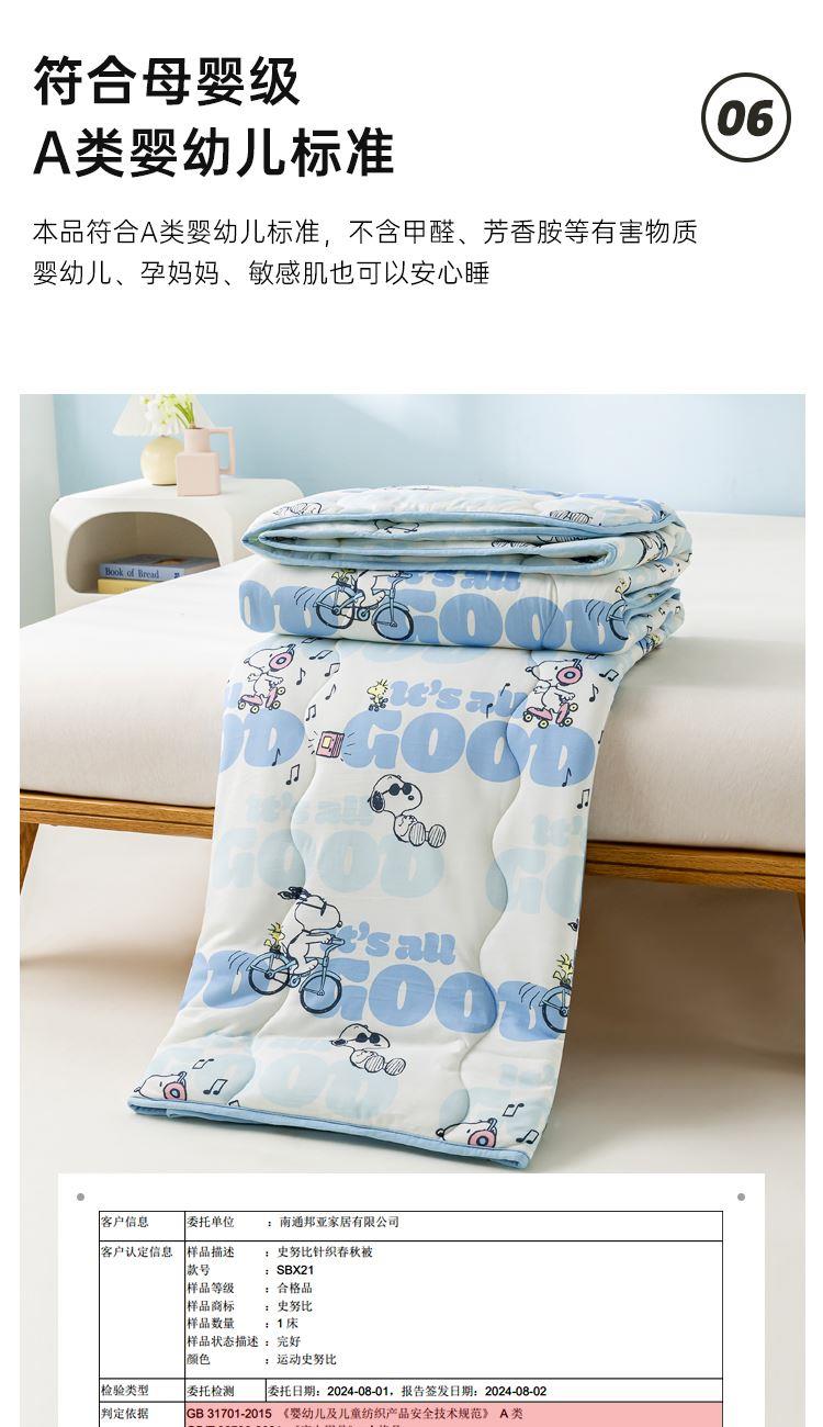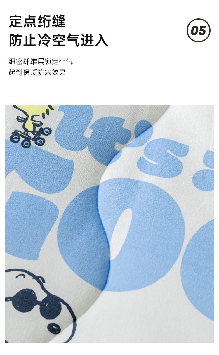 商品货号:SBX21 商品面料:聚酯纤维 填充材质:聚酯纤维 整张纤维填充 亲肤不压身 蓬松透气 轻柔舒适 吸湿不闷热 严密针脚 不易起坨 精致包边 活性印染 史努比卡通图案印花 鲜艳花色 点缀家居 高颜值床品 让您爱不释手 新一代环保工艺 给生活多一点安全感 权威检测认证 贴肤使用 健康安心