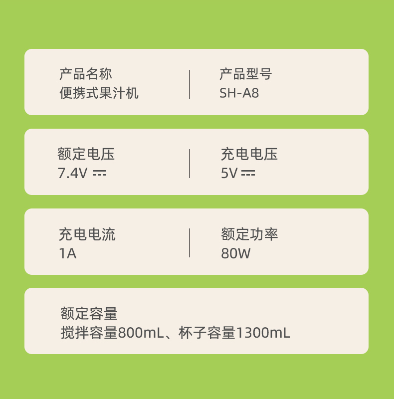 搅拌容量:800mL 杯子容量:1300mL 额定功率:80W 额定电压:7.4V 便携无线果汁机、锁住新鲜果味、潮饮随行 1300ml大容量、食品级接触用材质 双击启动操作简单、38叶精钢到头快速搅打 大容量电池长效续航、携带方便移动鲜榨 开盖断电安全放心榨、花式饮品DIY乐在其中 搅拌机头+外出便携盖子 包装方式:彩盒+网购包装