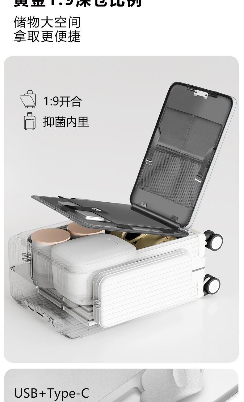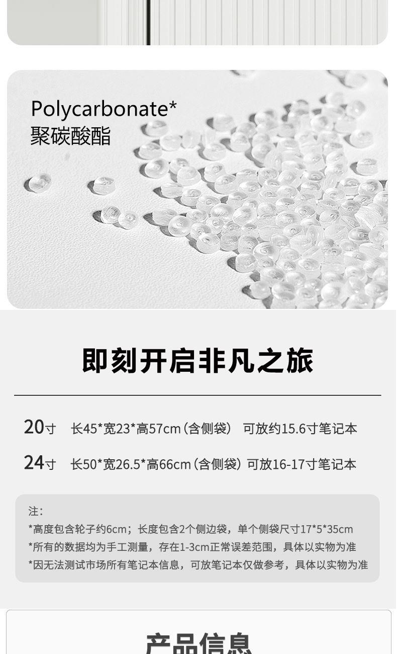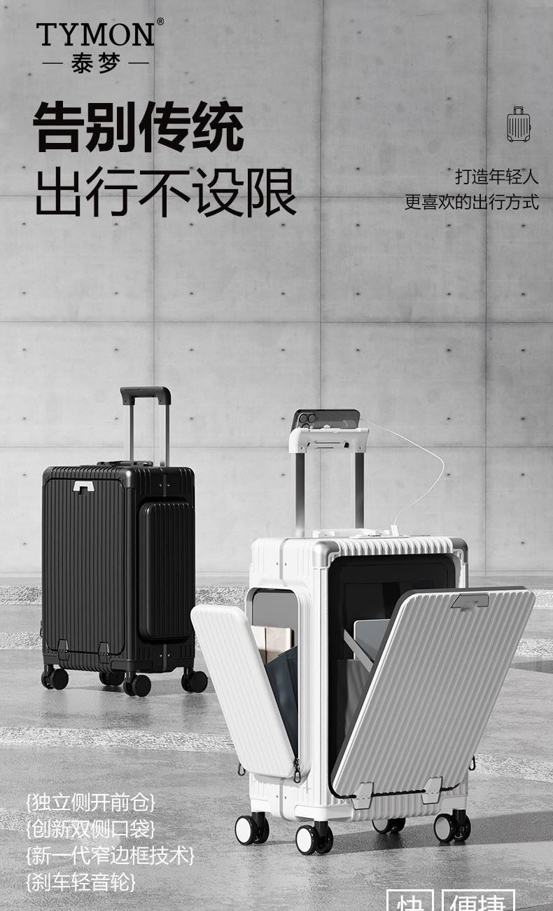 材质:聚碳酸酯(PC) 里料:涤纶 拉杆材质:全铝 尺寸:20英寸 颜色:黑色/白色//银色/紫色/粉色 货号:TM-1970 1、嵌入式前置独立电脑仓,滴答一下优雅出行; 2、外置USB+Type-C充电口,时刻能量满满; 3、手机支架,水杯支架,功能强大; 4、三把国际TSA海关锁,全球畅通无阻; 5、铆钉铝框中控闭合,内里干湿分离科学分区; 6、航空级合金拉杆,双排高弹力TPE刹车轮。 7、创新双侧口袋