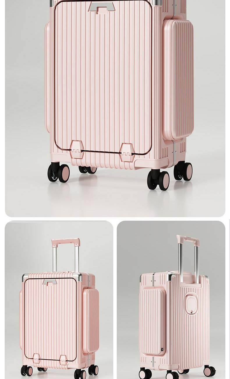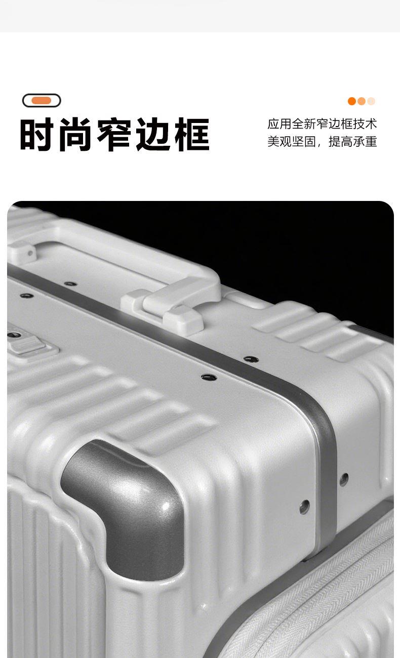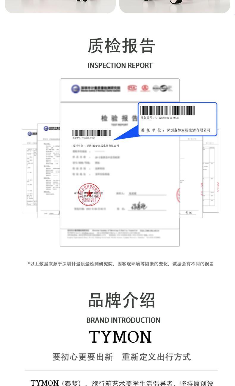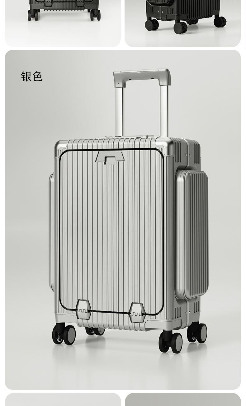 材质:聚碳酸酯(PC) 里料:涤纶 拉杆材质:全铝 尺寸:20英寸 颜色:黑色/白色//银色/紫色/粉色 货号:TM-1970 1、嵌入式前置独立电脑仓,滴答一下优雅出行; 2、外置USB+Type-C充电口,时刻能量满满; 3、手机支架,水杯支架,功能强大; 4、三把国际TSA海关锁,全球畅通无阻; 5、铆钉铝框中控闭合,内里干湿分离科学分区; 6、航空级合金拉杆,双排高弹力TPE刹车轮。 7、创新双侧口袋