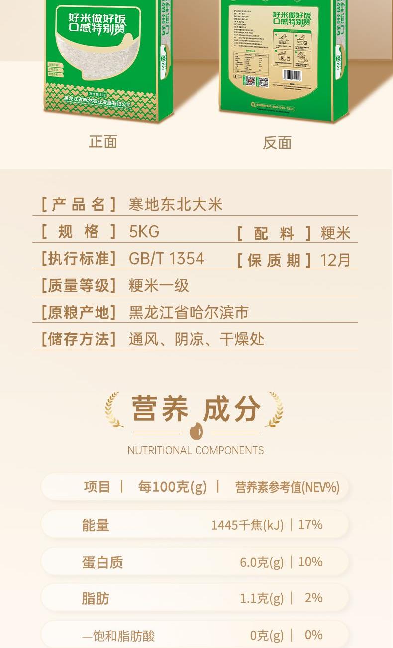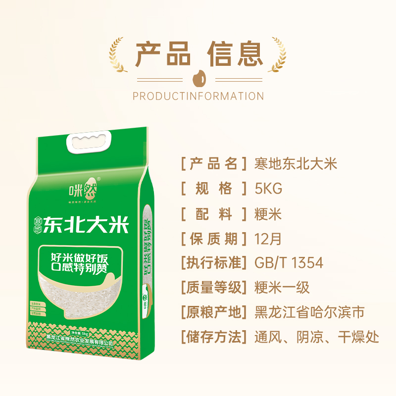 产 品 : 寒地-东北大米5kg 执行标准 : GB/T 1354 保 质 期 :12个月 产 地 :辽宁锦州 箱 规 :4*5kg